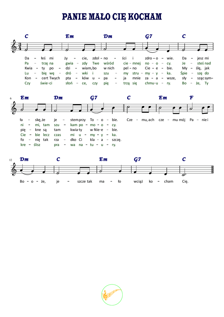 PANIE MAŁO CIĘ KOCHAM C Em 3 4 Da Pa Kwia Lu Kon Czy ła ni pię Cie fo kre skę, że mi, tam kne są bie lecz nię tak ślisz Dm Bo ży gwia dzi dró pta słoń o że, no wśród w nich szu pa pię ści cie pel my ja trzą i mnej no stru mnie się je szu tam czas rza pra stem przy kam po kwia ty mi u dko Ci wa na To mo w Nie my kla tu o o e y a u bie. cy. bie. ka. szczę. ry. Cze Em je szcze tak zdro no Cie my za chmu C C Da Je My Śpie sły Bo jesz mi steś nad ślę, jak szę do sząc sym że, Ty G7 C G7 cie, zdol zdy Twe wiam, bo wki i ków u ce, czy Dm 12 łeś mi trzę na ty po bię wę cert Twych świe ci Em 6 Dm ma o o e y a u wie. cy. bie. ka. wsze, ry. Em mu, ach F cze mu mój Pa nie i G7 ło C wciąż C ko cham Cię.