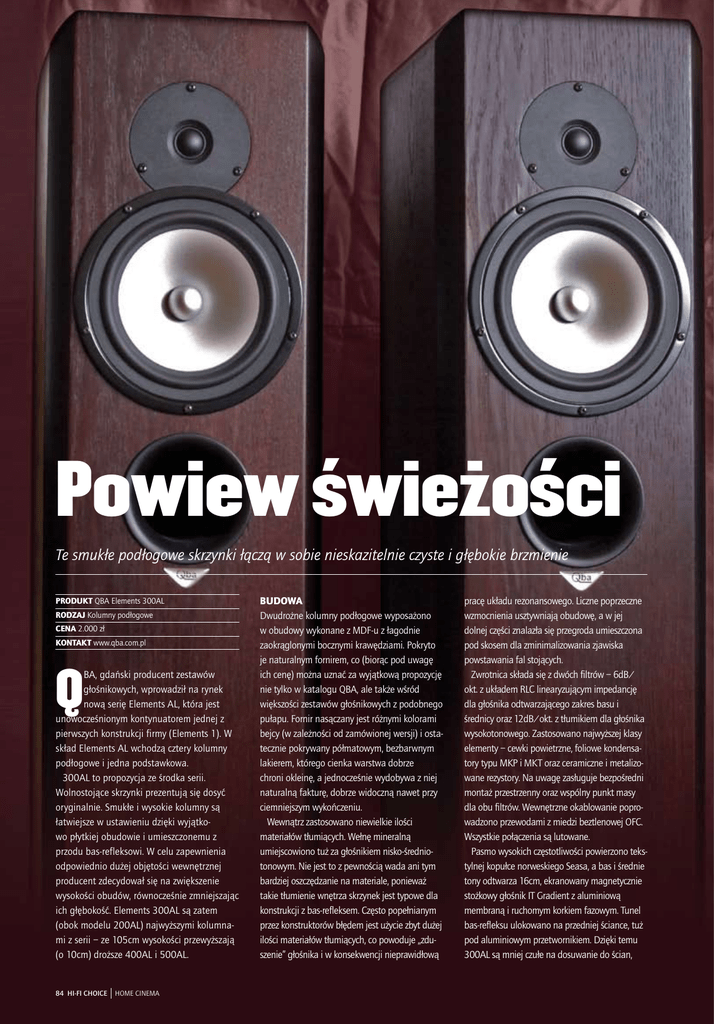 Powiew świeżości Te smukłe podłogowe skrzynki łączą w sobie nieskazitelnie czyste i głębokie brzmienie PRODUKT QBA Elements 300AL RODZAJ Kolumny podłogowe cena 2.000 zł kontakt www.qba.com.pl Q BA, gdański producent zestawów głośnikowych, wprowadził na rynek nową serię Elements AL, która jest unowocześnionym kontynuatorem jednej z pierwszych konstrukcji firmy (Elements 1). W skład Elements AL wchodzą cztery kolumny podłogowe i jedna podstawkowa. 300AL to propozycja ze środka serii. Wolnostojące skrzynki prezentują się dosyć oryginalnie. Smukłe i wysokie kolumny są łatwiejsze w ustawieniu dzięki wyjątkowo płytkiej obudowie i umieszczonemu z przodu bas-refleksowi. W celu zapewnienia odpowiednio dużej objętości wewnętrznej producent zdecydował się na zwiększenie wysokości obudów, równocześnie zmniejszając ich głębokość. Elements 300AL są zatem (obok modelu 200AL) najwyższymi kolumnami z serii – ze 105cm wysokości przewyższają (o 10cm) droższe 400AL i 500AL. 84 HI-FI CHOICE HOME CINEMA BUDOWA Dwudrożne kolumny podłogowe wyposażono w obudowy wykonane z MDF-u z łagodnie zaokrąglonymi bocznymi krawędziami. Pokryto je naturalnym fornirem, co (biorąc pod uwagę ich cenę) można uznać za wyjątkową propozycję nie tylko w katalogu QBA, ale także wśród większości zestawów głośnikowych z podobnego pułapu. Fornir nasączany jest różnymi kolorami bejcy (w zależności od zamówionej wersji) i ostatecznie pokrywany półmatowym, bezbarwnym lakierem, którego cienka warstwa dobrze chroni okleinę, a jednocześnie wydobywa z niej naturalną fakturę, dobrze widoczną nawet przy ciemniejszym wykończeniu. Wewnątrz zastosowano niewielkie ilości materiałów tłumiących. Wełnę mineralną umiejscowiono tuż za głośnikiem nisko-średniotonowym. Nie jest to z pewnością wada ani tym bardziej oszczędzanie na materiale, ponieważ takie tłumienie wnętrza skrzynek jest typowe dla konstrukcji z bas-refleksem. Często popełnianym przez konstruktorów błędem jest użycie zbyt dużej ilości materiałów tłumiących, co powoduje „zduszenie” głośnika i w konsekwencji nieprawidłową pracę układu rezonansowego. Liczne poprzeczne wzmocnienia usztywniają obudowę, a w jej dolnej części znalazła się przegroda umieszczona pod skosem dla zminimalizowania zjawiska powstawania fal stojących. Zwrotnica składa się z dwóch filtrów – 6dB/ okt. z układem RLC linearyzującym impedancję dla głośnika odtwarzającego zakres basu i średnicy oraz 12dB/okt. z tłumikiem dla głośnika wysokotonowego. Zastosowano najwyższej klasy elementy – cewki powietrzne, foliowe kondensatory typu MKP i MKT oraz ceramiczne i metalizowane rezystory. Na uwagę zasługuje bezpośredni montaż przestrzenny oraz wspólny punkt masy dla obu filtrów. Wewnętrzne okablowanie poprowadzono przewodami z miedzi beztlenowej OFC. Wszystkie połączenia są lutowane. Pasmo wysokich częstotliwości powierzono tekstylnej kopułce norweskiego Seasa, a bas i średnie tony odtwarza 16cm, ekranowany magnetycznie stożkowy głośnik IT Gradient z aluminiową membraną i ruchomym korkiem fazowym. Tunel bas-refleksu ulokowano na przedniej ściance, tuż pod aluminiowym przetwornikiem. Dzięki temu 300AL są mniej czułe na dosuwanie do ścian, Kolumny podłogowe QBA Elements 300AL [ Recenzja ] niż zestawy wyposażone w układy rezonansowe dmuchające do tyłu. Pozłacane gniazda głośnikowe są pojedyncze, ale za to akceptują wtyki bananowe i widełki. JAKOŚĆ DŹWIĘKU 300AL są kompatybilne z większością przyzwoitych budżetowych wzmacniaczy stereo. Podłączone do systemu ze średniej półki cenowej, nie obnażą swoich wad – w takim towarzystwie będą się czuły równie komfortowo, jeśli nie lepiej. Ich brzmienie jest uniwersalne i dobrze wyważone. Spoglądając na aluminiową membranę głośnika nisko-średniotonowego, spodziewaliśmy się nieco rozjaśnionego, sterylnego przekazu. Jednak późniejsze odsłuchy pokazały, że średnica jest dobrana proporcjonalnie do pozostałych zakresów. Czasami odnosiliśmy wrażenie, że przekazywane dźwięki w zakresie średnich tonów są delikatnie stonowane, a już na pewno nie przerysowane – można to uznać za zaletę, ponieważ jasno zrealizowane płyty nie będą tak dokuczliwe w przekazie. Tak czy inaczej środkowy zakres pasma zaprezentowany przez 300AL jest wyjątkowo neutralny, o czym mogliśmy się przekonać podczas odsłuchu płyty „Bosa” Anny Marii Jopek. Wokal artystki nie był nazbyt rozjaśniony, czego można było oczekiwać po konstrukcjach w tej cenie. Barwy miały nieco chłodniejsze, charakterystyczne dla tego albumu odcienie. Podłogowe QBA zachowały się bardzo dojrzale, dobrze zespalając górne rejestry z wyższą średnicą i ani przez chwilę nie dając się we znaki poprzez nadmierną ekspozycję sybilantów czy drobnych dźwięków, których na płycie „Bosa” przecież nie brakuje. Producentowi 300AL udało się prawidłowo zespolić bas z pozostałymi zakresami pasma. Pomimo tego, że schodzi on naprawdę nisko, nie odczuwa się braków w jego wyższych rejonach. Zdarza się, że przy projektowaniu budżetowych zestawów konstruktorzy często muszą iść na kompromis, „wyciągając” z nich nisko schodzący bas, który nie zawsze płynnie przechodzi w zakres średniotonowy, poprzez osłabienie jego wyższych partii, albo spłycając jego brzmienie w najniższych rejonach, zyskując nieco na lepszym wypełnieniu w miejscu połączenia ze średnicą. Słychać wyraźnie, że QBA osiągnęły złoty środek, a niskie tony przetwarzane przez aluminiowe głośniki zachowują pełny przekaz niezależnie od tego, z jaką głośnością przyjdzie im pracować (podczas odsłuchów 300AL udowodniły, że potrafią wystarczająco wypełnić dźwiękiem średniej wielkości pomieszczenie bez konieczności „Podłączone do systemu ze średniej półki cenowej