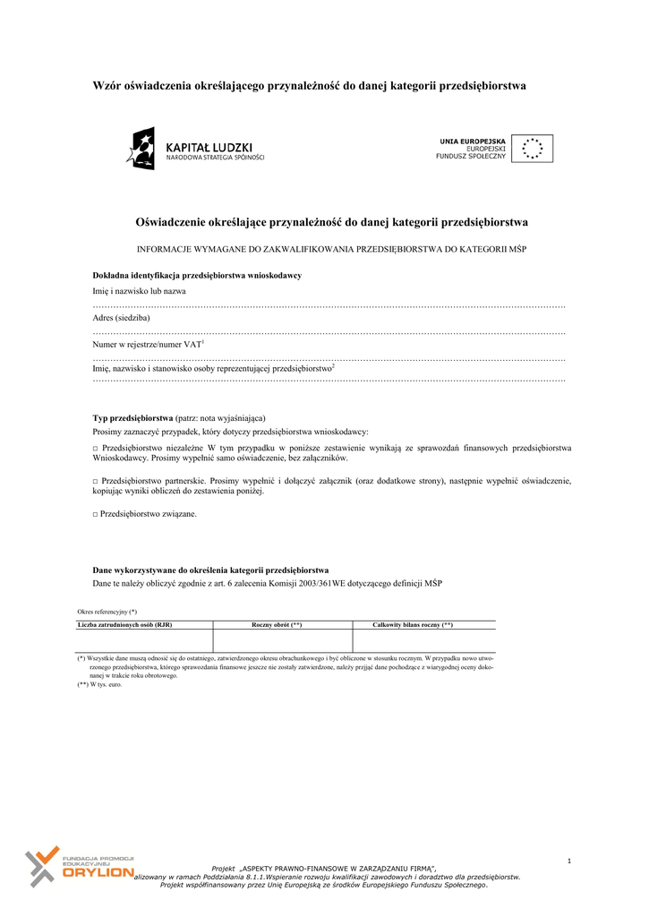 Wzór oświadczenia określającego przynależność do danej kategorii przedsiębiorstwa Oświadczenie określające przynależność do danej kategorii przedsiębiorstwa INFORMACJE WYMAGANE DO ZAKWALIFIKOWANIA PRZEDSIĘBIORSTWA DO KATEGORII MŚP Dokładna identyfikacja przedsiębiorstwa wnioskodawcy Imię i nazwisko lub nazwa ………………………………………………………………………………………………………………………………………………. Adres (siedziba) ………………………………………………………………………………………………………………………………………………. Numer w rejestrze/numer VAT1 ………………………………………………………………………………………………………………………………………………. Imię, nazwisko i stanowisko osoby reprezentującej przedsiębiorstwo2 ………………………………………………………………………………………………………………………………………………. Typ przedsiębiorstwa (patrz: nota wyjaśniająca) Prosimy zaznaczyć przypadek, który dotyczy przedsiębiorstwa wnioskodawcy: □ Przedsiębiorstwo niezależne W tym przypadku w poniższe zestawienie wynikają ze sprawozdań finansowych przedsiębiorstwa Wnioskodawcy. Prosimy wypełnić samo oświadczenie, bez załączników. □ Przedsiębiorstwo partnerskie. Prosimy wypełnić i dołączyć załącznik (oraz dodatkowe strony), następnie wypełnić oświadczenie, kopiując wyniki obliczeń do zestawienia poniżej. □ Przedsiębiorstwo związane. Dane wykorzystywane do określenia kategorii przedsiębiorstwa Dane te należy obliczyć zgodnie z art. 6 zalecenia Komisji 2003/361WE dotyczącego definicji MŚP Okres referencyjny (*) Liczba zatrudnionych osób (RJR) Roczny obrót (**) Całkowity bilans roczny (**) (*) Wszystkie dane muszą odnosić się do ostatniego, zatwierdzonego okresu obrachunkowego i być obliczone w stosunku rocznym. W przypadku nowo utworzonego przedsiębiorstwa, którego sprawozdania finansowe jeszcze nie zostały zatwierdzone, należy przjjąć dane pochodzące z wiarygodnej oceny dokonanej w trakcie roku obrotowego. (**) W tys. euro. 1 Projekt „ASPEKTY PRAWNO-FINANSOWE W ZARZĄDZANIU FIRMĄ”, realizowany w ramach Poddziałania 8.1.1.Wspieranie rozwoju kwalifikacji zawodowych i doradztwo dla przedsiębiorstw. Projekt współfinansowany przez Unię Europejską ze środków Europejskiego Funduszu Społecznego. Uwaga W porównaniu z poprzednim okresem obrachunkowym nastąpiła zmiana danych, która może spowodować zmianę kategorii przedsiębiorstwa wnioskodawcy (mikro, małe, średnie lub duże przedsiębiorstwo). □ Nie □ Tak (w tym przypadku prosimy wypełnić i dołączyć oświadczenie dotyczące poprzedniego okresu obrachunkowego)3 Podpis Nazwisko i stanowisko osoby podpisującej, upoważnionej do reprezentowania przedsiębiorstwa: ………………………………………………………………………………………………………………………………………………. Oświadczam, że dane zawarte w niniejszym oświadczeniu i załącznikach do niego są zgodne ze stanem faktycznym. Sporządzono w ………………………………………………………………………………………………………………………………………………. Podpis 1) Ustala Państwo Członkowskie w zależności od swoich potrzeb. 2) Prezes, dyrektor naczelny lub osoba na równorzędnym stanowisku. 3) Definicja. Art. 4 ust. 2 załącznika do zalecenia Komisji 2003/361/WE. 2 Projekt „ASPEKTY PRAWNO-FINANSOWE W ZARZĄDZANIU FIRMĄ”, realizowany w ramach Poddziałania 8.1.1.Wspieranie rozwoju kwalifikacji zawodowych i doradztwo dla przedsiębiorstw. Projekt współfinansowany przez Unię Europejską ze środków Europejskiego Funduszu Społecznego. NOTA WYJAŚNIAJĄCA DOTYCZĄCA TYPÓW PRZEDSIĘBIORSTW BRANYCH POD UWAGĘ PRZY OBLICZANIU LICZBY OSÓB ZATRUDNIONYCH I DANYCH FINANSOWYCH I. TYP PRZEDSIĘBIORSTWA Definicja MŚP1 rozróżnia trzy typy przedsiębiorstwa, w zależności od ich związków z innymi przedsiębiorstwami pod względem udziału w kapitale, prawach głosu lub wywierania dominującego wpływu 2. Typ 1: Przedsiębiorstwo niezależne Jak dotąd jest to najczęściej spotykany typ przedsiębiorstwa. Oznacza on każde przedsiębiorstwo, którego nie można zaliczyć do żadnego z dwóch pozostałych typów (przedsiębiorstwo partnerskie lub związane). Przedsiębiorstwo wnioskodawcy jest niezależne, jeśli: - nie posiada 25% lub więcej udziałów lub głosów3 w innym przedsiębiorstwie, - inne przedsiębiorstwa lub podmioty publiczne nie posiadają, samodzielnie lub wspólnie z jednym lub kilkoma przedsiębiorstwami związanymi lub podmiotami publicznymi 25% lub więcej3 udziałów lub głosów w przedsiębiorstwie wnioskodawcy, poza niektórymi wyjątkami4, - nie sporządza skonsolidowanych sprawozdań finansowych i nie jest ujęte w sprawozdaniach finansowych przedsiębiorstwa, które sporządza sprawozdania skonsolidowane, a zatem nie jest przedsiębiorstwem związanym 5. Typ 2: Przedsiębiorstwo partnerskie Ten typ oznacza sytuację przedsiębiorstw, które ustanowiły poważne partnerstwa finansowe z innymi przedsiębiorstwami, ale żadne z przedsiębiorstw pozostających w tym związku nie sprawuje skutecznej, bezpośredniej lub pośredniej kontroli nad drugim. Przedsiębiorstwa partnerskie to przedsiębiorstwa, które nie są ani niezależne, ani ze sobą związane. - Przedsiębiorstwo wnioskodawcy jest partnerem drugiego przedsiębiorstwa, jeśli: posiada 25% lub więcej udziałów lub głosów w drugim przedsiębiorstwie lub drugie przedsiębiorstwo posiada 25% lub więcej udziałów lub głosów w przedsiębiorstwie wnioskodawcy, przedsiębiorstwa nie są przedsiębiorstwami związanymi, w poniższym rozumieniu, co oz