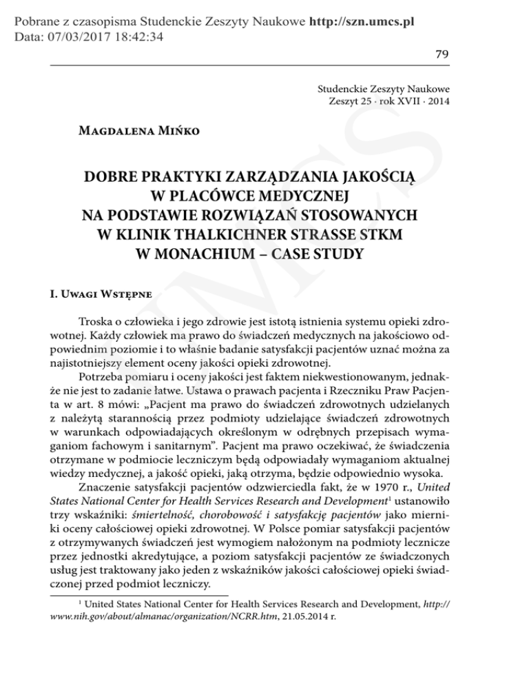 Pobrane z czasopisma Studenckie Zeszyty Naukowe http://szn.umcs.pl Data: 07/03/2017 18:42:34 7 Studenckie Zeszyty Naukowe Zeszyt 25 ∙ rok XVII ∙ 2014 CS Magdalena Mińko U M DOBRE PRAKTYKI ZARZąDZANIA JAKOŚCIą W PLACÓWCE MEDYCZNEJ NA PODSTAWIE ROZWIąZAń STOSOWANYCH W KLINIK THALKICHNER STRASSE STKM W MONACHIUM – CASE STUDY I. Uwagi Wstępne Troska o człowieka i jego zdrowie jest istotą istnienia systemu opieki zdrowotnej. Każdy człowiek ma prawo do świadczeń medycznych na jakościowo odpowiednim poziomie i to właśnie badanie satysfakcji pacjentów uznać można za najistotniejszy element oceny jakości opieki zdrowotnej. Potrzeba pomiaru i oceny jakości jest faktem niekwestionowanym, jednakże nie jest to zadanie łatwe. Ustawa o prawach pacjenta i Rzeczniku Praw Pacjenta w art. 8 mówi: „Pacjent ma prawo do świadczeń zdrowotnych udzielanych z należytą starannością przez podmioty udzielające świadczeń zdrowotnych w warunkach odpowiadających określonym w odrębnych przepisach wymaganiom fachowym i sanitarnym”. Pacjent ma prawo oczekiwać, że świadczenia otrzymane w podmiocie leczniczym będą odpowiadały wymaganiom aktualnej wiedzy medycznej, a jakość opieki, jaką otrzyma, będzie odpowiednio wysoka. Znaczenie satysfakcji pacjentów odzwierciedla fakt, że w 1970 r., United States National Center for Health Services Research and Development1 ustanowiło trzy wskaźniki: śmiertelność, chorobowość i satysfakcję pacjentów jako mierniki oceny całościowej opieki zdrowotnej. W Polsce pomiar satysfakcji pacjentów z otrzymywanych świadczeń jest wymogiem nałożonym na podmioty lecznicze przez jednostki akredytujące, a poziom satysfakcji pacjentów ze świadczonych usług jest traktowany jako jeden z wskaźników jakości całościowej opieki świadczonej przed podmiot leczniczy. 1 United States National Center for Health Services Research and Development, http:// www.nih.gov/about/almanac/organization/NCRR.htm, 21.05.2014 r. Pobrane z czasopisma Studenckie Zeszyty Naukowe http://szn.umcs.pl Data: 07/03/2017 18:42:34 0 U M CS Znaczenie, jakie przywiązuje się do działań mających podnieść poziom satysfakcji pacjenta wynika z faktu, że pacjent usatysfakcjonowany z opieki zachowuje się inaczej niż pacjent niezadowolony. Szereg badań opinii publicznej („Diagnoza społeczna” 2009, Eurobarometr, badania CSIOZ) wskazuje, że Polacy, uznają ochronę zdrowia za jeden z dwóch najistotniejszych problemów społecznych, jednocześnie oceniając ją jako gorszą niż w innych krajach Europy2. Satysfakcja pacjenta stanowi wypadkową między odczuciami pacjentów co do jakości otrzymywanej opieki a ich oczekiwaniami. Postrzeganie przez pacjenta jakości otrzymanej opieki, czyli jego satysfakcja, mogą zdecydowanie różnić się od tej postrzeganej przez profesjonalistów. Pacjent ocenia system na podstawie własnych, subiektywnych kryteriów. To właśnie pacjent – jego potrzeby, oczekiwania i pragnienia powinny być w centrum uwagi personelu medycznego – jest on główną postacią procesu. Tym samum ma prawo do współdecydowania o przebiegu procesu leczenia i pielęgnowania, ma też prawo do oceny i decydowania o jakości tej opieki. II. Przykłady Dobrych Praktyk Zarządzania Jakością Stosowanych w Niemieckiej Placówce Staedtisches Klinikum Muenchen to największe publiczne konsorcjum medyczne zaopatrujące w świadczenia medyczne niemiecki land Bawarię. W skład StKM wchodzi pięć specjalistycznych szpitali: Klinikum Bogenhausen, Klinikum Harlaching, Klinikum Neuperlach, Klinikum Schwabing oraz Klinikum halkirchner Strasse. Ponadto do konsorcjum należą: Akademie – zespół kształcący i doszkalający obecnych oraz potencjalnych pracowników, Blutspendedienst (centrum krwiodawstwa i krwiolecznictwa), Facility Management (Centrum Zaopatrzenia). Kompleks medycznych placówek objęty jest wewnętrznym systemem jakości. W ramach niniejszego systemu funkcjonuje system do zgłaszania przez pacjentów skarg, zażaleń oraz pochwał. Ponadto istnieje elektroniczny system zgłaszania błędów medycznych przez personel placówek. Dodatkowo przeprowadzany jest cykliczny audyt wewnętrzny, a także realizowany jest coroczny projekt ogólnej oceny placówek na podstawie specjalnie przygotowanych kwestionariuszy ankiety skierowanych do pacjentów, personelu oraz interesariuszy3. 2 Rynek pracy i wykluczenie społeczne, http://www.diagnoza.com/pliki/raporty_tematyczne/Rynek_pracy_i_wykluczenie_spoleczne.pdf, 21.05.2014 r. 3 Kennzahlen im Beschwerdemanagement – Hilfreich für Prozess und Ergebnis?, http:// www.klinikum-muenchen.de/ileadmin/01-Unternehmen/03-Qualitaet/Forum-2009/Workshops/Reipka_Kennzahlen_Beschw_091118.pdf 21.05.2014 r. Pobrane z czasopisma Studenckie Zeszyty Naukowe http://szn.umcs.pl Data: 07/03/2017 18:42:34 1 III. Uwagi Końcowe U M CS Podsumowując należy podkreślić, iż proces poprawy jakości w placówkach medycznych jest niezwykle istotnych elementem zarządzania podmiotem medycznym. Umożliwia on podniesienie bezpieczeństwa medycznego, poprawę satysfakcji pacjentów, a tym samym przyczynia się do wzrostu prestiżu placówki medycznej. Jest ona jest jedną z najtrudniejszych do zarządzania form przedsiębiorstwa, przede wszystkim ze względu na swoją specyikę działania. Oparta jest ona na nieograniczoności potrzeb zdrowotnych pacjentów przy stałym postępie metod diagnostycznych i leczniczych4. Wyniki niniejszego badania pokazują, iż implementacja w polskiej praktyce gospodarczej dobrych praktyk zarządzania jakością, stosowanych w niemieckiej klinice, może przynieść wymierne korzyści. GOOD QUALITY MANAGEMENT PRACTICES IN THE MEDICAL FACILITIES BASED ON THE SOLUTIONS FROM KLINIK THALKICHNER STRASSE STKM IN MUNICH – CASE STUDY he implementation the quality management in medical facilities became more and more popular. he managers notice the beneits and independently of the diiculty of the 