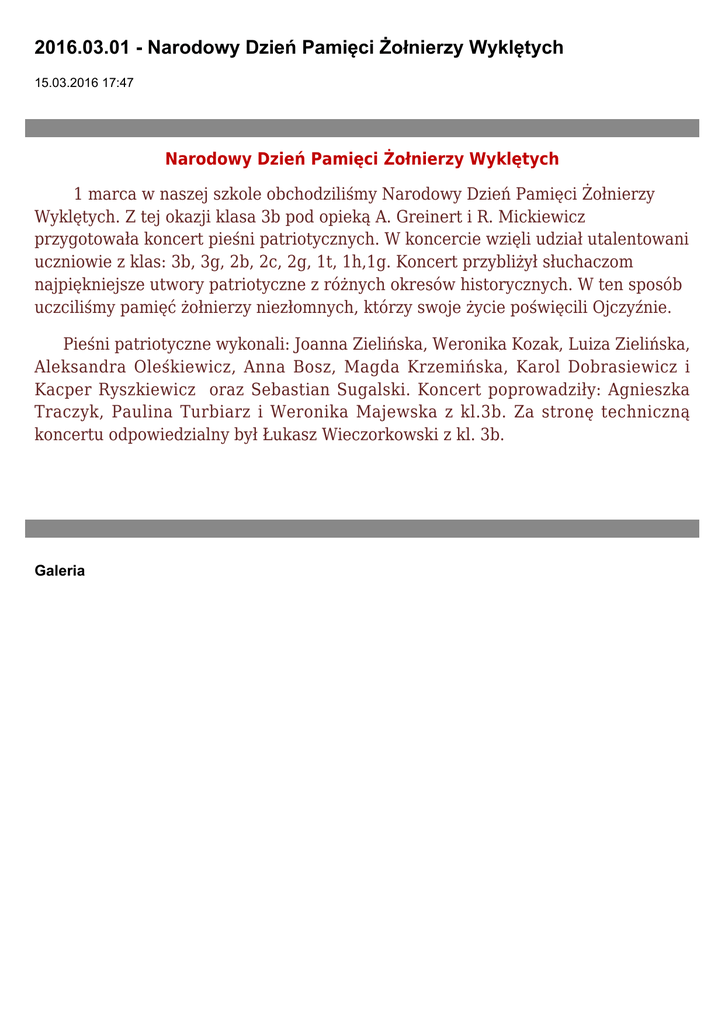2016.03.01 - Narodowy Dzień Pamięci Żołnierzy Wyklętych 15.03.2016 17:47 Narodowy Dzień Pamięci Żołnierzy Wyklętych 1 marca w naszej szkole obchodziliśmy Narodowy Dzień Pamięci Żołnierzy Wyklętych. Z tej okazji klasa 3b pod opieką A. Greinert i R. Mickiewicz przygotowała koncert pieśni patriotycznych. W koncercie wzięli udział utalentowani uczniowie z klas: 3b, 3g, 2b, 2c, 2g, 1t, 1h,1g. Koncert przybliżył słuchaczom najpiękniejsze utwory patriotyczne z różnych okresów historycznych. W ten sposób uczciliśmy pamięć żołnierzy niezłomnych, którzy swoje życie poświęcili Ojczyźnie. Pieśni patriotyczne wykonali: Joanna Zielińska, Weronika Kozak, Luiza Zielińska, Aleksandra Oleśkiewicz, Anna Bosz, Magda Krzemińska, Karol Dobrasiewicz i Kacper Ryszkiewicz oraz Sebastian Sugalski. Koncert poprowadziły: Agnieszka Traczyk, Paulina Turbiarz i Weronika Majewska z kl.3b. Za stronę techniczną koncertu odpowiedzialny był Łukasz Wieczorkowski z kl. 3b. Galeria