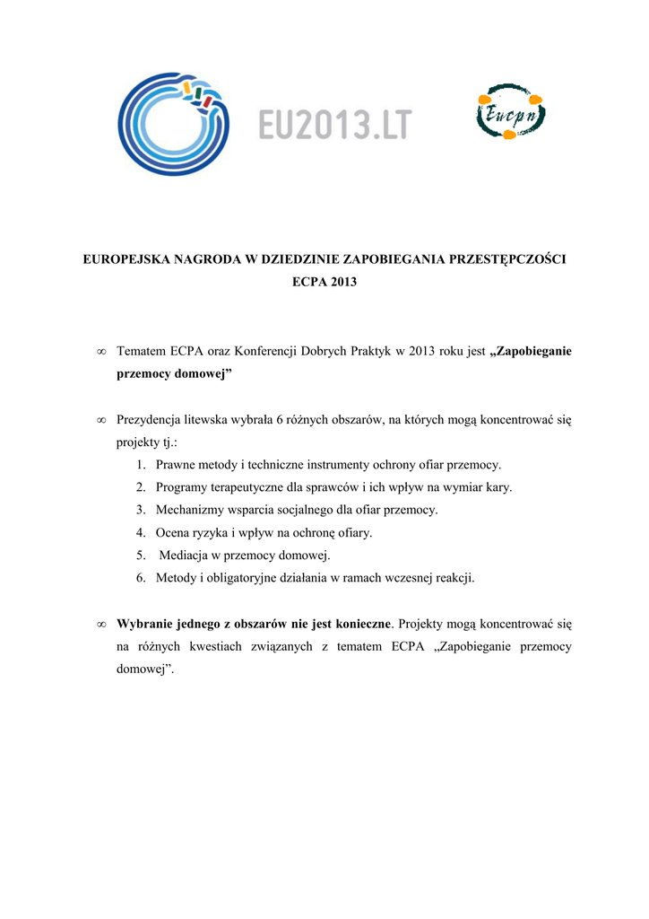EUROPEJSKA NAGRODA W DZIEDZINIE ZAPOBIEGANIA PRZESTĘPCZOŚCI ECPA 2013 • Tematem ECPA oraz Konferencji Dobrych Praktyk w 2013 roku jest „Zapobieganie przemocy domowej” • Prezydencja litewska wybrała 6 różnych obszarów, na których mogą koncentrować się projekty tj.: 1. Prawne metody i techniczne instrumenty ochrony ofiar przemocy. 2. Programy terapeutyczne dla sprawców i ich wpływ na wymiar kary. 3. Mechanizmy wsparcia socjalnego dla ofiar przemocy. 4. Ocena ryzyka i wpływ na ochronę ofiary. 5. Mediacja w przemocy domowej. 6. Metody i obligatoryjne działania w ramach wczesnej reakcji. • Wybranie jednego z obszarów nie jest konieczne. Projekty mogą koncentrować się na różnych kwestiach związanych z tematem ECPA „Zapobieganie przemocy domowej”.