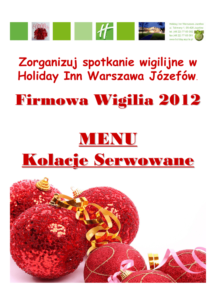 Zorganizuj spotkanie wigilijne w Holiday Inn Warszawa Józefów. Firmowa Wigilia 2012 MENU Kolacje Serwowane Menu święta 2012 Menu Serwowane I Consome z borowików z łazankami i świeŜym koperkiem Grillowane kotleciki wieprzowe z zapiekanką ziemniaczaną, warzywami i sosem grzybowym Domowy sernik z sosem malinowym Cena 95 PLN netto od osoby Menu Serwowane II Marynowane śledzie ze śmietaną, cebulką i tartym jabłkiem Pieczona kaczka z sosem Ŝurawinowym, jabłkami i pieczonymi ziemniakami Sernik z makiem i bakaliami Cena 125 PLN netto od osoby Menu Serwowane III Carpaccio z łososia marynowanego w koprze, czerwonym pieprzu z sałatą z rukoli i buraków Zupa krem z borowików ze śmietaną SmaŜony filet z karpia z sosem piernikowym, gotowanymi brokułami i ziemniakami Torcik makowy z sosem waniliowym Cena 145 PLN netto od osoby Menu Serwowane IV Tatar ze śledzia z marynowanymi burakami, piernikiem i miodem Consome z leśnych grzybów z makaronem Grillowane kotleciki cielęce z puree selerowym, warzywami i sosem rozmarynowym Mus z ciemnej czekolady z koniakiem i wiśniami Cena 155 PLN netto od osoby Menu Serwowane V Pasztet domowy z sosem Ŝurawinowym i marynowanymi grzybami Borowiki w śmietanie z czosnkiem i koprem Barszcz czerwony z pasztecikiem SmaŜony sandacz z borowikami, duszoną kapustą i ziemniakami Torcik piernikowy Cena 165 PLN netto od osoby Menu Serwowane VI przystawki Carpaccio z łososia marynowanego w koprze i czerwonym pieprzu z sałatką z rukoli i buraków lub Pasztet domowy z sosem Ŝurawinowym i marynowanymi grzybami zupy Consome z leśnych grzybów z makaronem lub Barszcz czerwony z malinami i pasztecikiem dania główne Pieczona kaczka z sosem pomarańczowym i czerwoną kapustą lub Grillowane polędwiczki wieprzowe z puree pietruszkowym i sosem z zielonego pieprzu lub SmaŜony sandacz z borowikami, duszoną kapustą i ziemniakami desery Torcik piernikowy z sosem waniliowym lub Mus czekoladowy z koniakiem Cena 165 PLN (menu do 30 osób) Menu VII przystawki w stół Śledzie w śmietanie z tartym jabłkiem i cebulą Śledzie w oleju z cebulą i marynowanymi grzybami Pasztet domowy z sosem Ŝurawinowym i marynowanymi grzybami Sałaka z wędzoną piersią z kaczki i pomarańczami Carpaccio z łososia marynowanego w koprze i czerwonym pieprzu zupy serwowane Consome z leśnych grzybów z makaronem lub Rosół z kaczki z naleśnikami dania główne serwowane Pieczona kaczka z sosem pomarańczowym i czerwoną kapustą i ziemniakami lub SmaŜony sandacz z borowikami, duszoną kapustą i ziemniakami desery na bufecie obok Piernik z bakaliami Tarta śliwkowa Torcik makowy z sosem waniliowy Cena 135 PLN (8 do 30 osób) bufet po kolacji serwowanej pieczywo, masło Wybór pasztetów z marynowanymi grzybami Mięsa pieczone z sosem Ŝurawinowym Śledzie w oleju z cebulą i marynowanymi grzybami Sałatka ze szpinaku z serem pleśniowym i pomarańczami zupa (do wyboru jedna z rodzaju) Barszcz czerwony z pasztecikiem Consosme z leśnych grzybów Rosół z kaczki śurek z jajkiem i kiełbasą Zupa gulaszowa dania ciepłe Biały strogonow wołowy z wódka i pieczarkami Bigos staropolski z suszonymi grzybami desery Talerz serów z winogronami i krakersami Piernik z bakaliami Cena 65 PLN od osoby – bufet uzupełniany 2 godziny Menu Cena za osobę* Cena za osobę – kolacja + bufet* Menu I 145 pln 210 pln Menu II 175 pln 240 pln Menu III 200 pln 265 pln Menu IV 205 pln 270 pln Menu V 220 pln 285 pln Menu VI** 215 pln 280 pln Menu VII** 190 pln 255 pln *Podane ceny są cenami netto przy minimum 8 osobach ** Menu max dla 30 osób
