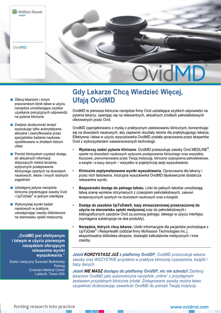Oferuj lekarzom i innym pracownikom klinik łatwe w użyciu narzędzie umożliwiające szybkie uzyskanie precyzyjnych odpowiedzi na pytania kliniczne Zwiększ skuteczność terapii wyszukując tylko autorytatywne, aktualne i zweryfikowane przez specjalistów badania naukowe, opublikowane w źródłach którym ufasz Pomóż klinicystom uzyskać dostęp do aktualnych informacji dotyczących metod leczenia, wytycznych postepowania klinicznego opartych na dowodach naukowych, leków i innych istotnych zagadnień Gdy Lekarze Chcą Wiedzieć Więcej, Ufają OvidMD OvidMD to pierwsze kliniczne narzędzie firmy Ovid udzielające szybkich odpowiedzi na pytania lekarzy, opierając się na relewantnych, aktualnych źródłach pełnotekstowych oferowanych przez Ovid. OvidMD zaprojektowano z myślą o praktycznym zastosowaniu klinicznym, koncentrując się na dowodach naukowych, aby zapewnić rezultaty istotne dla praktykującego lekarza. Efektywna i łatwa w użyciu wyszukiwarka OvidMD została opracowana przez ekspertów Ovid z wykorzystaniem zaawansowanych technologii. • Wystarczy zadać pytanie kliniczne. OvidMD przeszukuje zasoby Ovid MEDLINE®, oparte na dowodach naukowych wytyczne postepowania klinicznego oraz wszystkie, kluczowe, prenumerowane przez Twoją instytucję, kliniczne czasopisma pełnotekstowe, e-książki i e-bazy danych – wszystko w pojedyńczej sesji wyszukiwania. • Klinicznie zoptymalizowane wyniki wyszukiwania. Opracowana dla lekarzy i przez nich testowana, intuicyjna wyszukiwrka OvidMD błyskawicznie dostarcza relewantne wyniki. Udostępnij jedyne narzędzie kliniczne prezentujące zasoby Ovid ® i UpToDate w jednym interfejsie • Bezpośredni dostęp do pełnego tekstu. Linki do pełnych tekstów umożliwiają łatwą ocenę wyników otrzymanych z czasopism pełnotekstowych, zaleceń terapeutycznych opartych na dowodach naukowych oraz e-książek. Wykorzystaj wyniki badań naukowych w praktyce, udostępniając zasoby biblioteczne na stanowisku opieki medycznej • Dostęp do zasobów UpToDate®, bazy streszczeniowej przeznaczonej do użycia na stanowisku opieki medycznej oraz do pełnotekstowych i bibliograficznych zasobów Ovid za pomocą jednego, łatwego w użyciu interfejsu (wymagana subskrypcja na oba produkty). • Narzędzia, których chcą lekarze. Ulotki informacyjne dla pacjentów pochodzące z UpToDate® i RelayHealth (oddział firmy McKesson Technologies Inc.), eksportowalna biblioteka obrazów, dziesiątki kalkulatorów medycznych i inne zasoby. „OvidMD jest efektywnym i łatwym w użyciu pierwszym narzędziem oferującym relewantne wyniki wyszukiwania.” Doktor medycyny Surender Bodhireddy Patolog Covenant Medical Center Lubbock, Texas USA Jeżeli KORZYSTASZ JUŻ z platformy OvidSP, OvidMD przeszukuje własne zasoby oraz WSZYSTKIE przydatne w praktyce klinicznej czasopisma, książki i bazy danych. Jeżeli NIE MASZ dostępu do platformy OvidSP, nic nie szkodzi! Zaoferuj lekarzom OvidMD jako autonomiczne narzędzie „online” z przystępnym zestawem przydatnych klinicznie źródeł. Zintegrowane zasoby można łatwo uzupełniać dostosowując zawartość OvidMD do potrzeb Twojej instytucji. Lekarze po prostu wpisują pytania kliniczne w polu wyszukiwania. Natychmiast wyświetlana jest kompletna lista relewantnych, precyzyjnych wyników wyszukiwania, które zawieraja linki do pełnych tekstów, użyteczne kalkulatory, grafiki, które można eksportować a także inne zasoby. Siedziba główna firmy Ovid 333 7th Avenue New York, NY 10001 (646) 674-6300 (800) 343-0064 E-mail: [email protected] Wykorzystaj informacje naukowe w praktyce Zapewnij lekarzom dostęp „online” do potrzebnych odpowiedzi z zaufanych źródeł informacji klinicznych. • Ovid MEDLINE® to najważniejsza, kompleksowa, biomedyczna baza danych, oferująca dostęp do ponad 15 milionów artykułów publikowanych w periodykach związanych z biomedycyną i opieką zdrowotną. • Evidence-Based Guidelines - oparte na dowodach naukowych wytyczne postepowania klinicznego łączące najlepsze dostępne dowody związane z diagnozą, zarządzaniem leczeniem i lekami, redagowane przez lekarzy i aktualizowane co kwartał. • Zestaw reprezentujących główne specjalizacje medyczne czasopism LWW Current Opinion, cenionych za komentarze ekspertów i artykuły przeglądowe. • Tysiące ulotek informacyjnych dla pacjentów pochodzących z baz danych: UpToDate® i RelayHealth (oddział firmy McKesson Technologies Inc.). • A to Z Drug Facts - kompletne informacje dotyczące leków: dawkowanie, skutki uboczne, wskazania i zastosowania terapeutyczne. • PLUS adekwatne klinicznie zasoby pełnotekstowe – czasopisma, publikacje książkowe i bazy danych, na których polegasz zawsze gdy przeszukujesz OvidSP. Dodatkowe biura handlowe: Alphen aan den Rijn, Holandia Pekin, Chiny Berlin, Niemcy Bolognia, Włochy Hongkong Kuala Lumpur, Malezja Londyn, Wielka Brytania Madryt, Hiszpania New Delhi, Indie Norwood, MA, USA Paryż, Francja Sandy, UT, USA Sofia, Bułgaria Sztokholm, Szwecja Sydney, Australia Tokio, Japonia Villa Alemana, Chile Warszawa, Polska Aby uzyskać pełne informacje dotyczące kontaktów i lokalizacji odwiedź witrynę www.ovid.com/contact Dodatkowe informacje Aby dowidzieć się więcej na temat dostępu do narzędzia OvidMD dla Twojej instytucji, skontaktuj się z przedstawicielem firmy Ovid, korzystając z adresu [email protected]. Odwiedź również witrynę www.ovidmd.com aby uzyskać więcej informacji, przyłączyć się do naszej listy mailingowej i skorzystać z 30-dniowego dostępu testowego. Obejrzyj prezentację w witrynie wydrukowano na papierze z recyklingu