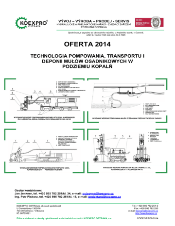 VÝVOJ – VÝROBA – PRODEJ - SERVIS HYDRAULICKÉ A PNEUMATICKÉ NÁŘADÍ - ZVEDACÍ ZAŘÍZENÍ POTRUBNÍ DOPRAVA Společnost je zapsána do obchodního rejstříku u Krajského soudu v Ostravě, oddíl B, vložka 1025 ode dne 23.5.1995 OFERTA 2014 TECHNOLOGIA POMPOWANIA, TRANSPORTU I DEPONII MUŁÓW OSADNIKOWYCH W PODZIEMIU KOPALŃ 2. 3. 4. 5. 6. DOPŁYW WODY CIŚNIENIOWEJ KLAROWADŁO HYDRAULICZNE ČH-1 WĘŻE POŁĄCZAJĄCE PŁYTA STEROWANIA ĄGREGAT HYDRAULICZNY HAK-100/125 (HAK-100/280) 7. AGREGAT POMPUJĄCY SZEREGU KTX (80,100,125) 8. JEDNOSTKA NOŚNA I JEZDNA 1. 2. 3. 4. 5. 6. 7. 1. WYKONANIE WZOROWE POMPOWANIA MUŁÓW POMPĄ KTX 125 NH, KLAROWADŁEM ČH-1 I JEDNOSTKĄ JEZDNĄ Z AGREGATEM HYDRAULICZNYM HAK-100/125 WYKONANIE WZOROWE POMPOWANIA MUŁÓW ZE ZBIORNIKA PRZECHWYTNEGO KOP. DARKOV 1. HYDRAULICZNE KLAROWADŁO ČH-1 2. AGREGAT POMPUJĄCY KTX125 NH 3. PRZERÓBKA ŁADOWARKA KOŁOWA 4. WĘŻE POŁĄCZAJĄCE 1. HYDRAULICZNE KLAROWADŁO ČH-1 2. AGREGAT POMPUJĄCY KTX125 NH 3. PRZERÓBKA ŁADOWARKI ELEKTROHYDRAULICZNEJ NA PODWOZIU GĄSIENICOWYMWĘŻE POŁĄCZAJĄCE 4. WĘŻE POŁĄCZAJĄCE WYKONANIE WZOROWE POMPOWANIA MUŁÓW Z POMPĄ KTX 125NH, KLAROWADŁEM ČHH-1 I PODWOZIEM HAUSHERR POMPA KTX-125 NH KOLEJKA PODWIESZONA WÓZKI NOŚNE KOSZ SSĄCY WĄŻ SSĄCY WĘŻE HYDRAULICZNE NAPĘDU POMPY WODA DOŁOWA MUŁY SEDYMENTOWANE WYKONANIE WZOROWE POMPOWANIA MUŁÓW Z POMPĄ KTX 125, KLAROWADŁEM ĆH-1 I PODWOZIEM PPN-1S Osoby kontaktowe: Jan Jenkner, tel. +420 595 782 251/kl. 34, e-mail: [email protected] Ing. Petr Piskorz, tel. +420 595 782 251/kl. 15, e-mail: [email protected] KOEXPRO OSTRAVA, akciová společnost U Cementárny 1303/16 703 00 Ostrava - Vítkovice IČ: 60793121 Etika a slušnost – zásady uplatňované v obchodních vztazích KOEXPRO OSTRAVA, a.s. Tel.: +420 595 782 251-2 Fax: +420 595 782 250 e-mail: [email protected] http://www.koexpro.cz CODE/VPS/08/2014 VÝVOJ – VÝROBA – PRODEJ - SERVIS HYDRAULICKÉ A PNEUMATICKÉ NÁŘADÍ - ZVEDACÍ ZAŘÍZENÍ POTRUBNÍ DOPRAVA Společnost je zapsána do obchodního rejstříku u Krajského soudu v Ostravě, oddíl B, vložka 1025 ode dne 23.5.1995 TECHNOLOGIE POMPOWANIA TRANSPORTU I MAGAZYNOWANIA MUŁÓW OSADOWYCH W PODZIEMIU KOPALŃ 1. Wstęp Współczesne technologie pompowania zbiorników i chodników osadnikowych (dalej CHO), są z większej części założone na wykorzystaniu górniczych ładowarek (kolejowych, lub oponowych) dla odstawy mułów w wózki, kiedy po sedymentacji mułów w wózkach i usunięciu wody, dochodzi do wywrotki mułów z wózka w bunkier, itp. Niniejsze technologie kładą duże wymogi i pracochłonność podczas odstawy mułów z CHO.i są uważany za jedną z najstarszych i najmniej produktywnych metod i najtrudniejszych prac w podziemiu kopalń. 2. Wniosek rozwiązania Spółka akcyjna KOEXPRO OSTRAVA we współpracy z kopalniami OKD w ciągu ostatních lat rozwiązała i następnie sprawdziła kilka odmian pomowania mechanicznego, transportu i magazynowania, prz. likwidacji mułów w kopalni. a) Mechanizowane ładowanie sedymentowanych mułów ze zbiorowego zbiornika sedymetacyjnego umieszczonego przed OCH na wejściu (wymiary około 30 m x 4 m x 3 m) i urządzenie do czyszczenia zbiornika ZČJ w wózki. Po sedymentacji mułów i usunięciu wody są wózki ze sedimentem wywracane do bunkra skipowego. Niniejsza technologia – patrz załącznik nr. 1 jest instalowana na 5. Poziomie kopalni Důl Paskov, zakład Staříč, ponad 5 lat. b) Wypompowanie mułów ze zbiorników osadnikowych, lub OCH do pompy podawającej umieszczonej poza OCH, która muły transportuje w miejsce przeznaczenia, tzn.: b1) do zamkniętych wyrobisk (zrobów) poza tamę (możliwy transport z „poziomu wlotowego“ na poziom wylotowy do 200 m szybem pionowym lub odwiertem) – patrz załącznik nr. 2; b2) do urobku – do zbiornika lub na taśmociąg – niniejsza technologia zawiera dotrzymanie wysokiej dyscypliny technicznej podczas pompowania mułów, wraz z wypracowaniem dokumentacji technologicznej pompowania sedymentów , wraz z ustaleniem zasad, jak sedyment w bunkier transportować – patrz załącznik nr. 3; b3) do rurociągu transportowego służącego do transportu „wody z sedymentem“ do OCH – patrz załącznik nr. 4, č. 5 i nr. 6; Technologia według punktu b1) jest w OKD, a.s. w ruchu na Dole ČSA – zakład Lazy i Dole Darkov. Na zakładzie Lazy jest w ruchu taśma technologiczna – częściowo patrz. Załącznik nr. 2 od roku 2000. Ze załączników nr. 7 i 8 widoczne osiągnięcie parametrów wydajnościowych niniejszej technologii. Tymczasowo jest niniejsza technologia stosowana na 9. Poziomie zakładu Lazy w pomocniczej stacji pompowania, gdzie było zamienione podwozie i agregat ładowarki Hausser, jako źródła medium ruchowego i unośnik agregatu pompującego KTX 80 i klarowadła ČH1, lokomotywą z pompą, która przepympowywuje muły do agregatu pompującego CŽS 01 (KTX 200) i następnie rurociągiem DN 150 szybem nr. 5 na 8. poziom i do starych zamkniętych wyrobisk – patrz załącznik nr. 2. KOEXPRO OSTRAVA, akciová společnost U Cementárny 1303/16 703 00 Ostrava - Vítkovice IČ: 60793121 Etika a slušnost – zásady uplatňované v obchodních vztazích KOEXPRO OSTRAVA, a.s. Tel.: +420 595 782 251-2 Fax: +420 595 782 250 e-mail: [email protected] http://www.koexpro.cz CODE/VPS/08/2014 VÝVOJ – VÝROBA – PRODEJ - SERVIS HYDRAULICKÉ A PNEUMATICKÉ NÁŘADÍ - ZVEDACÍ ZAŘÍZENÍ POTRUBNÍ DOPRAVA Společnost je zapsána do obchodního rejstříku u Krajského soudu v Ostravě, oddíl B, vložkataśma 1025 odetechnologiczna dne 23.5.1995 Na Důl Karviná – zakład Doubrava była instalowana dla pompowania i transport mułów do bunkra węglowego – patrz załącznik nr. 3 – wideo – www.koexpro.cz, do ściągnięcia – Pompowanie i transport mułów z chodników osadnikowych do urobku na kopalniach OKD, a.s. Taśma technologiczna była zestawiona z (szczeg
