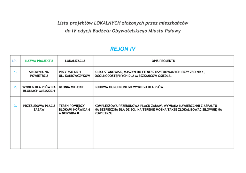 Lista projektów LOKALNYCH złożonych przez mieszkańców do IV edycji Budżetu Obywatelskiego Miasta Puławy REJON IV LP. NAZWA PROJEKTU LOKALIZACJA OPIS PROJEKTU 1. SIŁOWNIA NA POWIETRZU PRZY ZSO NR 1 UL. KANIOWCZYKÓW KILKA STANOWISK, MASZYN DO FITNESS USYTUOWANYCH PRZY ZSO NR 1, OGÓLNODOSTĘPNYCH DLA MIESZKAŃCÓW OSIEDLA. 2. WYBIEG DLA PSÓW NA BŁONIACH MIEJSKICH BŁONIA MIEJSKIE BUDOWA OGRODZONEGO WYBIEGU DLA PSÓW. 3. PRZEBUDOWA PLACU ZABAW TEREN POMIĘDZY BLOKAMI NORWIDA 6 A NORWIDA 8 KOMPLEKSOWA PRZEBUDOWA PLACU ZABAW, WYMIANA NAWIERZCHNI Z ASFALTU NA BEZPIECZNĄ DLA DZIECI. NA TERENIE MOŻNA TAKŻE ZLOKALIZOWAĆ SIŁOWNIĘ NA POWIETRZU. 4. OSŁONA TRZEPAKA BEZPOŚREDNIE SĄSIEDZTWO TRZEPAKA USYTUOWANEGO PRZY ŚMIETNIKU POMIĘDZY BLOKAMI PRZY UL. KANIOWCZYKÓW 8, KANIOWCZYKÓW 10, KANIOWCZYKÓW 6, NORWIDA 5 I NORWIDA 7 OBSADZENIE TERENU WOKÓŁ TRZEPAKA WYSOKIMI KRZEWAMI (NP.15 SZTUK TUI SZMARAGD O WYSOKOŚCI OK 220/240 CM). MONTAŻ ŁAWEK ORAZ NASADZENIE KRZEWÓW OZDOBNYCH UL. SŁOWACKIEGO 2880/1 2876/1 6. SIŁOWNIA DLA DOROSŁYCH UL. SŁOWACKIEGO 2880/1 2876/1 WYPOSAŻENIE TERENU W NARZĘDZIA DO SIŁOWNI DLA OSÓB DOROSŁYCH. 7. BUDOWA PLACU ZABAW DLA DZIECI I SIŁOWNIA NAPOWIETRZNA (I ETAP) RÓG ULICY GÓRNEJ I KOŁODZIEJA, DZIAŁKA 5566/7 BUDOWA PLACU ZABAW DLA DZIECI I SIŁOWNI NAPOWIETRZNEJ – I ETAP TJ. - PRZYGOTOWANIE PROJEKTU - PRZYGOTOWANIE NAWIERZCHNI PLACU ZABAW, OGRODZENIE NASADZENIA, ŁAWKI. 5. DOTYCZY ZAGOSPODAROWANIA DZIAŁEK UL. SŁOWACKIEGO. USTAWIENIE 2 SZTUK ŁAWEK ORAZ NASADZENIE OZDOBNYCH KRZEWÓW. 8. 9. 10. 11. TOALETA OGÓLNODOSTĘPNA MODERNIZACJA TRAKTU SPACEROWEGO WZDŁUŻ OGRODZENIA SZKOŁY PODSTAWOWEJ NR 1 I ŚRODOWISKOWEGO DOMU SAMOPOMOCY BEZPIECZNY WYBIEG DLA PSÓW NA BLONIACH WIATA PRZYSTANKOWA – CHMIELOWSKIEGO TEREN BYŁEGO DWORCA PKS BUDOWA OGÓLNODOSTEPNEJ TOALETY, ZLOKALIZOWANEJ NA TERENIE BYŁEGO DWORCA PKS WZDŁUŻ OGRODZENIA SP 1 I ŚRODOWISKOWEGO DOMU SAMOPOMOCY PRZY UL. MICKIEWICZA 2A I WDŁUŻ BLOKÓW KANIOWCZYKÓW 3B MODERNIZACJA ZNISZCZONEJ I KRZYWEJ NAWIERZCHNI TRAKTU PIESZEGO ORAZ NIEZBĘDNEGO OŚWIETLENIA. BŁONIA MIEJSKIE PRZY UL. SŁOWACKIEGO CHMIELOWSKIEGO – PRZYSTANEK KOMUNIKACJI MIEJSKIEJ W KIERUNKU MIASTA NR 239 STWORZENIE OGRODZONEJ BEZPIECZNEJ PRZESTRZENI DO WYPROWADZANIA PSÓW. MIEJSCE BEZPIECZNE Z ZASTOSOWANIEM ATRAKCJI DLA ZWIERZĄT. NA PRZYSTANKU NALEŻY USTAWIĆ WĄSKĄ WIATĘ PRZYSTANKOWĄ.