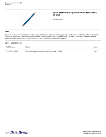 Data wydruku: 07-03-2017 strona 1/1 Rysik szafirowy do przycinania włókna Ideal 45-358 0704110-45-358 OPIS Rysiki służą do usuwania nadmiaru włókna przy zakańczaniu złącz. Zmniejszają prawdopodobieństwo uszkodzenia ferruli. Końcówki rysików są wykonane z naturalnego diamentu lub syntetycznego szafiru i posiadają kąt cięcia 60°. Delikatne dotknięcie włókna wystającego ponad końcówkę ferruli powoduje cięcie. Narzędzie ma kształt długopisu. CENY I DOSTĘPNOŚĆ Kod towaru Nazwa 0704110-45-358 Rysik szafirowy do przycinania włókna Ideal 45-358 Jedn. szt. http://www.dataoptics.pl [email protected] Powered by TCPDF (www.tcpdf.org)