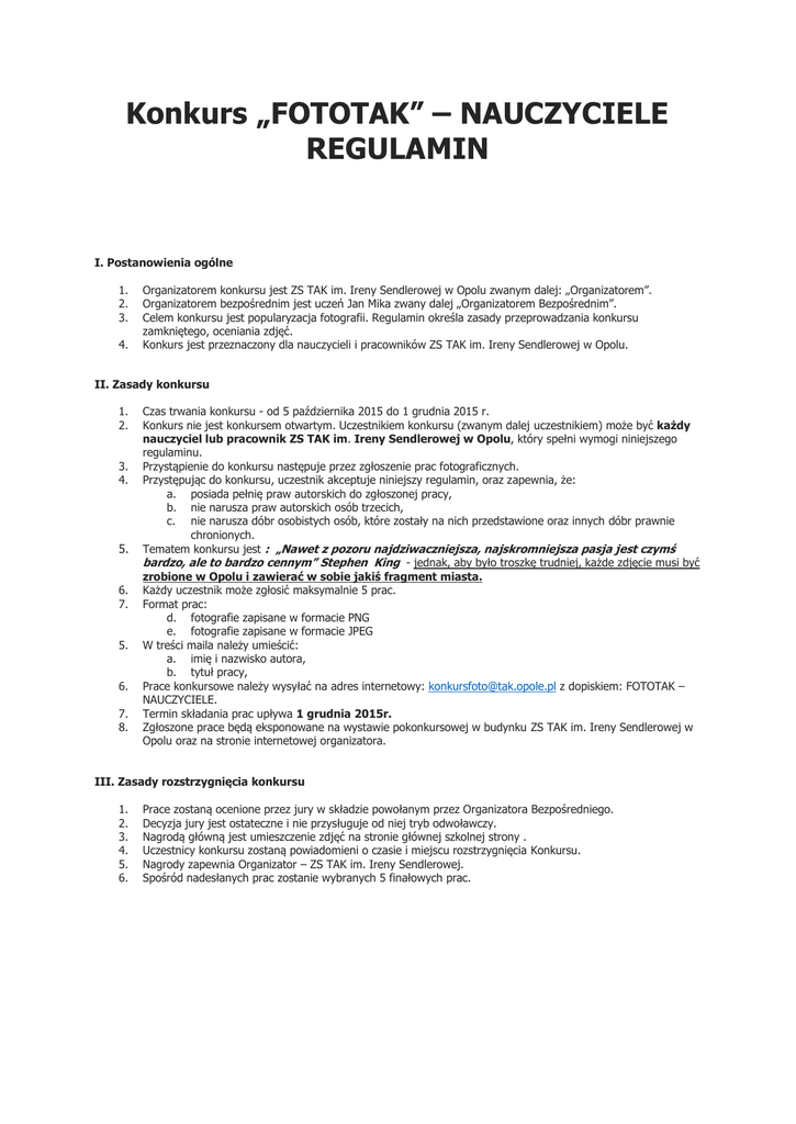 Konkurs „FOTOTAK” – NAUCZYCIELE REGULAMIN I. Postanowienia ogólne 1. 2. 3. 4. Organizatorem konkursu jest ZS TAK im. Ireny Sendlerowej w Opolu zwanym dalej: „Organizatorem”. Organizatorem bezpośrednim jest uczeń Jan Mika zwany dalej „Organizatorem Bezpośrednim”. Celem konkursu jest popularyzacja fotografii. Regulamin określa zasady przeprowadzania konkursu zamkniętego, oceniania zdjęć. Konkurs jest przeznaczony dla nauczycieli i pracowników ZS TAK im. Ireny Sendlerowej w Opolu. II. Zasady konkursu 1. 2. 3. 4. 5. 6. 7. 5. 6. 7. 8. Czas trwania konkursu - od 5 października 2015 do 1 grudnia 2015 r. Konkurs nie jest konkursem otwartym. Uczestnikiem konkursu (zwanym dalej uczestnikiem) może być każdy nauczyciel lub pracownik ZS TAK im. Ireny Sendlerowej w Opolu, który spełni wymogi niniejszego regulaminu. Przystąpienie do konkursu następuje przez zgłoszenie prac fotograficznych. Przystępując do konkursu, uczestnik akceptuje niniejszy regulamin, oraz zapewnia, że: a. posiada pełnię praw autorskich do zgłoszonej pracy, b. nie narusza praw autorskich osób trzecich, c. nie narusza dóbr osobistych osób, które zostały na nich przedstawione oraz innych dóbr prawnie chronionych. Tematem konkursu jest : „Nawet z pozoru najdziwaczniejsza, najskromniejsza pasja jest czymś bardzo, ale to bardzo cennym” Stephen King - jednak, aby było troszkę trudniej, każde zdjęcie musi być zrobione w Opolu i zawierać w sobie jakiś fragment miasta. Każdy uczestnik może zgłosić maksymalnie 5 prac. Format prac: d. fotografie zapisane w formacie PNG e. fotografie zapisane w formacie JPEG W treści maila należy umieścić: a. imię i nazwisko autora, b. tytuł pracy, Prace konkursowe należy wysyłać na adres internetowy: [email protected] z dopiskiem: FOTOTAK – NAUCZYCIELE. Termin składania prac upływa 1 grudnia 2015r. Zgłoszone prace będą eksponowane na wystawie pokonkursowej w budynku ZS TAK im. Ireny Sendlerowej w Opolu oraz na stronie internetowej organizatora. III. Zasady rozstrzygnięcia konkursu 1. 2. 3. 4. 5. 6. Prace zostaną ocenione przez jury w składzie powołanym przez Organizatora Bezpośredniego. Decyzja jury jest ostateczne i nie przysługuje od niej tryb odwoławczy. Nagrodą główną jest umieszczenie zdjęć na stronie głównej szkolnej strony . Uczestnicy konkursu zostaną powiadomieni o czasie i miejscu rozstrzygnięcia Konkursu. Nagrody zapewnia Organizator – ZS TAK im. Ireny Sendlerowej. Spośród nadesłanych prac zostanie wybranych 5 finałowych prac.