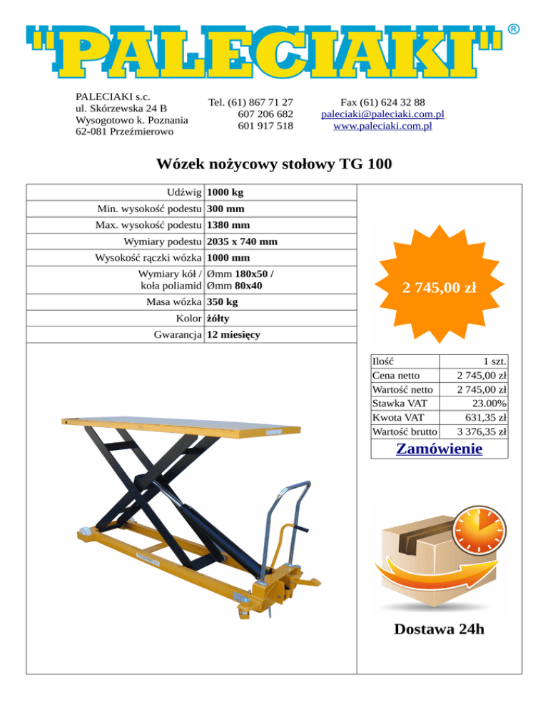 PALECIAKI s.c. ul. Skórzewska 24 B Wysogotowo k. Poznania 62-081 Przeźmierowo Tel. (61) 867 71 27 607 206 682 601 917 518 Fax (61) 624 32 88 [email protected] www.paleciaki.com.pl Wózek nożycowy stołowy TG 100 Udźwig 1000 kg Min. wysokość podestu 300 mm Max. wysokość podestu 1380 mm Wymiary podestu 2035 x 740 mm Wysokość rączki wózka 1000 mm Wymiary kół / Ømm 180x50 / koła poliamid Ømm 80x40 2 745,00 zł Masa wózka 350 kg Kolor żółty Gwarancja 12 miesięcy Ilość Cena netto Wartość netto Stawka VAT Kwota VAT Wartość brutto 1 szt. 2 745,00 zł 2 745,00 zł 23.00% 631,35 zł 3 376,35 zł Zamówienie Dostawa 24h PALECIAKI s.c. ul. Skórzewska 24 B Wysogotowo k. Poznania 62-081 Przeźmierowo Tel. (61) 867 71 27 607 206 682 601 917 518 Fax (61) 624 32 88 [email protected] www.paleciaki.com.pl Wózek nożycowy stołowy TG 100