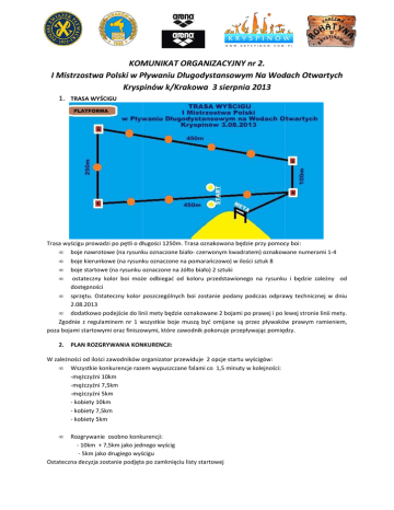 KOMUNIKAT ORGANIZACYJNY nr 2. I Mistrzostwa Polski w Pływaniu Długodystansowym Na Wodach Otwartych Kryspinów k/Krakowa 3 sierpnia 2013 1. TRASA WYŚCIGU Trasa wyścigu prowadzi po pętli o długości 1250m. Trasa oznakowana będzie przy pomocy boi: • boje nawrotowe (na rysunku oznaczone białobiało czerwonym kwadratem) oznakowane numerami 1-4 1 • boje kierunkowe (na rysunku oznaczone na pomarańczowo) w ilości sztuk 8 • boje startowe (na rysunku oznaczone na żółto biało) 2 sztuki • ostateczny kolor boi może odbiegać od koloru przedstawionego na rysunku i będzie zależny od dostępności • sprzętu. Ostateczny kolor poszczególnych boi zostanie podany podczas odprawy technicznej w dniu 2.08.2013 • dodatkowo podejście do linii mety będzie oznakowane oznakowane 2 bojami po prawej i po lewej stronie linii mety. Zgodnie z regulaminem nr 1 wszystkie boje muszą być omijane są przez pływaków prawym ramieniem, poza bojami startowymi oraz finiszowymi, które zawodnik pokonuje przepływając pomiędzy. 2. PLAN ROZGRYWANIA KONKURENCJI: W zależności od ilości zawodników organizator przewiduje 2 opcje startu wyścigów: • Wszystkie konkurencje razem wypuszczane falami co 1,5 minuty w kolejności: -mężczyźni 10km -mężczyźni 7,5km -mężczyźni 5km - kobiety 10km - kobiety 7,5km - kobiety 5km • Rozgrywanie osobno konkurencji: - 10km + 7,5km jako jednego wyścig - 5km jako drugiego wyścigu Ostateczna decyzja zostanie podjęta po zamknięciu listy startowej 3. MAPKA ZALEWU 4. ZABEZPIECZENIE WYŚCIGU Wyścig zabezpieczony będzie przez: • 1 jednostka motorowa RIB 1, na pokładzie lekarz, dwóch płetwonurków, kierownik zabezpieczenia, sternik • 1 jednostka motorowa RIB 2, na pokładzie ratownik, sternik • 1 jednostka motorowa dla sędziego głównego+ ratownik i sternik • 1 jednostka motorowa sędziowsko- ewakuacyjna, na pokładzie sędzia + ratownik i sternik (jednostka sędziowska, która w przypadku konieczności podjęcia zawodnika z wody na ląd funkcjonuje jako jednostka ewakuacyjna) • Rowerki wodne w ilości sztuk 4, przy każdej boi na pokładzie sędzia. • 12 kajaków rozstawionych na trasie, w każdym kajaku ratownik wyposażony w boję SP lub pas węgorz. • Dwa zespoły karetek pogotowia na starcie zawodów oraz na wysokości platformy żywieniowej. W skład osobowy zabezpieczenia maratonu wchodzą: • Kierownik zabezpieczenia • 22 ratowników ( 8 w łodziach motorowych, 12 w kajakach, 2 na linii mety) • Lekarz zawodów • Jedną , dwu osobową ekipę nurkową. • Dwa zespoły Pogotowani Ratunkowego 5. RAMOWY PROGRAM ZAWODÓW: piątek, 2 sierpnia 2013 • • • Biuro zawodów (Karczma Rohatyna) czynne w godzinach 17:00 – 20:00 Obowiązkowa odprawa kierowników ekip w Biurze zawodów 19:00 (Obecność na odprawie technicznej jest OBOWIĄZKOWA. Nieobecność na odprawie może skutkować nałożeniem kary regulaminowej w wysokości 100,00zł Możliwość przeprowadzenia treningu w godz. 17:00 – 19:00 sobota, 3 sierpnia 2013 • • • • • • • • • • • 8:00 Otwarcie biura zawodów 8:30 – 9:30 Rozgrzewka dla zawodników 9:45 Odprawa techniczna dla zawodników 9:55 Oficjalne otwarcie Mistrzostw 10:00 Start pierwszej konkurencji Mistrzostw Polski w Pływaniu Długodystansowym na Wodach Otwartych 13:00 Przewidywane zakończenie rywalizacji Mistrzostw Polski w Pływaniu Długodystansowym na Wodach Otwartych 13:30 Start XXIV Krakowskiego maratonu Pływackiego dla Amatorów 16:00 Zakończenie rywalizacji XXIV Krakowskiego maratonu Pływackiego dla Amatorów 16:15 Rozpoczęcie ceremonii dekoracji zwycięzców I Mistrzostw Polski w Pływaniu Długodystansowym na Wodach Otwartych oraz XXIV Krakowskiego Maratonu Pływackiego 17:00 Zakończenie zawodów Organizatorzy zastrzegają sobie prawo do korekty programu czasowego zawodów 6. ZAKWATEROWANIE I WYŻYWIENIE: Informacje ukażą się 9 lipca 2013 w komunikacie dotyczącym tylko zakwaterowania i wyżywienia. 7. INFORMACJE TECHNICZNE: • W celu wezwania pomocy zawodnik musi obrócić się na plecy i unieść w górę rękę z zamkniętą dłonią. • Procedura dyskwalifikacyjna jest zgodna z przepisami FINA, obowiązuje żółta oraz czerwona flaga. • Jeśli zawodnik zostanie zdyskwalifikowany musi natychmiast wyjść z wody. • Tyczka żywieniowa musi mieć wymiary zgodne z przepisami FINA tj. maksymalna długość przy rozciągnięciu to 5m, na końcu tyczki może znajdować się flaga w rozmiarach 30x20cm. • Jeśli wyścig zostanie przerwany a zawodnicy pokonali więcej niż ¾ długości trasy wówczas o końcowej klasyfikacji decyduje kolejność w momencie przerwania wyścigu. Jeśli zawodnicy pokonali mniej niż ¾ trasy wówczas wyścig uznaje się za nierozegrany i zawodnicy muszą rozpocząć rywalizację od nowa w najbliższym terminie wyznaczonym przez komisję sędziowską. • Transpondery dla zawodników będą zakładane na kostkę. W gestii zawodnika jest oklejenie go taśmą tak aby nie zgubić transpondera podczas wyścigu. • Jeśli zawodnik zgubi transponder to musi pobrać nowy z rowerka sędziowskiego. Każdy z rowerków będzie wyposażony w rezerwowy transponder. Ukończenie wyścigu bez transpondera będzie skutkowało dyskwalifikacją zawodnika. • Zawodnicy pokonujący dystans w sposób niedozwolony, w tym poza wyznaczoną trasą zostaną zdyskwalifikowani. • Wszystkie kwestie sporne dotyczące Mistrzostw Polski rozstrzyga komisja odwoławcza w składzie: Naczelnik Zawodów, Sędzia Główny oraz Dyrektor Wyścigu. • Przed startem pozwala się zawodnikowi na pokrycie ciała środkami zabezpieczającymi ciepłotę organizmu, jednak nie wcześniej niż po oznaczeniu numerem startowym w biurze zawodów. • Zawodnicy nie mogą korzystać w trakcie wyścigu z płetw, łapek, gumowych rękawic oraz innego sprzętu pomocniczego z wyłączeniem okularków pływackich. • • Zawodnik może mieć założone 2 czepki z zaznaczeniem że cz