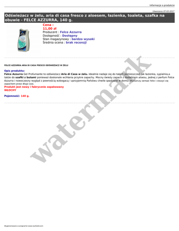 Informacje o produkcie Utworzono 07-03-2017 Odświeżacz w żelu, aria di casa fresco z aloesem, łazienka, toaleta, szafka na obuwie - FELCE AZZURRA, 140 g. Cena : 11,00 zł Producent : Felce Azzurra Dostępność : Dostępny Stan magazynowy : bardzo wysoki Średnia ocena : brak recenzji er m ar k FELCE AZZURRA ARIA DI CASA FRESCO ODŚWIEŻACZ W ŻELU Opis produktu: Felce Azzurra Gel Profumante to odświeżacz Aria di Casa w żelu. Idealnie nadaje się do takich pomieszczeń jak łazienka, sypialnia,a także do szafki z butami ponieważ doskonale wchłania przykre zapachy. Mocny świeży zapach z dodatkiem aloesu, jednej z perfum Felce Azzurra i nowoczesny wygląd z pewnością wzbogacą i uprzyjemnią Państwu chwile spędzone w domu. Wystarczy zerwać folie i cieszyć się zapachem przez długi czas. Produkt jest nowy i fabrycznie zapakowany WŁOCHY w at Pojemność: 140 g. Wygenerowano w programie www.oscGold.com