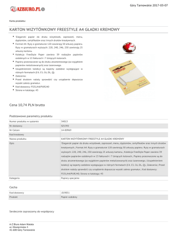 Góry Tarnowskie 2017-03-07 Karta produktu: KARTON WIZYTÓWKOWY FREESTYLE A4 GŁADKI KREMOWY 'Elegancki papier do druku wizytówek, zaproszeń, menu, dyplomów, certyfikatów oraz innych druków kreatywnych. Format A4. Ryzy o gramaturze 120 zawierają 50 arkuszy papieru. Ryzy w gramaturach wyższych: 220, 240, 246, 250 zawierają 25 arkuszy kartonu. Kolekcja FreeStyle Paper zawiera 39 rodzajów papierów ozdobnych w 13 fakturach i 7 lśniących kolorach. Papiery przeznaczone są do druku atramentowego (za wyjątkiem papierów metalizowanych) oraz laserowego. Uzupełnieniem kolekcji są koperty ozdobne występujące w różnych formatach (C4, C5, C6, DL, Q). Zalecenia: Przed drukiem należy sprawdzić czy urządzenie dopuszcza wysoki zakres gramatur. Kod dostawcy: FS31/A4/PUR240 Strona w katalogu: 43 Cena 10,74 PLN brutto Podstawowe parametry produktu Numer produktu w systemie 34013 Nr dostawcy SZ1392 Nr Celcen 14-00969 Kod kreskowy Nazwa produktu KARTON WIZYTÓWKOWY FREESTYLE A4 GŁADKI KREMOWY Opis 'Elegancki papier do druku wizytówek, zaproszeń, menu, dyplomów, certyfikatów oraz innych druków kreatywnych.; Format A4. Ryzy o gramaturze 120 zawierają 50 arkuszy papieru. Ryzy w gramaturach wyższych: 220, 240, 246, 250 zawierają 25 arkuszy kartonu.; Kolekcja FreeStyle Paper zawiera 39 rodzajów papierów ozdobnych w 13 fakturach i 7 lśniących kolorach.; Papiery przeznaczone są do druku atramentowego (za wyjątkiem papierów metalizowanych) oraz laserowego.; Uzupełnieniem kolekcji są koperty ozdobne występujące w różnych formatach (C4, C5, C6, DL, Q).; Zalecenia:; Przed drukiem należy sprawdzić czy urządzenie dopuszcza wysoki zakres gramatur.; Kod dostawcy: FS31/A4/PUR240; Strona w katalogu: 43 Kategoria Papiery specjalne Cecha Kod dostawcy .019051 Produkt Papier ozdobny Serdecznie zapraszamy do współpracy A-Z Biuro Adam Watoła ul. Oświęcimska 3 41-600 Góry Tarnowskie Góry Tarnowskie 2017-03-07 A-Z Biuro Adam Watoła zespół. A-Z Biuro Adam Watoła ul. Oświęcimska 3 41-600 Góry Tarnowskie