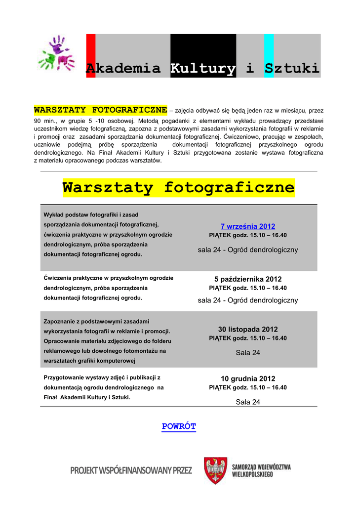 Akademia Kultury i Sztuki WARSZTATY FOTOGRAFICZNE – zajęcia odbywać się będą jeden raz w miesiącu, przez 90 min., w grupie 5 -10 osobowej. Metodą pogadanki z elementami wykładu prowadzący przedstawi uczestnikom wiedzę fotograficzną, zapozna z podstawowymi zasadami wykorzystania fotografii w reklamie i promocji oraz zasadami sporządzania dokumentacji fotograficznej. Ćwiczeniowo, pracując w zespołach, uczniowie podejmą próbę sporządzenia dokumentacji fotograficznej przyszkolnego ogrodu dendrologicznego. Na Finał Akademii Kultury i Sztuki przygotowana zostanie wystawa fotograficzna z materiału opracowanego podczas warsztatów. Warsztaty fotograficzne Wykład podstaw fotografiki i zasad sporządzania dokumentacji fotograficznej, 7 września 2012 ćwiczenia praktyczne w przyszkolnym ogrodzie dendrologicznym, próba sporządzenia PIĄTEK godz. 15.10 – 16.40 sala 24 - Ogród dendrologiczny dokumentacji fotograficznej ogrodu. Ćwiczenia praktyczne w przyszkolnym ogrodzie 5 października 2012 PIĄTEK godz. 15.10 – 16.40 dendrologicznym, próba sporządzenia dokumentacji fotograficznej ogrodu. sala 24 - Ogród dendrologiczny Zapoznanie z podstawowymi zasadami wykorzystania fotografii w reklamie i promocji. 30 listopada 2012 Opracowanie materiału zdjęciowego do folderu PIĄTEK godz. 15.10 – 16.40 reklamowego lub dowolnego fotomontażu na Sala 24 warsztatach grafiki komputerowej Przygotowanie wystawy zdjęć i publikacji z 10 grudnia 2012 dokumentacją ogrodu dendrologicznego na Finał Akademii Kultury i Sztuki. PIĄTEK godz. 15.10 – 16.40 Sala 24 POWRÓT PROJEKT WSPÓŁFINANSOWANY PRZEZ