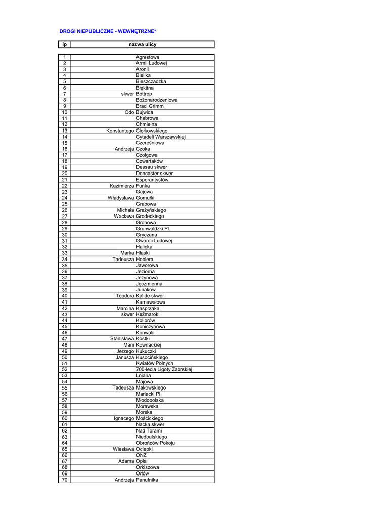DROGI NIEPUBLICZNE - WEWNĘTRZNE* lp 1 2 3 4 5 6 7 8 9 10 11 12 13 14 15 16 17 18 19 20 21 22 23 24 25 26 27 28 29 30 31 32 33 34 35 36 37 38 39 40 41 42 43 44 45 46 47 48 49 50 51 52 53 54 55 56 57 58 59 60 61 62 63 64 65 66 67 68 69 70 nazwa ulicy skwer Odo Konstantego Andrzeja Kazimierza Władysława Michała Wacława Marka Tadeusza Teodora Marcina skwer Stanisława Marii Jerzego Janusza Tadeusza Ignacego Wiesława Adama Andrzeja Agrestowa Armii Ludowej Aronii Bielika Bieszczadzka Błękitna Bottrop Bożonarodzeniowa Braci Grimm Bujwida Chabrowa Chmielna Ciołkowskiego Cytadeli Warszawskiej Czereśniowa Czoka Czołgowa Czwartaków Dessau skwer Doncaster skwer Esperantystów Funka Gajowa Gomułki Grabowa Grażyńskiego Grodeckiego Gronowa Grunwaldzki Pl. Gryczana Gwardii Ludowej Halicka Hłaski Hoblera Jaworowa Jeziorna Jeżynowa Jęczmienna Junaków Kalide skwer Karnawałowa Kasprzaka Kežmarok Kolibrów Koniczynowa Konwalii Kostki Kownackiej Kukuczki Kusocińskiego Kwiatów Polnych 700-lecia Ligoty Zabrskiej Lniana Majowa Makowskiego Mariacki Pl. Młodopolska Morawska Morska Mościckiego Nacka skwer Nad Torami Niedbalskiego Obrońców Pokoju Ociepki ONZ Opla Orkiszowa Orłów Panufnika lp nazwa ulicy 71 72 73 74 75 76 77 78 79 80 81 82 83 84 85 86 87 88 89 90 91 92 93 94 95 96 97 98 99 100 101 102 103 104 105 106 107 108 109 110 111 112 113 114 115 116 117 118 119 120 121 122 PCK Bolesława Piaseckiego Pilotów Planetarna Poziomkowa Prozy Pszenna Tadeusza Pukasa Puławska Adama Rapackiego Rekreacyjna Rumiankowa Rzepakowa Salgotarjan skwer Sandomierska Satyryków SDKPiL Filipa Sieronia Ignacego Sikory Józefa Skalskiego Słowików Spółdzielcza Stanisławowska Strażacka Stryjska Szlak Kolejowy Szmaragdowa Szparagowa Targosza Tarnopolska Topolowa Towarowa Trzech Króli Św. Urbana Urodzajna Valenciennes skwer Wakacyjna Wazów Wesoła Wiązowa Wileńska Wincentego Witosa Sylwestra Witoszka Wschodnia Wspólna Zakole Ludwika Zamenhoffa Alfonsa Zgrzebnioka Zielna Zielone Wzgórze Żeglarska Żeńców ks. * ulicami tymi - na podstawie art. 8 ust. 2 ustawy o drogach publicznych /t.j. Dz. U z 2013 r. poz. 260 z późn. zm./ - zarządza zarządca/ właściciel terenu, na którym są zlokalizowane