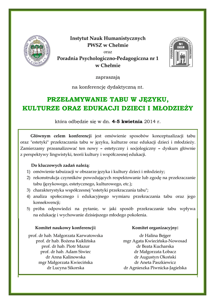 Instytut Nauk Humanistycznych PWSZ w Chełmie oraz Poradnia Psychologiczno-Pedagogiczna nr 1 w Chełmie zapraszają na konferencję dydaktyczną nt. PRZEŁAMYWANIE TABU W JĘZYKU, KULTURZE ORAZ EDUKACJI DZIECI I MŁODZIEŻY która odbędzie się w dn. 4-5 kwietnia 2014 r. Głównym celem konferencji jest omówienie sposobów konceptualizacji tabu oraz "estetyki" przekraczania tabu w języku, kulturze oraz edukacji dzieci i młodzieży. Zamierzamy przeanalizować ten nowy – estetyczny i socjologiczny – dyskurs głównie z perspektywy lingwistyki, teorii kultury i współczesnej edukacji. Do kluczowych zadań należą: 1) omówienie tabuizacji w obszarze języka i kultury dzieci i młodzieży; 2) rekonstrukcja czynników powodujących respektowanie lub zgodę na przekraczanie tabu (językowego, estetycznego, kulturowego, etc.); 3) charakterystyka współczesnej "estetyki przekraczania tabu"; 4) analiza społecznego i edukacyjnego wymiaru przekraczania tabu oraz jego konsekwencji; 5) próba odpowiedzi na pytanie, w jaki sposób przekraczanie tabu wpływa na edukację i wychowanie dzisiejszego młodego pokolenia. Komitet naukowy konferencji: Komitet organizacyjny: prof. dr hab. Małgorzata Karwatowska prof. dr hab. Bożena Kuklińska prof. dr hab. Piotr Mazur prof. dr hab. Adam Siwiec dr Anna Kalinowska mgr Małgorzata Kwiecińska dr Lucyna Sikorska dr Halina Bejger mgr Agata Kwiecińska-Nowosad dr Beata Kucharska dr Małgorzata Łobacz dr Augustyn Okoński dr Aneta Paszkiewicz dr Agnieszka Piwnicka-Jagielska Program konferencji: 4 kwietnia 2014 r. Budynek Instytutu Matematyki i Informatyki PWSZ, ul Pocztowa 54, duża aula 9.30 - 10.00 rejestracja uczestników konferencji Obrady w części plenarnej: 10.00-10.15 prof. dr hab. Małgorzata Karwatowska, prof. dr hab. Adam Siwiec Gender, queer i edukacja. O przełamywaniu tabu w kulturze 10.15- 10.30 dr Lucyna Sikorska Od tabu magicznego do tabu komunikacyjnego – zmiany w definicji 10.30-10.45 dr Agnieszka Piwnicka-Jagielska Zakazany owoc najlepiej smakuje. Czy istnieją jeszcze tematy tabu? 10.45-11.00 dr Paweł Skrzydlewski Bóg i religia jako „nowe tabu”. Ateizacja w edukacji człowieka 11.00-11.15 ks. dr Jerzy Król Tabu we współczesnej edukacji i wychowaniu a doświadczenia skandynawskie 11.30 - 11.45 mgr Elżbieta Miterka Problem tabu a ukryty program szkoły 11.15- 11.30 - przerwa na kawę i herbatę 11.30-11.45 dr Anna Kalinowska Co można zobaczyć w lustrze? Literatura młodego czytelnika oswajająca zło 11.45-12.00 dr Beata Kucharska (Nie)obecność tabu w najnowszych tekstach kultury dla dzieci i młodzieży – rekonesans 12.00- 12.15 dr Aneta Paszkiewicz Mity i stereotypy o niepełnosprawności w kontekście tabuizacji 12.15-12.30 mgr Małgorzata Kwiecińska, mgr Agnieszka Pasieczna Wspólna szkoła – wsparcie edukacyjne dla mniejszości narodowych (działania na rzecz Romów w SOSW w Chełmie) 12.30- 12.45 dr Halina Bejger Eutanazja dzieci jako temat tabu w Polsce i Europie 12.45-13.00 dr Małgorzata Łobacz Wartość "słabego" człowieka w dobie globalizacji. Aspekt etycznopedagogiczny 13.00-13.30 - przerwa na kawę i herbatę Warsztaty Warsztaty odbywają się równolegle – 4 kwietnia od godz. 13.30 do 15.00 w budynku Instytutu Matematyki i Informatyki, ul. Pocztowa 54, a 5 kwietnia od godz. 10.00 do 13.30 w Instytucie Nauk Humanistycznych PWSZ w Chełmie, ul. Nowy Świat 3. O udziale w planowanych zajęciach decyduje kolejność zgłoszeń. Rejestracja odbędzie się w dniu konferencji. Chętni mogą też wcześniej rezerwować miejsce, pisząc na adres mailowy: [email protected]. Uczestnicy warsztatów otrzymają zaświadczenia o odbytym szkoleniu. Udział w konferencji jest bezpłatny. 4 kwietnia 2014 r. (piątek) Instytut Matematyki i Informatyki PWSZ w Chełmie, ul. Pocztowa 54 od godz. 13.30 do 14.15 sala 102 dr Aneta Paszkiewicz mgr Agata Kwiecińska-Nowosad Granice w wychowaniu sala 212 sala 108 dr Anna Kalinowska Granice dzieciństwa wobec zła według propozycji literackich XX dr Agnieszka Piwnickawieku Jagielska O tym się nie mówi, czyli nauczyciel pod obstrzałem… od godz. 14.15 do godz. 15.00 mgr Anna Bielesza dr Lucyna Sikorska Bez uprzedzeń Przekraczanie tabu o zaburzeniach w reklamach telewizyjnych psychicznych od godz. 13.30 do 14.45, sala 11, budynek Rektoratu PWSZ "Trudne" emocje a "właściwa" mowa ciała, czyli jak pewne rzeczy "zachować dla siebie"? Warsztaty z podstaw synergologii poprowadzą studenci filologii polskiej i pedagogiki pod kierunkiem dr Beaty Kucharskiej. godz. 15.00 - 15.30 - sala 212 Forum wymiany opinii i wniosków uczestników konferencji 5 kwietnia 2014 r. (sobota) Instytut Nauk Humanistycznych PWSZ w Chełmie, ul. Nowy Świat 3 od godz. 10.00 do 11.15 i od 11.30 do 13.00 sala 115 godz. 10.00-11.15 dr Agnieszka Piwnicka-Jagielska Kwestia wulgaryzmów i nie tylko, czyli o słownictwie objętym tabu językowym godz. 11.30- 12.45 dr Lucyna Sikorska Polska grzeczność językowa dawniej i dziś a respektowanie i przekraczanie tabu sala 116 godz. 10.00-11.15 dr Beata Kucharska Tabu w języku i kulturze młodzieży polskiej w Polsce i Ukrainie. Dialogi "prowokowane" godz. 11.30-12.45 dr Aneta Paszkiewicz Mity i stereotypy o niepełnosprawności w kontekście tabuizacji od godz. 12.45 do 13.00 - przerwa na kawę i herbatę Po zakończeniu działań zapraszamy do sali 115 na prezentację efektów warsztatów. godz. 13.30 - 14.00 - zakończenie konferencji Kontakt: e-mail: [email protected] Instytut Nauk Humanistycznych ul. Nowy Świat 3, 22-100 Chełm Problematyka warsztatów: Warsztaty dla nauczycieli, animatorów i studentów GRANICE W WYCHOWANIU Prowadzące: mgr Agata Kwiecińska-Nowosad, dr Aneta Paszkiewicz Problematyka: Dzieci potrzebują postawienia im konkretnych ograniczeń, a granice w wychowaniu nie są rzeczą wrodzoną. Trenerki wychodzą z założenia, że aby dziecko dojrzało do odpowiedzialności, prawdomówności i wolności – powinno od najmłodszych 