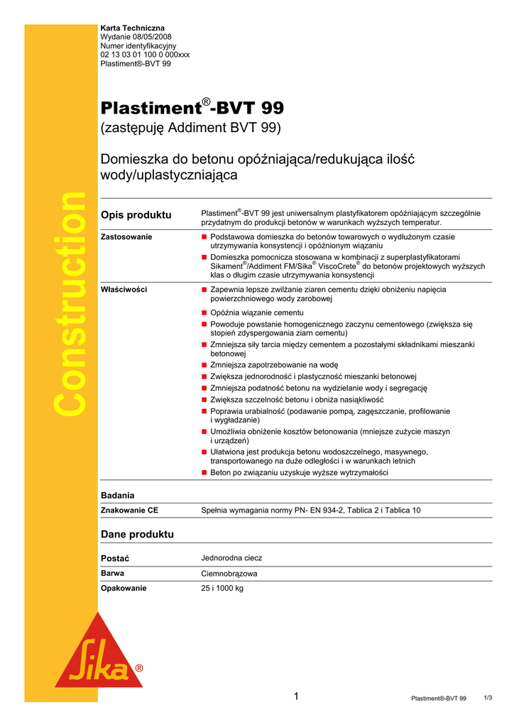 Karta Techniczna Wydanie 08/05/2008 Numer identyfikacyjny 02 13 03 01 100 0 000xxx Plastiment®-BVT 99 Plastiment®-BVT 99 (zastępuję Addiment BVT 99) Construction Domieszka do betonu opóźniająca/redukująca ilość wody/uplastyczniająca Opis produktu Plastiment®-BVT 99 jest uniwersalnym plastyfikatorem opóźniającym szczególnie przydatnym do produkcji betonów w warunkach wyższych temperatur. Zastosowanie Podstawowa domieszka do betonów towarowych o wydłużonym czasie utrzymywania konsystencji i opóźnionym wiązaniu Domieszka pomocnicza stosowana w kombinacji z superplastyfikatorami ® ® ® Sikament /Addiment FM/Sika ViscoCrete do betonów projektowych wyższych klas o długim czasie utrzymywania konsystencji Właściwości Zapewnia lepsze zwilżanie ziaren cementu dzięki obniżeniu napięcia powierzchniowego wody zarobowej Opóźnia wiązanie cementu Powoduje powstanie homogenicznego zaczynu cementowego (zwiększa się stopień zdyspergowania ziarn cementu) Zmniejsza siły tarcia między cementem a pozostałymi składnikami mieszanki betonowej Zmniejsza zapotrzebowanie na wodę Zwiększa jednorodność i plastyczność mieszanki betonowej Zmniejsza podatność betonu na wydzielanie wody i segregację Zwiększa szczelność betonu i obniża nasiąkliwość Poprawia urabialność (podawanie pompą, zagęszczanie, profilowanie i wygładzanie) Umożliwia obniżenie kosztów betonowania (mniejsze zużycie maszyn i urządzeń) Ułatwiona jest produkcja betonu wodoszczelnego, masywnego, transportowanego na duże odległości i w warunkach letnich Beton po związaniu uzyskuje wyższe wytrzymałości Badania Znakowanie CE Spełnia wymagania normy PN- EN 934-2, Tablica 2 i Tablica 10 Dane produktu Postać Jednorodna ciecz Barwa Ciemnobrązowa Opakowanie 25 i 1000 kg 1 Plastiment®-BVT 99 1/3 Składowanie Warunki składowania / Czas przydatności do użycia Produkt przechowywany w oryginalnym, nieuszkodzonym opakowaniu najlepiej użyć w ciągu 12 miesięcy od daty produkcji. Chronić przed mrozem i silnym nasłonecznieniem. Przy dostawach luzem stosować wyłącznie czyste pojemniki. Po dłuższym składowaniu produkt należy przemieszać. Dane techniczne Baza chemiczna Lignosulfonian magnezu / pochodne skrobi Gęstość 1,170 ± 0,030 kg/dm³ Umowna zawartość suchej substancji 33,0 ± 1,6 % Odczyn pH 5,0 ± 1,0 Zawartość chlorków ≤0,10% (domieszka bezchlorkowa) Zawartość alkaliów (równoważnik Na2O) ≤1,0% Informacje o systemie Szczegóły aplikacji Zalecany zakres dozowania 0,20 ÷ 0,80% masy cementu Instrukcja aplikacji Sposób dozowania ® Plastyfikator Plastiment -BVT 99 należy dodawać do gotowej mieszanki pod koniec procesu mieszania. Dozwolone jest także dodawanie plastyfikatora wraz z wodą w trakcie sporządzania mieszanki betonowej W przypadku stosowania w kombinacji z superplastyfikatorami Plastiment®BVT 99 należy dozować jako pierwszy Dozowanie do suchych składników nie daje właściwego efektu uplastycznienia Czas mieszania zależy od rodzaju mieszarki i musi być starannie określony W przypadku dodania większych ilości plastyfikatora lub, gdy mieszanie odbywa się w niskich temperaturach - może wystąpić przy stosowaniu niektórych gatunków cementów zjawisko znacznego opóźnienia wiązania. Po ustaniu tego zjawiska dalsze wiązanie betonu odbywa się bez przeszkód. Beton, w którym nastąpiło opóźnienie wiązania należy jednak poddać szczególnie starannej pielęgnacji. Uwaga Wszelkie podane dane techniczne bazują na próbach i testach laboratoryjnych. Praktyczne wyniki pomiarów mogą nie być identyczne w związku z okolicznościami, na które producent nie ma wpływu. 2 Plastiment®-BVT 99 2/3 Ochrona zdrowia i środowiska Warunki BHP Unikać kontaktu z oczami błonami śluzowymi i skórą. Należy używać odzieży ochronnej, rękawic i okularów ochronnych. Nie jeść i nie pić podczas pracy, myć ręce w czasie przerw i po pracy, natychmiast zmienić zanieczyszczone ubranie robocze. Szczegółowe informacje dotyczące zdrowia, bezpieczeństwa, a także dane dotyczące ekologii, właściwości toksykologicznych materiału itp. dostępne są w Karcie Charakterystyki Preparatu Niebezpiecznego dostępnej na żądanie. Ochrona środowiska Resztek materiału nie należy wylewać do gruntu ani do wód powierzchniowych. Construction Uwagi prawne Informacje, a w szczególności zalecenia dotyczące działania i końcowego zastosowania produktów Sika są podane w dobrej wierze, przy uwzględnieniu aktualnego stanu wiedzy i doświadczenia Sika i odnoszą się do produktów składowanych, przechowywanych i używanych zgodnie z zaleceniami podanymi przez Sika. Z uwagi na występujące w praktyce zróżnicowanie materiałów, substancji, warunków i sposobu ich używania i umiejscowienia, pozostające całkowicie poza zakresem wpływu Sika, właściwości produktów podane w informacjach, pisemnych zaleceniach i innych wskazówkach udzielonych przez Sika nie mogą być podstawą do przyjęcia odpowiedzialności Sika w przypadku używania produktów niezgodnie z zaleceniami podanymi przez Sika. Użytkownik produktu jest obowiązany do używania produktu zgodnie z jego przeznaczeniem i zaleceniami podanymi przez firmę Sika. Prawa własności osób trzecich muszą być przestrzegane. Wszelkie zamówienia są realizowane zgodnie z aktualnie obowiązującymi Ogólnymi Warunkami Sprzedaży Sika, dostępnymi na stronie internetowej www.sika.pl, które stanowią integralną część wszystkich umów zawieranych przez Sika. Użytkownicy są obowiązani przestrzegać wymagań zawartych w aktualnej Karcie Technicznej użytkowanego produktu. Kopię aktualnej Karty Technicznej Produktu Sika dostarcza Użytkownikowi na jego żądanie. Sika Poland Sp. z o.o. ul. Karczunkowska 89 02-871 Warszawa Polska Tel. +48 22 31 00 700 Fax +48 22 31 00 800 e-mail [email protected] www.sika.pl 3 Plastiment®-BVT 99 3/3