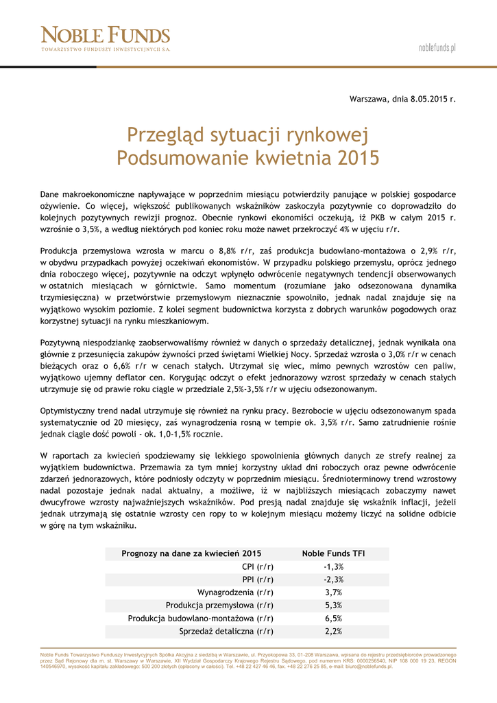 Warszawa, dnia 8.05.2015 r. Przegląd sytuacji rynkowej Podsumowanie kwietnia 2015 Dane makroekonomiczne napływające w poprzednim miesiącu potwierdziły panujące w polskiej gospodarce ożywienie. Co więcej, większość publikowanych wskaźników zaskoczyła pozytywnie co doprowadziło do kolejnych pozytywnych rewizji prognoz. Obecnie rynkowi ekonomiści oczekują, iż PKB w całym 2015 r. wzrośnie o 3,5%, a według niektórych pod koniec roku może nawet przekroczyć 4% w ujęciu r/r. Produkcja przemysłowa wzrosła w marcu o 8,8% r/r, zaś produkcja budowlano-montażowa o 2,9% r/r, w obydwu przypadkach powyżej oczekiwań ekonomistów. W przypadku polskiego przemysłu, oprócz jednego dnia roboczego więcej, pozytywnie na odczyt wpłynęło odwrócenie negatywnych tendencji obserwowanych w ostatnich miesiącach w górnictwie. Samo momentum (rozumiane jako odsezonowana dynamika trzymiesięczna) w przetwórstwie przemysłowym nieznacznie spowolniło, jednak nadal znajduje się na wyjątkowo wysokim poziomie. Z kolei segment budownictwa korzysta z dobrych warunków pogodowych oraz korzystnej sytuacji na rynku mieszkaniowym. Pozytywną niespodziankę zaobserwowaliśmy również w danych o sprzedaży detalicznej, jednak wynikała ona głównie z przesunięcia zakupów żywności przed świętami Wielkiej Nocy. Sprzedaż wzrosła o 3,0% r/r w cenach bieżących oraz o 6,6% r/r w cenach stałych. Utrzymał się wiec, mimo pewnych wzrostów cen paliw, wyjątkowo ujemny deflator cen. Korygując odczyt o efekt jednorazowy wzrost sprzedaży w cenach stałych utrzymuje się od prawie roku ciągle w przedziale 2,5%-3,5% r/r w ujęciu odsezonowanym. Optymistyczny trend nadal utrzymuje się również na rynku pracy. Bezrobocie w ujęciu odsezonowanym spada systematycznie od 20 miesięcy, zaś wynagrodzenia rosną w tempie ok. 3,5% r/r. Samo zatrudnienie rośnie jednak ciągle dość powoli - ok. 1,0-1,5% rocznie. W raportach za kwiecień spodziewamy się lekkiego spowolnienia głównych danych ze strefy realnej za wyjątkiem budownictwa. Przemawia za tym mniej korzystny układ dni roboczych oraz pewne odwrócenie zdarzeń jednorazowych, które podniosły odczyty w poprzednim miesiącu. Średnioterminowy trend wzrostowy nadal pozostaje jednak nadal aktualny, a możliwe, iż w najbliższych miesiącach zobaczymy nawet dwucyfrowe wzrosty najważniejszych wskaźników. Pod presją nadal znajduje się wskaźnik inflacji, jeżeli jednak utrzymają się ostatnie wzrosty cen ropy to w kolejnym miesiącu możemy liczyć na solidne odbicie w górę na tym wskaźniku. Prognozy na dane za kwiecień 2015 Noble Funds TFI CPI (r/r) -1,3% PPI (r/r) -2,3% Wynagrodzenia (r/r) 3,7% Produkcja przemysłowa (r/r) 5,3% Produkcja budowlano-montażowa (r/r) 6,5% Sprzedaż detaliczna (r/r) 2,2% Noble Funds Towarzystwo Funduszy Inwestycyjnych Spółka Akcyjna z siedzibą w Warszawie, ul. Przyokopowa 33, 01-208 Warszawa, wpisana do rejestru przedsiębiorców prowadzonego przez Sąd Rejonowy dla m. st. Warszawy w Warszawie, XII Wydział Gospodarczy Krajowego Rejestru Sądowego, pod numerem KRS: 0000256540, NIP 108 000 19 23, REGON 140546970, wysokość kapitału zakładowego: 500 200 złotych (opłacony w całości). Tel. +48 22 427 46 46, fax. +48 22 276 25 85, e-mail: [email protected]. RYNEK PAPIERÓW DŁUŻNYCH Kwiecień przyniósł kolejny miesiąc przeceny na rynku polskich obligacji skarbowych. Rentowności obligacji wzrosły odpowiednio o 7 pkt. bazowych w przypadku papierów dwuletnich, 30 pkt. bazowych w przypadku papierów pięcioletnich oraz 32 pkt. bazowych w przypadku papierów dziesięcioletnich. Wyprzedaż, zapoczątkowana przez niemieckie obligacje, dotknęła praktycznie cały globalny rynek obligacji skarbowych. W kwietniu, na fali osłabiania się zarówno euro, jak i dolara, ale też mocniejszych danych z polskiej gospodarki, dalej umacniał się polski złoty, który handlował się nawet na poziomie 3,97 do euro. Na koniec miesiąca kursy wymiany wyniosły jednak 4,04 w relacji do euro oraz 3,60 w relacji do amerykańskiego dolara. RYNEK AKCJI Po trzech miesiącach delikatnego wzrostu cen akcji na GPW w kwietniu rynek w końcu przyspieszył, nadrabiając część zaległości z ostatniego okresu, a jednocześnie idąc nieco wbrew tendencjom globalnym. Najważniejsze indeksy giełdy warszawskiej zyskały od 3,5% do 5%, a prym wiodły tym razem największe spółki wchodzące w skład indeksu WIG20. Poprawiła się atmosfera wokół banków, dobry okres miały także inne blue chips, takie jak PKN Orlen czy KGHM. Taki rozkład „zwycięzców” i „przegranych” kwietnia sugerować może, że za wzrostami stała aktywność inwestorów zagranicznych, czego pierwsze symptomy obserwowaliśmy już pod koniec marca. Podobne trendy obserwowaliśmy na innych rynkach emerging markets, gdzie osłabienie dolara i umocnienie lokalnych walut wzmogło apetyt na akcje. Odbicie kursu EURUSD zaszkodziło za to z pewnością giełdom europejskim, w tym niemieckiemu DAX-owi, który spadał w pewnym momencie nawet ponad 8% od szczytu. Problemy z kontynuacją wzrostu miał amerykański indeks S&P500 kilkukrotnie zmagający się z poziomem oporu na poziomie 2100-2120 punktów. W danych makroekonomicznych na uwagę zwraca fakt, iż gospodarka amerykańska otarła się w I kwartale br. o recesję (a być może nawet dynamika PKB była ujemna, jeśli wstępny odczyt skorygować o publikowane później dane o deficycie handlowym w marcu), co tłumaczono czynnikami zarówno „jednorazowymi” (ostra zima, strajki na zachodnim wybrzeżu USA), jak i cyklicznymi (silny dolar, tania ropa). Z pewnością słabsze dane w kolejnych miesiącach wywołałyby większe zawirowania na rynku akcji w USA. W Europie makroekonomiści podnoszą prognozy wzrostu PKB w poszczególnych krajach, choć skali poprawy nie widzimy jeszcze w pełni w publikowanych „twardych” danych ze sfery realnej gospodarki. Wzrost popytu na kredyt sugeruje j