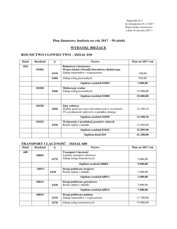 Załącznik Nr 2 …………. do Zarządzenia N r 2/2017... Wójta Gminy Gaworzyce . z dnia 10 stycznia 2017 r … Plan finansowy budżetu na rok 2017 –Wydatki WYDATKI BIEŻĄCE ROLNICTWO I ŁOWIECTWO – DZIAŁ 010 Dział Rozdział § Nazwa Plan na 2017 rok 4210 Rolnictwo i łowiectwo Wojewódzkie Ośrodki Doradztwa Rolniczego Zakup materiałów i wyposażenia 180,00 4300 Zakup usług pozostałych 820,00 010 01002 Ogółem rozdział 01002 01008 4300 Melioracje wodne Zakup usług pozostałych Ogółem rozdział 01008 01030 2850 Izby rolnicze Wpłaty gmin na rzecz izb rolniczych w wysokości 2% uzyskanych wpływów z podatku rolnego Ogółem rozdział 01030 01042 4430 Wyłączenie z produkcji gruntów rolnych Różne opłaty i składki 1.000,00 15.000,00 15.000,00 12.100,10 12.100,10 12.999,90 Ogółem rozdział 01042 12.999,90 Ogółem dział 010 41.100,00 TRANSPORT I ŁĄCZNOŚĆ – DZIAŁ 600 Dział Rozdział § 600 60004 4270 Nazwa Transport i łączność Lokalny transport zbiorowy Zakup usług remontowych Ogółem rozdział 60004 60011 4430 Drogi publiczne krajowe Rożne opłaty i składki Ogółem rozdział 60011 60014 4430 Drogi publiczne powiatowe Rożne opłaty i składki Ogółem rozdział 60014 60016 Plan na 2017 rok 5.000,00 5.000,00 1.000,00 1.000,00 7.000,00 7.000,00 4210 Drogi publiczne gminne Zakup materiałów i wyposażenia 17.700,00 4270 Zakup usług remontowych 37.000,00 4300 Zakup usług pozostałych 70.000,00 Ogółem rozdział 60016 124.700,00 Ogółem dział 600 137.700,00 GOSPODARKA MIESZKANIOWA – DZIAŁ 700 Dział Rozdział § 700 70005 4300 Nazwa Gospodarka mieszkaniowa Gospodarka gruntami i nieruchomościami Zakup usług pozostałych Ogółem rozdział 70005 Plan na 2017 rok 16.000,00 16.000,00 4210 Pozostała działalność Zakup materiałów i wyposażenia 5.000,00 4260 Zakup energii 1.500,00 4300 Zakup usług pozostałych 7.000,00 4400 Opłaty za administrowanie i czynsze za budynki, lokale i pomieszczenia garażowe 9.000,00 70095 Ogółem rozdział 70095 22.500,00 Ogółem dział 700 38.500,00 DZIAŁALNOŚĆ USŁUGOWA – DZIAŁ 710 Dział Rozdział § 710 71004 4300 Nazwa Działalność usługowa Plany zagospodarowania przestrzennego Zakup usług pozostałych Plan na 2017 rok 8.328,40 Ogółem rozdział 71004 8.328,40 Ogółem dział 710 8.328,40 ADMINISTRACJA PUBLICZNA – DZIAŁ 750 Dział Rozdział § 750 Nazwa Plan na 2017 rok 4010 Administracja publiczna Urzędy Wojewódzkie Wynagrodzenia osobowe pracowników 36.996,00 4040 Dodatkowe wynagrodzenia roczne 3.145,00 4110 Składki na ubezpieczenie społeczne 6.326,00 4120 Składki na Fundusz Pracy 4210 Zakup materiałów i wyposażenia 3.000,00 4300 Zakup usług pozostałych 3.635,00 4440 Odpisy na zakład fund świadczeń socjalnych 75011 Ogółem rozdział 75011 ( zad. zlecone) 75022 906,00 985,00 54.993,00 3030 Rada gminy Różne wydatki na rzecz osób fizycznych 92.700,00 4210 Zakup materiałów i wyposażenia 4.000,00 4410 Podróże służbowe krajowe 4700 Szkolenia pracowników niebędących członkami służby cywilnej Ogółem rozdział 75022 500,00 1.200,00 98.400,00 Urzędy gmin Różne wydatki na rzecz osób fizycznych 30.000,00 3030 4010 Wynagrodzenia osobowe pracowników 1.201.600,00 4040 Dodatkowe wynagrodzenia roczne 100.700,00 4100 Wynagrodzenie agencyjno-prowizyjne 14.000,00 4110 Składki na ubezpieczenie społeczne 215.650,00 4120 Składki na Fundusz Pracy 20.600,00 4140 Wpłaty na PFRON 10.200,00 4210 Zakup materiałów i wyposażenia 70.000,00 4260 Zakup energii 35.000,00 4270 Zakup usług remontowych 5.000,00 4280 Zakup usług zdrowotnych 1.000,00 4300 Zakup usług pozostałych 85.000,00 4360 Opłaty z tytułu zakupu usług telekomunikacyjnych 15.000,00 4410 Podróże służbowe krajowe 8.000,00 4430 Różne opłaty i składki 12.000,00 4440 Odpisy na Zakładowy Fundusz Świadczeń Socjalnych 29.200,00 4610 Koszty postępowania sądowego i prokuratorskiego 3.000,00 4700 Szkolenia pracowników niebędących członkami korpusu służby cywilnej 17.000,00 75023 Ogółem rozdział 75023 1.872.950,00 4210 Promocja jednostek samorządu terytorialnego Zakup materiałów i wyposażenia 10.524,00 4300 Zakup usług pozostałych 20.000,00 75075 Ogółem rozdział 75075 30.524,00 3030 Pozostała działalność Różne wydatki na rzecz osób fizycznych 25.000,00 4010 Wynagrodzenia osobowe pracowników 27.600,00 4110 Składki na ubezpieczenie społeczne 4.309,00 4120 Składki na Fundusz Pracy 4430 Różne opłaty i składki 42.756,00 4440 Odpisy na Zakładowy Fundusz Świadczeń Socjalnych 2.187,86 Ogółem rozdział 75095 102.469,86 Ogółem dział 750 2.159.336,86 75095 617,00 URZĘDY NACZELNYCH ORGANÓW WŁADZY PAŃSTWOWEJ, KONTROLI I OCHRONY PRAWA ORAZ SĄDOWNICTWA – DZIAŁ 751 Dział Rozdział § 751 75101 4110 Nazwa Urzędy naczelnych organów władzy państwowej, kontroli i ochrony prawa oraz sądownictwa Urzędy naczelnych organów władzy państwowej, kontroli i ochrony prawa Składki na ubezpieczenie społeczne Plan na 2017 rok 115,00 4120 Składki na Fundusz Pracy 16,48 4170 Wynagrodzenie bezosobowe 672,52 Ogółem rozdział 75101 (zad. zlec.) 804,00 Ogółem dział 751(zad. zlecone) 804,00 OBRONA NARODOWA – DZIAŁ 752 Dział Rozdział § 752 75212 4210 Nazwa Obrona narodowa Pozostałe wydatki obronne Zakup materiałów i wyposażenia Plan na 2017 rok 200,00 Ogółem rozdział 75212 (zad. zlec.) 200,00 Ogółem dział 752 (zad. zlecone) 200,00 BEZPIECZEŃSTWO PUBLICZNE I OCHRONA PRZECIWPOŻAR. – DZIAŁ 754 Dział Rozdział § Nazwa Plan na 2017 rok Bezpieczeństwo publiczne i ochrona p. pożarowa Ochotnicze straże pożarne Dotacja celowa z budżetu na finansowanie lub współfinansowanie zadań zleconych do realizacji stowarzyszeniom 9.000,00 4170 Wynagrodzenia bezosobowe 20.000,00 4210 Zakup materiałów i wyposażenia 28.900,00 4260 Zakup energii 15.000,00 4270 Zakup usług remontowych 33.000,00 4300 Zakup usług pozostałych 11.400,00 4360 Opłaty z tytułu zakupu usług