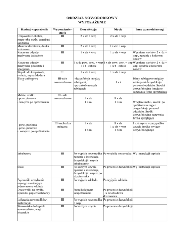 ODDZIAŁ NOWORODKOWY WYPOSAŻENIE Rodzaj wyposażenia Umywalki z okolicą rozprysku wody, armatura sanitarna Muszla klozetowa, deska sedesowa Kosze na odpady medyczne (zakaźne) Kosze na odpady medyczne pozostałe i specjalne. Stojaki do kroplówek, stelaże, szyna Modura Blaty zabiegowe Meble, szafki - pow pionowa - wnętrze po opróżnieniu - pow. pozioma - pow. pionowe - wnętrze po opróżnieniu Wyposażenie strefa III Dezynfekcja Mycie 2 x dz + wrp 2 x dz + wrp III 2 x dz + wrp 2 x dz + wrp III 1 x dz + wrp 1 x dz + wrp III III Wymiana worków 2 x dz + wrp, zgodnie z kolorem kodów 1 x dz pow. zew. + wrp 1 x dz pow. zew. + wrp Wymiana worków 2 x dz + 1 x t - całość 1 x t - całość wrp zgodnie z kolorem kodów 1 x dz + wrp 1 x dz + wrp III-sale - dezynfekcja między noworodkowe zabiegami, - po zakończonych zabiegach III- sale noworodkowe III-kuchenka mleczna III Ssak III Pojemniki urządzenia ssącego zawierające jednorazowe wkłady Dozowniki na mydło, ręczniki, papier toaletowy III Łóżeczka noworodków, materacyki Stanowiska do kąpieli noworodków, wagi lekarskie III III III 1xt 1 x dz 1xm 1 x dz 1xm 1 x dz 1 x dz 1 x dz + wrp 1xm 1xm Inkubatory Inne czynności/uwagi Blaty zabiegowe między zabiegami dezynfekuje personel oddziału. Środki dezynfekcyjne i myjące zapewnia firma sprzątająca Wnętrze mebli, szafek po opróżnieniu myje i dezynfekuje personel oddziału. Środki dezynfekcyjne zapewnia firma sprzątająca 1 x t mycie w przypadku użycia środka myjącodezynfekcyjnego Po wypisie noworodka Po wypisie noworodka Wg instrukcji szpitala zgodnie z instrukcją dezynfekcji i mycia inkubatorów Po każdym użyciu Po procesie dezynfekcjiWg instrukcji szpitala zgodnie z instrukcją dezynfekcji i mycie po użyciu ssaka Po wyjęciu wkładu. Po wyjęciu wkładu. Przed kolejnym uzupełnieniem Po procesie dezynfekcji 1 x dz obudowa dozownika Po wypisie noworodka Po procesie dezynfekcji + wrp Po każdym użyciu Po procesie dezynfekcji Rodzaj wyposażenia Butelki do karmienia Zlewozmywaki Lodówka do leków i żywności Drzwi Wyposażenie strefa III III (kuchnia mleczna, brudownik) III Dezynfekcja Mycie 1 x dz (15.00-16.00) Mycie zgodnie z 1% roztwór sody wg obowiązującą instrukcji szpitala instrukcją mycia: sterylizacje butelek do karmienia 2 x dz 2 x dz 1 x dz + wrp 1 x m + wrp 1 x dz + wrp 1 x m + wrp 1 x dz pow. zewnętrzne 1 x t + wrp W salach noworodkowych występują drzwi przeszklone III wrp Klamki i okolice dotykowe drzwi Parapety, listwy odbojowe III 1 x dz + wrp 1 x dz + wrp III 1 x dz 1 x dz Kaloryfery Szafki, stoliki, biurka, taborety, krzesła III III 1xt 1 x t + wrp Aparaty telefoniczne Lampy i urządzenia biurowe Tablice informacyjne Lampy ścienne i sufitowe Lampy oświetleniowe sufitowe Powierzchnie przeszklone w oddziale Lustra i osłony żarówek nad lustrami Okna Włączniki, wyłączniki, kontakty, gniazda, listwy, przedłużacze Kratki ściekowe syfony Wyciągi wentylacyjne Pajęczyny III III 1 x dz + wrp Dezynfekcja miejscowa doraźna. Inne czynności/uwagi W przypadku użycia środka myjącodezynfekcyjnego mycie 1xt 1xt 1 x dz – pow. poziome 1 x t – pow. pionowe + trudno dostępne 1 x t meble tapicerowane Odkurzenie, zwrócenie uwagi na miejsca trudno dostępne 1 x dz + wrp 1 x dz III III 1xm 1xm 1xk III 1 x t + wrp III 1 x dz 1xm 1xt 1 x m + wrp Należy wlać środek dezynfekcyjny 1 x k + wrp Wrp omiatanie