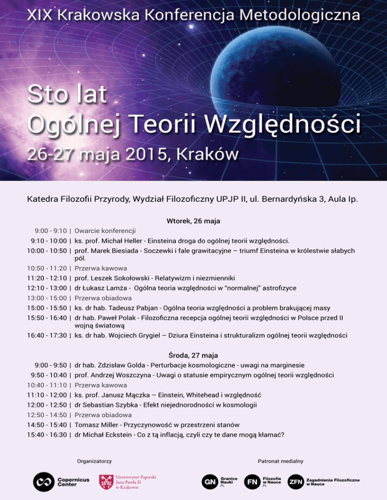 Katedra Filozofii Przyrody, Wydział Filozoficzny UPJP II, ul. Bernardyńska 3, Aula Ip. Wtorek, 26 maja 9:00 - 9:10 | Owarcie konferencji 9:10 - 10:00 | ks. prof. Michał Heller - Einsteina droga do ogólnej teorii względności. 10:00 - 10:50 | prof. Marek Biesiada - Soczewki i fale grawitacyjne – triumf Einsteina w królestwie słabych pól. 10:50 - 11:20 | Przerwa kawowa 11:20 - 12:10 | prof. Leszek Sokołowski - Relatywizm i niezmienniki 12:10 - 13:00 | dr Łukasz Lamża - Ogólna teoria względności w “normalnej” astrofizyce 13:00 - 15:00 | Przerwa obiadowa 15:00 - 15:50 | ks. dr hab. Tadeusz Pabjan - Ogólna teoria względności a problem brakującej masy 15:50 - 16:40 | dr hab. Paweł Polak - Filozoficzna recepcja ogólnej teorii względności w Polsce przed II wojną światową 16:40 - 17:30 | ks. dr hab. Wojciech Grygiel – Dziura Einsteina i strukturalizm ogólnej teorii względności Środa, 27 maja 9:00 - 9:50 | dr hab. Zdzisław Golda - Perturbacje kosmologiczne - uwagi na marginesie 9:50 - 10:40 | prof. Andrzej Woszczyna - Uwagi o statusie empirycznym ogólnej teorii względności 10:40 - 11:10 | Przerwa kawowa 11:10 - 12:00 | ks. prof. Janusz Mączka – Einstein, Whitehead i względność 12:00 - 12:50 | dr Sebastian Szybka - Efekt niejednorodności w kosmologii 12:50 - 14:50 | Przerwa obiadowa 14:50 - 15:40 | Tomasz Miller - Przyczynowość w przestrzeni stanów 15:40 - 16:30 | dr Michał Eckstein - Co z tą inflacją, czyli czy te dane mogą kłamać? Organizatorzy Patronat medialny