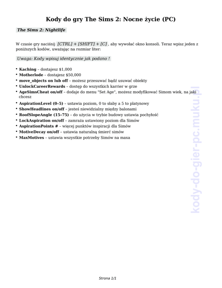 Kody do gry The Sims 2: Nocne życie (PC) The Sims 2: Nightlife W czasie gry naciśnij [CTRL] + [SHIFT] + [C] , aby wywołać okno konsoli. Teraz wpisz jeden z poniższych kodów, uważając na rozmiar liter: ● Kaching – dostajesz $1,000 ● Motherlode – dostajesz $50,000 ● move_objects on lub off – możesz przesuwać bądź usuwać obiekty ● UnlockCareerRewards – dostęp do wszystkich karrier w grze ● kody-do-gier-pc.muku.pl Uwaga: Kody wpisuj identycznie jak podano ! AgeSimsCheat on/off – dodaje do menu "Set Age", możesz modyfikować Simom wiek, na jaki chcesz ● AspirationLevel (0–5) – ustawia poziom, 0 to słaby a 5 to platynowy ● ShowHeadlines on/off – jesteś niewidzialny między balonami ● RoofSlopeAngle (15–75) – do użycia w trybie budowy ustawia pochyłość ● LockAspiration on/off – zamraża ustawiony poziom dla Simów ● AspirationPoints # – więcej punktów inspiracji dla Simów ● MotiveDecay on/off – ustawia naturalną śmierć simów ● MaxMotives – ustawia wszystkie potrzeby Simów na maxa Strona 1/1