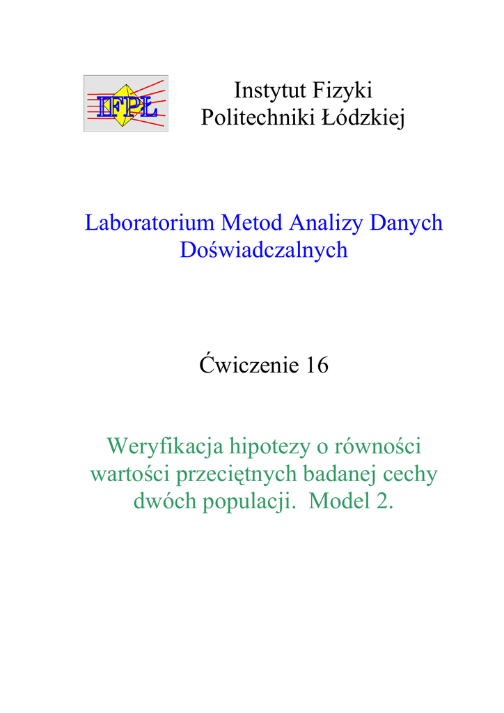 Instytut Fizyki Politechniki Łódzkiej Laboratorium Metod Analizy Danych Doświadczalnych Ćwiczenie 16 Weryfikacja hipotezy o równości wartości przeciętnych badanej cechy dwóch populacji. Model 2. Laboratorium Metod Analizy Danych Doświadczalnych Instytutu Fizyki PŁ Ćwiczenie 16 Weryfikacja hipotezy o równości wartości przeciętnych badanej cechy dwóch populacji. Model 2. 1. Cel ćwiczenia Celem tego ćwiczenia jest przeprowadzenie weryfikacji hipotezy o równości wartości przeciętnych badanej cechy dwóch populacji według modelu 2 opisanego w książce [1]. Dla przeprowadzenia tego testu należy napisać program w dowolnym języku programowania i dla dowolnego systemu operacyjnego oraz przetestować jego działanie na kilku zestawach danych otrzymanych za pomocą różnych generatorów liczb losowych. Do sprawozdania należy dołączyć plik źródłowy programu, plik wykonywalny programu, niestandardowe biblioteki użyte przy kompilacji programu oraz cztery zestawy danych dla których przeprowadzono testy (wyniki tych testów i wypływające z nich wnioski muszą się znaleźć w sprawozdaniu). 2. Wstęp Hipotezą statystyczną nazywamy każde przypuszczenie dotyczące nieznanego rozkładu badanej cechy populacji (w tym przypadku równości wartości przeciętnych), o prawdziwości lub fałszywości którego wnioskuje się na podstawie badanej próbki. W praktyce przy weryfikacji hipotez postępuje się w ten sposób, że oprócz weryfikowanej hipotezy zwanej hipotezą zerową wyróżnia się jeszcze inną hipotezę K, która najczęściej wynika z celu badania statystycznego, zwaną hipotezą alternatywną. W celu weryfikacji hipotezy budujemy funkcję opartą na próbie (najlepiej próbie losowej prostej) δ(X1,....,Xn) zwaną statystyką testową. Przy pobieraniu różnych próbek, nawet o tej samej liczności n – funkcja ta przyjmuje na ogół różne wartości, z których jedne będą świadczyły o prawdziwości weryfikowanej hipotezy a inne będą ją odrzucały. Naturalnym zatem jest podzielenie zbioru wszystkich wartości, które może przyjąć statystyka testowa na dwa dopełniające się zbiory W i W’, takie że: δ(X1,....,Xn) ∈ W - hipotezę odrzucamy; δ(X1,....,Xn) ∈ W’ - hipotezę przyjmujemy. Zbiór W nazywamy zbiorem krytycznym, zaś zbiór W‘ zbiorem przyjęć. W testach istotności nie oblicza się błędu drugiego rodzaju (możemy przyjąć weryfikowaną hipotezę H jako prawdziwą, podczas gdy jest ona fałszywa, czyli jeśli prawdziwa jest hipoteza alternatywna K), natomiast przy założeniu prawdziwości weryfikowanej hipotezy budujemy zbiór krytyczny w ten sposób, aby zagwarantować małe prawdopodobieństwo zaobserwowania wartości statystyki testowej należącej do tego zbioru, równe z góry obranemu poziomowi istotności α = 5 %. Jeżeli zatem wartość statystyki testowej wpadnie do zbioru krytycznego, to weryfikowaną hipotezę należy odrzucić. Jeżeli jednak wartość statystyki testowej nie znajdzie się w zbiorze krytycznym, a prawdopodobieństwo takiego zdarzenia jest większe niż α, to można jedynie stwierdzić, że nie ma podstaw do odrzucenia weryfikowanej hipotezy . 2 Laboratorium Metod Analizy Danych Doświadczalnych Instytutu Fizyki PŁ Ćwiczenie 16 W ćwiczeniu przyjmujemy, że badana cecha ma w dwóch populacjach rozkłady N(µ1,σ1) i N(µ2,σ2), gdzie σ1 = σ2 jest nieznane (w naszym przypadku bez przeprowadzania weryfikacji równości wariancji za pomocą odpowiedniego testu przyjmiemy, że równość ta zachodzi). Weryfikujemy hipotezę zerową H0: µ1 = µ2 przy możliwych trzech hipotezach alternatywnych K1: µ1 < µ2; K2: µ1 > µ2; K3: µ1 ≠ µ2, na poziomie ufności 0,95. 3. Algorytm postępowania Aby przeprowadzić weryfikację hipotezy o równości wartości przeciętnych badanej cech dwóch populacji budujemy test przebiegający w następujący sposób: 1. Wczytujemy dane z dwóch zbiorów tekstowych zawierających dane liczbowe prób z dwóch populacji generalnych (z dwóch generatorów liczb losowych). 2. Obliczamy wartość przeciętną (średnią arytmetyczną) x oraz średnie odchylenie kwadratowe s2 korzystając ze wzoru: 1 n s 2 = ∑ ( xi − x ) 2 n 1 3. Obliczamy wartość statystyki t= x1 − x 2 n1 s12 + n2 s 22 n1 + n2 ⋅ n1 + n2 − 2 n1n 2 4. Następnie znajdujemy przedziały krytyczne : Dla K1: µ1 < µ2. jest to (-∞,-t(1-α , n1-n2 –2)] Dla K2: µ1 > µ2 jest to [t(1-α , n1-n2 –2), ∞ ) Dla K3: µ1 ≠ µ2. jest to (-∞,-t(1-0.5α , n1-n2 –2)] ∪ [t(1-0.5α, n1-n2 –2), ∞ ), gdzie t(p,v) oznacza kwantyl rzędu p rozkładu Studenta o v stopniach swobody. 5. Przeprowadzamy sprawdzenie, czy obliczona wartość statystyki należy do przedziału krytycznego. Jeżeli wartość obliczona nie należy do przedziału krytycznego, wówczas nie ma podstaw do odrzucenia hipotezy o równości wariancji na założonym poziomie istotności. 4. Sprawozdanie W sprawozdaniu przygotowanym w formie elektronicznej lub papierowej nie zamieszczamy całości lub fragmentów listingu programu, program źródłowy powinien być natomiast dobrze opisany za pomocą komentarzy. W sprawozdaniu nie zamieszczamy tablic z których korzystamy w teście, natomiast powinna znaleźć się informacja w postaci odnośnika 3 Laboratorium Metod Analizy Danych Doświadczalnych Instytutu Fizyki PŁ Ćwiczenie 16 literaturowego do tychże. W sprawozdaniu powinny koniecznie znaleźć się poniższe elementy: 4.1. Wstęp teoretyczny Wstęp teoretyczny powinien zawierać podstawowe informacje na temat testów parametrycznych oraz testu będącego przedmiotem tego ćwiczenia. Powinny w nim się znaleźć wszystkie wzory stosowane w programie wraz z objaśnieniami wielkości w nich występujących. 4.2. Dane techniczne Dane techniczne powinny zawierać spis plików programu oraz plików z testowanymi danymi taki jak w poniższym przykładzie: Przykład Plik: Test16.exe Rozmiar: Opis: 64 kB Plik wykonywalny