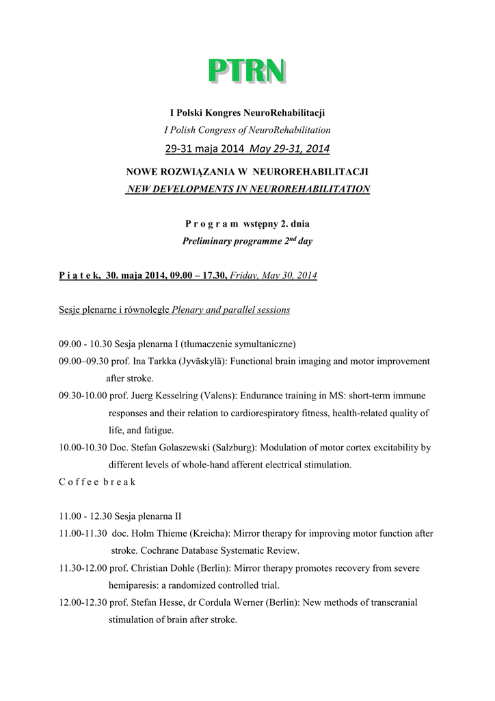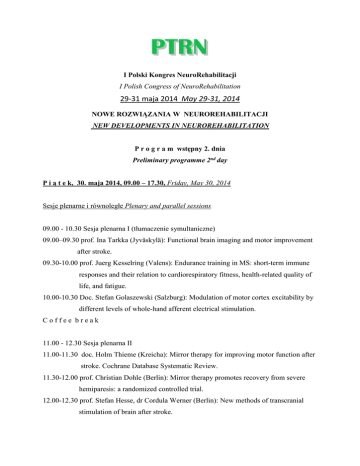 I Polski Kongres NeuroRehabilitacji I Polish Congress of NeuroRehabilitation 29-31 maja 2014 May 29-31, 2014 NOWE ROZWIĄZANIA W NEUROREHABILITACJI NEW DEVELOPMENTS IN NEUROREHABILITATION P r o g r a m wstępny 2. dnia Preliminary programme 2nd day P i ą t e k, 30. maja 2014, 09.00 – 17.30, Friday, May 30, 2014 Sesje plenarne i równoległe Plenary and parallel sessions 09.00 - 10.30 Sesja plenarna I (tłumaczenie symultaniczne) 09.00–09.30 prof. Ina Tarkka (Jyväskylä): Functional brain imaging and motor improvement after stroke. 09.30-10.00 prof. Juerg Kesselring (Valens): Endurance training in MS: short-term immune responses and their relation to cardiorespiratory fitness, health-related quality of life, and fatigue. 10.00-10.30 Doc. Stefan Golaszewski (Salzburg): Modulation of motor cortex excitability by different levels of whole-hand afferent electrical stimulation. Coffee break 11.00 - 12.30 Sesja plenarna II 11.00-11.30 doc. Holm Thieme (Kreicha): Mirror therapy for improving motor function after stroke. Cochrane Database Systematic Review. 11.30-12.00 prof. Christian Dohle (Berlin): Mirror therapy promotes recovery from severe hemiparesis: a randomized controlled trial. 12.00-12.30 prof. Stefan Hesse, dr Cordula Werner (Berlin): New methods of transcranial stimulation of brain after stroke. 2 11.00 - 12.30 Sesje równoległe – Tematy wolne 12.30–14.00 – l u n c h 12.30-14.00 Sesja posterowa. Poster Session. 12.45-13.45 Sympozja satelitarne: 1. Urządzenia mechaniczne do wspomagania rehabilitacji. 2. Profilaktyka i leczenie odleżyn 14.00 – 15.30 Sesja plenarna III 14.00-14.30 dr n. med. Anna Gójska-Grymajło, prof. Walenty Nyka, (Gdańsk): „Komórki macierzyste w udarze mózgu”. Stem cells in the cerebral stroke. 14.30-15.00 Prof. Anna Członkowska, dr Iwona Sarzyńska-Długosz (Warszawa): „Kwalifikacja do leczenia trombolitycznego pacjentów z ostrym udarem niedokrwiennym mózgu”. Estimation of patient eligibility for thrombolysis in acute ischaemic stroke. 15.00-15.30 dr hab. Monika Rudzińska, prof. Andrzej Szczudlik, dr Joanna Stożek (Kraków): Zapobieganie upadkom w chorobie Parkinsona. Preventing falls in Parkinson`s Disease. 15.30 - 16.00 C o f f e e b r e a k 14.00 – 15.30 Sesje równoległe: Tematy wolne 14.00 – 15.30 Warsztaty No 11: Postępowanie w zaburzeniach połykania : prof. Jurek Olszewski dr n. med. Marzena Bielińska dr Joanna Urbaniak. 15.30 - 16.00 C o f f e e b r e a k 16.00- 17.30 Sesja plenarna IV 16.00-16.30 prof. Andrzej Małecki (Katowice): „Aktywność fizyczna a bariera krew-mózg”. Physical activity and blood-brain barrier. 16.30-17.00 prof. Józef Opara (Katowice): „Metody rehabilitacji poudarowej wykorzystujące zjawiska plastyczności mózgu”. Methods of rehabilitation post stroke using plasticity of brain. 17.00-17.30 dr Iwona Sarzyńska-Długosz, dr Bożena Kłysz (Warszawa): „Interfejsy mózg- 3 komputer w neurorehabilitacji". Brain-computer interfaces in neurorehabilitation. 16.00 – 17.30 Sesje równoległe: Tematy wolne 16.00- 17.30 Warsztaty No 12: Ruchowe sprzężenie zwrotne (Motion Feedback) w rehabilitacji. 19.00 Spotkanie towarzyskie