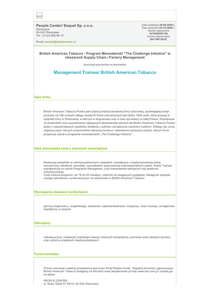 praca, oferty pracy People Center/ Sequel Sp. z o.o. Warszawa 00-042 Warszawa Tel.: (0-22) 828-56-10 Email: [email protected] Data publikacji 29-09-2005 r. Data ważności 03-10-2005 r. Numer ogłoszenia 2419/09/05/136 Numer referencyjny BAT/MT/AUG British American Tobacco - Program Menedżerski "The Challenge Initiative" w obszarach Supply Chain i Factory Management poszukuje pracownika na stanowisko Management Trainee/ British American Tobacco Opis firmy British American Tobacco Polska jest częścią międzynarodowej firmy tytoniowej, sprzedającej swoje produkty na 180 rynkach całego świata.W firmie zatrudnionych jest blisko 1000 osób, które pracują w oddziale firmy w Warszawie, w fabryce w Augustowie oraz w sieci sprzedaży w całej Polsce. Współpraca ze studentami oraz pozyskiwanie najlepszych absolwentów stanowi dla British American Tobacco Polska jeden z najważniejszych aspektów działania z zakresu zarządzania zasobami ludzkimi. Dlatego też coraz większą część naszych pracowników stanowią studenci i absolwenci wyższych uczelni, którym firma proponuje udział w programie menedżerskim „The Challenge Initiative ”. Opis stanowiska wraz z zakresem obowiązków Realizacja projektów w interdyscyplinarnych zespołach, współpraca z międzynarodową kadrą kierowniczą, szkolenia, warsztaty, samodzielne wykonywanie odpowiedzialnych zadań. Każdy Trainee współpracuje ze swoim Programm Managerem, czyli menedżerem pełniącym rolę opiekuna merytorycznego. Czas trwania programu: od 18 do 24 miesięcy, zależnie od osiąganych postępów. Następnie stażysta zostaje zatrudniony na kierowniczym na stanowisku w British-American Tobacco. Wymagania stawiane kandydatom płynnej znajomości j. angielskiego, otwartości, odpowiedzialności, inicjatywy, chęci rozwoju, umiejętności współpracy w zespole Oferujemy ciekawą pracę, możliwość szybkiego rozwoju własnych kompetencji, poznania wielu dziedzin biznesu oraz udział w projektach międzynarodowych Forma kontaktu Proces rekrutacji i selekcji prowadzony jest przez firmę People Center. Wypełnij formularz zgłoszeniowy British American Tobacco dostępny na stronach www.peoplecenter.pl oraz www.bat.com.pl i prześlij go na adres: PEOPLE CENTER ul. Nowy Świat 57-59/12; 00-042 Warszawa tel./faks: +48 22 828 56 10 ul. Nowy Świat 57-59/12; 00-042 Warszawa tel./faks: +48 22 828 56 10 lub e-mail: [email protected] Informacje dodatkowe Minimalne wykształcenie: niepełne wyższe Branża: FMCG Forma zatrudnienia: umowa o pracę Wymiar pracy: pełny etat Wynagrodzenie (netto): nie podano Lokalizacja: Polska Województwo: wszystkie, Miejsce pracy miasto(a) lub kraj(e): Augustów Prawo jazdy: Znajomość języka obcego: tak Ogłoszenie pochodzi z portalu www.i-praca.pl - Internetowy Portal Pracy ilość wyświetleń: 3849