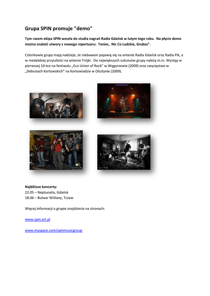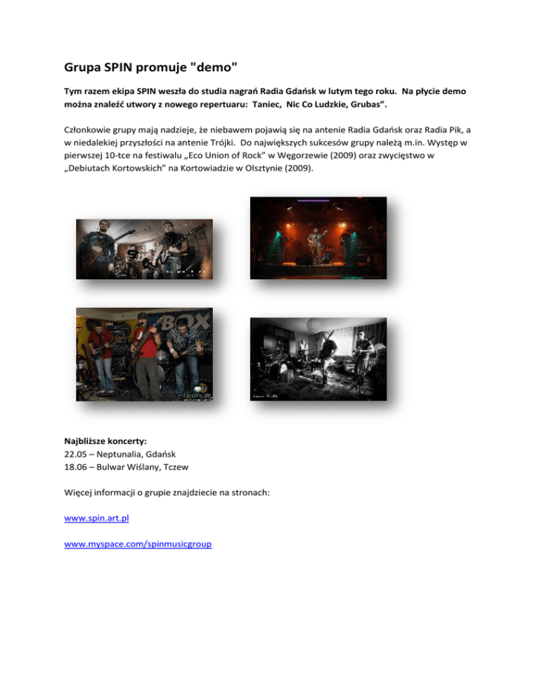 Grupa SPIN promuje "demo" Tym razem ekipa SPIN weszła do studia nagrao Radia Gdaosk w lutym tego roku. Na płycie demo można znaleźd utwory z nowego repertuaru: Taniec, Nic Co Ludzkie, Grubas”. Członkowie grupy mają nadzieje, że niebawem pojawią się na antenie Radia Gdaosk oraz Radia Pik, a w niedalekiej przyszłości na antenie Trójki. Do największych sukcesów grupy należą m.in. Występ w pierwszej 10-tce na festiwalu „Eco Union of Rock” w Węgorzewie (2009) oraz zwycięstwo w „Debiutach Kortowskich” na Kortowiadzie w Olsztynie (2009). Najbliższe koncerty: 22.05 – Neptunalia, Gdaosk 18.06 – Bulwar Wiślany, Tczew Więcej informacji o grupie znajdziecie na stronach: www.spin.art.pl www.myspace.com/spinmusicgroup