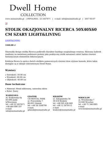 www.momastudio.pl | INFOLINIA.: 22 2437671 | e-mail: [email protected] | 2017-03-07 STOLIK OKAZJONALNY RICERCA 50X40X60 CM SZARY LIGHT&LIVING LIGHT&LIVING 1440.00 zł Niezwykły design stolika Ricerca podkreśli charakter każdego oryginalnego wnętrza. Skórzany kuferek osadzony na metalowej podstawie posłuży jako praktyczny stolik natomiast całość będzie również fantastycznym elementem dekoracyjnym. Kolekcja Ricera to oprócz dwóch stolików pomocniczych również dwie stylowe konsole, które także dostępne są w sklepie internetowym Dwell Home. Wymiary ● ● ● Szerokość: 50.00 cm Wysokość: 60.00 cm Głębokość: 40.00 cm Dane techniczne ● ● Materiał: Metal niklowany, naturalna skóra Kolor: Szary WARSZAWA Al. Krakowska 6a 05-090 Janki k/Warszawy tel: +48 22 2437671 +48 664 890 337 e-mail: [email protected] GDAŃSK CH RENTAL PARK ul. Przywidzka 7 80-001 Gdańsk tel: +48 58 3508790 e-mail: [email protected] KRAKÓW ul. Zakopiańska 56 30-418 Kraków tel: +48 505 436 669 tel: +48 12 3070112 e-mail: [email protected] WROCŁAW ul. Wrocławska 7 55-040 Wrocław tel: +48 71 3461885 e-mail: [email protected]