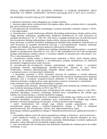 WYKAZ DOKUMENTÓW DO ZŁOŻENIA WNIOSKU O ZASIŁEK RODZINNY ORAZ DODATKI NA OKRES ZASIŁKOWY 2014/2015 (obowiązuje od 01.11.2015. do 31.10.2016r.) DO WNIOSKU NALEŻY DOŁĄCZYĆ ODPOWIEDNIO: 1. dokument tożsamości osoby ubiegającej się o zasiłek rodzinny, 2. skrócone odpisy aktów urodzenia dzieci lub zupełne odpisy aktów urodzenia dzieci w przypadku gdy ojciec dziecka jest nieznany; 3. zaświadczenia lub oświadczenia stwierdzające wysokość dochodów członków rodziny w 2014r., w tym odpowiednio: a) zaświadczenie z urzędu skarbowego oddzielne dla każdego pełnoletniego członka rodziny, który osiąga dochody podlegające opodatkowaniu podatkiem dochodowym od osób fizycznych na zasadach określonych w art. 27, 30b, 30c i 30e ustawy o podatku dochodowym od osób fizycznych lub oświadczenie każdego pełnoletniego członka rodziny złożone pod odpowiedzialnością karną dotyczące wysokości dochodów podlegających opodatkowaniu podatkiem dochodowym od osób fizycznych na zasadach określonych powyżej z wyszczególnieniem: dochodu, należnego podatku oraz składek na ubezpieczenia społeczne odliczonych od dochodu b) zaświadczenie z ZUS lub z zakładu pracy każdego pełnoletniego członka rodziny o wysokości składek na ubezpieczenie zdrowotne (w wys. 9%) w roku kalendarzowym 2014 lub oświadczenie każdego pełnoletniego członka rodziny o wysokości składek na ubezpieczenie zdrowotne(w wys. 9%) w roku kalendarzowym 2014 c) oświadczenie członka rodziny o deklarowanym dochodzie w 2014r., jeżeli członek rodziny rozliczał się na podstawie przepisów o zryczałtowanym podatku dochodowym od niektórych przychodów osiąganych przez osoby fizyczne; d) zaświadczenia lub oświadczenie każdego pełnoletniego członka rodziny o wysokości uzyskanego dochodu niepodlegającego opodatkowaniu (min. alimenty na rzecz dzieci, świadczenia z funduszu alimentacyjnego, stypendia, deputat węglowy i inne określone w przepisach ustawy o świadczeniach rodzinnych); w przypadku uzyskania w 2014r. alimentów niższych niż zasądzone w wyroku sądowym należy dołączyć zaświadczenie komornika o całkowitej lub częściowej bezskuteczności egzekucji alimentów oraz o wysokości wyegzekwowanych alimentów w 2014r. lub informację sądu lub właściwej instytucji o podjęciu przez osobę uprawnioną czynności związanych z wykonaniem tytułu wykonawczego, jeżeli dłużnik zamieszkuje za granicą, w przypadku utraty dochodu - dokument określający datę utraty dochodu (np. świadectwo pracy) oraz wysokość utraconego dochodu za 2014r. (np. PIT 11); w przypadku uzyskania dochodu przez wnioskodawcę lub członka jego rodziny w roku 2014 dokument określający wysokość uzyskanego dochodu przez wnioskodawcę lub członka jego rodziny oraz liczbę miesięcy, w których dochód był osiągany, w przypadku uzyskania dochodu przez wnioskodawcę lub członka jego rodziny po roku 2014 dokument określający wysokość uzyskanego przez wnioskodawcę lub członka jego rodziny dochodu z miesiąca następującego po miesiącu, w którym dochód został osiągnięty, jeżeli wnioskodawca lub członek jego rodziny posiada gospodarstwo rolne zaświadczenie organu gminy o wielkości gospodarstwa rolnego w 2014r. (w hektarach przeliczeniowych) lub oświadczenie złożone pod odpowiedzialnością karną, dotyczącego wielkości gospodarstwa rolnego w hektarach przeliczeniowych ogólnej powierzchni w 2014r.; w przypadku oddania części lub całości gospodarstwa rolnego w dzierżawę - umowę dzierżawy, jeżeli członkowie rodziny są zobowiązani wyrokiem sądu do płacenia alimentów na rzecz osób spoza rodziny – przekazy lub przelewy pieniężne dokumentujące wysokość zapłaconych alimentów, celem odliczenia ich od dochodu członka rodziny; 4. inne zaświadczenia lub oświadczenia oraz dokumenty niezbędne do ustalenia prawa do zasiłku rodzinnego, w tym: a) orzeczenie o niepełnosprawności albo o umiarkowanym lub znacznym stopniu niepełnosprawności w przypadku, gdy w rodzinie wychowuje się dziecko niepełnosprawne; b) zaświadczenie ze szkoły lub oświadczenie złożone pod odpowiedzialnością karną, o uczęszczaniu dziecka do szkoły, w przypadku ukończenia przez dziecko 18 roku życia, c) w przypadku osób samotnie wychowujących dziecko należy dostarczyć odpowiednio do sytuacji: akt zgonu małżonka lub rodzica dziecka; prawomocny wyrok sądu orzekający rozwód / separację, wyrok lub ugodę w sprawie zasądzenia alimentów na rzecz dziecka; odpis wyroku sądu oddalającego powództwo o ustalenie świadczenia alimentacyjnego od drugiego z rodziców dziecka; orzeczenie sądu zobowiązujące jednego z rodziców do ponoszenia całkowitych kosztów utrzymania dziecka; d) postanowienie lub zaświadczenie sądu o ustaleniu opiekuna prawnego dziecka; e) informację sądu o toczącym się postępowaniu o przysposobienie dziecka, w przypadku osoby faktycznie opiekującej się dzieckiem, która wystąpiła o przysposobienie; f) w przypadku “osoby uczącej się” - akty zgonu rodziców lub odpisy wyroków sądu zasądzających alimenty; g) w przypadku cudzoziemca przebywającego na terytorium RP – np.: zezwolenie na osiedlenie się, zezwolenie na pobyt rezydenta długoterminowego, zezwolenie na zamieszkanie na czas oznaczony lub zgodę na pobyt tolerowany lub status uchodźcy lub ochrony uzupełniającej. h) inne dokumenty i zaświadczenia w zależności od sytuacji rodzinnej niezbędne do ustalenia prawa do zasiłku rodzinnego. WYKAZ DOKUMENTÓW DLA UBIEGAJĄCYCH SIĘ O DODATKI DO ZASIŁKU RODZINNEGO NA OKRES ZASIŁKOWY 2015/2016: DODATEK Z TYTUŁU URODZENIA DZIECKA: zaświadczenie lekarskie lub wystawione przez położną, potwierdzające pozostawanie kobiety pod opieką medyczną nie później niż od 10 tygodnia ciąży do porodu z uwzględnieniem odbytej wizyty w każdym trymestrze ciąży. DODATEK Z TYTUŁU OPIEKI NAD DZIECKIEM W OKRESIE KORZYSTANIA Z URLOPU WYCHOW