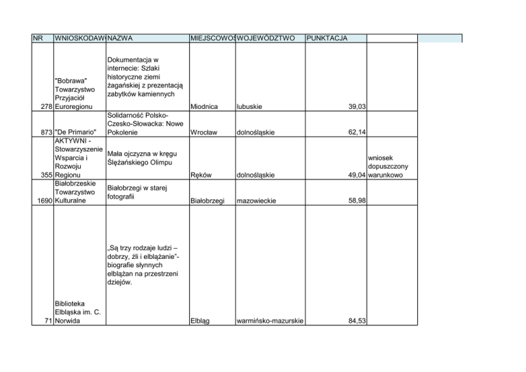 NR NAZWA WNIOSKODAWCA "Bobrawa" Towarzystwo Przyjaciół 278 Euroregionu 873 "De Primario" AKTYWNI Stowarzyszenie Wsparcia i Rozwoju 355 Regionu Białobrzeskie Towarzystwo 1690 Kulturalne MIEJSCOWOŚĆ WOJEWÓDZTWO PUNKTACJA Dokumentacja w internecie: Szlaki historyczne ziemi żagańskiej z prezentacją zabytków kamiennych Solidarność PolskoCzesko-Słowacka: Nowe Pokolenie Miodnica lubuskie 39,03 Wrocław dolnośląskie 62,14 Ręków dolnośląskie wniosek dopuszczony 49,04 warunkowo Białobrzegi mazowieckie 58,98 Elbląg warmińsko-mazurskie 84,53 Mała ojczyzna w kręgu Ślężańskiego Olimpu Białobrzegi w starej fotografii „Są trzy rodzaje ludzi – dobrzy, źli i elblążanie”biografie słynnych elblążan na przestrzeni dziejów. Biblioteka Elbląska im. C. 71 Norwida 396 836 1047 1288 781 1137 Biblioteka Publiczna Gminy Kampinos Biblioteka Publiczna Gminy Prażmów Biblioteka Publiczna Gminy Stare Miasto Biblioteka Publiczna im. Jarosława Iwaszkiewicza w Sępólnie Krajeńskim Biblioteka Publiczna im. Wiesława Sautera w Babimoście Biblioteka Publiczna im. Zygmunta Jana Rumla w Dzielnicy Praga Południe m.st. Warszawy Szlakami powstańców w Powiecie WarszawskimZachodnim - Kierunek Kampinos" Kampinos mazowieckie 66,215 Powstanie styczniowe: historia i pamięć – wirtualna wycieczka Prażmów mazowieckie 59 Stare Miasto wielkopolskie 80,44 Gmina Stare Miasto wczoraj i dziś w obiektywie fotograficznym wniosek dopuszczony warunkowo Tajemnicze Sępólno Sępólno Krajeńkujawsko-pomorskie 67,125 "Babimost co grodem się nazywał" Babimost lubuskie 62,76 Warszawa mazowieckie 67,65 Kresowianie na Mazowszu 895 775 472 874 480 Biblioteka Publiczna m.st. Warszawy Biblioteka Główna Województwa Mazowieckiego Biblioteka Publiczna m.st. Warszawy – Biblioteka Główna Województwa Mazowieckiego Biblioteka Publiczna Miasta i Gminy Jarocin Biblioteka Publiczna Miasta i Gminy w Pleszewie Biblioteka Publiczna w Dzielnicy Targówek m.st Warszawy Styczniowym szlakiem historyczna gra fabularna Warszawa mazowieckie 71,04 Warszawa mazowieckie 52,2 Jarocin wielkopolskie 65,31 Pleszew wielkopolskie 81,88 Warszawa mazowieckie 71,8 Bytom śląskie Tykocin podlaskie Wystawa wirtualna pt. „Męczeństwo czy praca? Stanisław Brzozowski jako patriota jutra” Zagrajmy w Powstanie Na tropach historii : Pleszewskie szlaki z czasów okupacji „…bo kocham Polskę :-)” Bytomskie Alternative Space 1359 Centrum Kultury Nowy stary świat. Centrum Badań Powojenne nad Historią i doświadczenie Kulturą Małych społeczności Tykocina w 906 Miast latach 1945-1960 59,375 77,62 Centrum Inicjatyw 1725 Lokalnych Film dokumentalny o zawierciańskiej społeczności Żydów śląskie 58,98 łódzkie 73,32 Jarosław podkarpackie 41,13 Cieszanów podkarpackie 71,38 Tczew pomorskie Zawiercie Przewodnik historyczno Centrum Kultury turystyczny '' Księstwo , Turystyki i Łowickie jakiego nie Promocji Ziemi znacie '' 670 Łowickiej Łowicz Centrum Kultury Gottfriediana i Promocji w 1617 Jarosławiu "Zryw wolności. 150. Centrum Kultury rocznica bitwy pod i Sportu w Kobylanką - pamięć i 18 Cieszanowie hołd" Centrum Kultury Historyczna podróż w 1172 i Sztuki czasie Centrum Kultury Młodzi Regionaliści 599 Książ Wlkp. Książ Wlkp. Wydanie powieści "Stach Wichura. Powieść historyczna z r. 1848" Centrum Kultury Macieja R. 1032 Książ Wlkp. Książ Wlkp. Wierzbińskiego Centrum Kultury Grajmark Piaseczyński 1410 w Piasecznie „Zatrzymać przeszłość – 100 lat Ludowca w Centrum Kultury Żyrardowie” wystawa 1177 w Żyrardowie plenerowa 60,825 wielkopolskie 49 wielkopolskie 80,44 Piaseczno mazowieckie 56,995 Żyrardów mazowieckie 66,685 Centrum Kultury Zamek 682 Krzyżacki Centrum Kultury, Sportu i Promocji Gminy 829 Pleśna Pod krzyżackim znakiem. Rok 1410. Bitwa o zamek Toruń toruński kujawsko-pomorskie 50,5 Pleśna małopolskie 76,2 Warszawa mazowieckie 70,19 Elbląg warmińsko-mazurskie 86,85 Elbląg warmińsko-mazurskie 70,47 Bieliny świętokrzyskie 47 Centrum Wesele świętokrzyskie w Tradycji i Bielinach! Turystyki Gór 1620 Świętokrzyskich Bieliny świętokrzyskie 53,03 Centrum Myśli 1492 Jana Pawła II Centrum Spotkań Europejskich 204 „Światowid” Centrum Spotkań Europejskich 217 „Światowid” "Pleśna jakiej już nie ma" "Wolność trzeba zdobywać" – cykl edukacyjny dla dzieci, młodzieży i nauczycieli o Papieżu Janie Pawle II i Prymasie Stefanie Wyszyńskim ZAPOMNIANE DZIEDZICTWO Szlakiem historii Warmii i Mazur „Oddajmy hołd” nazwanie placu przed Centrum Centrum Tradycji i Tradycji i Turystyki Gór Turystyki Gór Świętokrzyskich w 866 Świętokrzyskich Bielinach Chorągiew Mazowiecka Związku Harcerstwa 1463 Polskiego 714 1412 498 1382 351 178 583 1297 "Szlakami Powstańców Styczniowych" Płock Realizacja Polowej Zbiórki Harcerstwa Starszego "PZ-HS.COM" - zlotu harcerzy w wieku Chorągiew gimnazjalnym z całego Stołeczna ZHP kraju. Warszawa Chorągiew Bohaterowie Warszawy Stołeczna ZHP Warszawa Częstochowska Questing - turystyka Organizacja dziedzictwa miejsc Turystyczna Częstochowa Częstochowy i okolic Darłowskie Kombatanci roczników Centrum [1945-2013] - pamięci Wolontariatu Darłowo bliskich Dolnośląska Biblioteka Publiczna im. Tadeusza Mikulskiego we Wrocławiu "mały WIELKI patriotyzm" Wrocław Idea prometejska zapomniana tradycja w Dom Kaukaski dziejach polskiej myśli w Polsce Warszawa politycznej XX w Dom Kultury Powstanie Styczniowe "Podgórze" Kraków TAK! Pamiętamy Dom Kultury URODZINY "Podgórze" Kraków RZECZYPOSPOLITEJ mazowieckie 74,065 mazowieckie 47 mazowieckie 50 śląskie 81,525 zachodniopomorskie 57,055 dolnośląskie 63,26 mazowieckie 49 małopolskie 72,13 małopolskie 70,385 Dom Kultury Dorożkarnia w Dzielnicy Mokotów Miasta Stołecznego 1551 Warszawy Dom Kultury Praga w Dzielnicy Praga Północ m. st. 827 Warszawy Dom Kultury w 845 Subkowach Multimedialna Pracownia Miejsc Zapomnianych Warszawa „Non-iron” - projek
