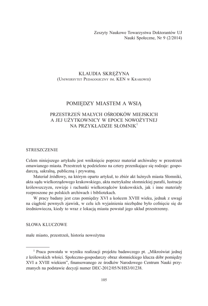 Zeszyty Naukowe Towarzystwa Doktorantów UJ Nauki Społeczne, Nr 9 (2/2014) KLAUDIA SKRĘŻYNA (Uniwersytet Pedagogiczny im. KEN w K rakowie) POMIĘDZY MIASTEM A WSIĄ PRZESTRZEŃ MAŁYCH OŚRODKÓW MIEJSKICH A JEJ UŻYTKOWNICY W EPOCE NOWOŻYTNEJ NA PRZYKŁADZIE SŁOMNIK1 STRESZCZENIE Celem niniejszego artykułu jest wniknięcie poprzez materiał archiwalny w przestrzeń omawianego miasta. Przestrzeń tę podzielono na cztery przenikające się rodzaje: gospodarczą, sakralną, publiczną i prywatną. Materiał źródłowy, na którym oparto artykuł, to zbiór akt luźnych miasta Słomniki, akta sądu wielkorządowego krakowskiego, akta metrykalne słomnickiej parafii, lustracje królewszczyzn, rewizje i rachunki wielkorządców krakowskich, jak i inne materiały rozproszone po polskich archiwach i bibliotekach. W pracy badany jest czas pomiędzy XVI a końcem XVIII wieku, jednak z uwagi na ciągłość pewnych zjawisk, w celu ich wyjaśnienia niezbędne było cofnięcie się do średniowiecza, kiedy to wraz z lokacją miasta powstał jego układ przestrzenny. SŁOWA KLUCZOWE małe miasto, przestrzeń, historia nowożytna 1 Praca powstała w wyniku realizacji projektu badawczego pt. „Mikroświat jednej z królewskich włości. Społeczno-gospodarczy obraz słomnickiego klucza dóbr pomiędzy XVI a XVIII wiekiem”, finansowanego ze środków Narodowego Centrum Nauki przyznanych na podstawie decyzji numer DEC-2012/05/N/HS3/01238. 105 Klaudia Skrężyna INFORMACJE O AUTORCE Klaudia Skrężyna Katedra Historii Nowożytnej Uniwersytet Pedagogiczny im. Komisji Edukacji Narodowej w Krakowie [email protected] UWAGI WSTĘPNE Miasto Słomniki było typowym przykładem ośrodka niewielkiej wielkości, zaliczanym przez Henryka Samsonowicza i Marię Bogucką do miast trzeciej kategorii, które na obszarze Rzeczypospolitej około 1500 roku stanowiły 33,6% wszystkich miast2. Słomniki leżą w Małopolsce, w odległości dwudziestu pięciu kilometrów od Krakowa w kierunku północnym. Przez cały okres nowożytny należały do powiatu proszowskiego. Jego specyfiką było sąsiedztwo krakowskiej metropolii, które zaważyło na profilu gospodarczym miasta. POŁOŻENIE MIASTA, TOPOGRAFIA I UKŁAD PRZESTRZENNY Nowożytne miasto Słomniki zawdzięcza swój układ przestrzenny lokacji z czasów króla Kazimierza Wielkiego3. Przestrzeń Słomnik przekształciła się wówczas z osady służebnej o owalnicowej formie4 w miasto posiadające zaplanowaną strukturę przestrzenną. Centrum osadnicze Słomnik usytuowano na wzgórzu oto2 W Rzeczypospolitej istniało wówczas dwieście trzydzieści jeden miast trzeciej kategorii wśród sześciuset osiemdziesięciu ośmiu wszystkich miast. Należy nadmienić, iż funkcjonowały jeszcze mniejsze ośrodki miejskie, zaliczane do czwartej kategorii, których liczba wynosiła trzysta sześćdziesiąt trzy (52,1% wszystkich miast). Łącznie małe miasta trzeciej i czwartej kategorii stanowiły 72% miast. M. Bogucka, H. Samsonowicz, Dzieje miast i mieszczaństwa w Polsce przedrozbiorowej, Wrocław–Warszawa– Kraków–Gdańsk–Łódź 1986, s. 115–119. 3 Pierwsza wzmianka o Słomnikach pochodzi z 1287 roku (Kodeks dyplomatyczny Małopolski, t. II, Kraków 1886, nr 506). Lokacja Słomnik miała miejsce pomiędzy 1340 a 1358 rokiem. W 1340 roku Kazimierz Wielki, fundując kaplicę Wniebowzięcia Najświętszej Marii Panny w Katedrze Krakowskiej, uposaża ją m.in. dziesięciną ze Słomnik. Dokument nie wspomina, jakoby Słomniki były wówczas miastem. Natomiast w 1358 roku Kazimierz Wielki poszerzył uposażenie istniejącego już miasta (Kodeks dyplomatyczny katedry krakowskiej Św. Wacława, t. I, Kraków 1874–1883, nr 169; Zbiór dokumentów małopolskich, cz. I, Warszawa–Wrocław–Kraków 1962, nr 86). 4 A. Berdecka, Lokacje i zagospodarowanie miast królewskich w Małopolsce za Kazimierza Wielkiego (1333–1370), Wrocław–Warszawa–Kraków–Gdańsk–Łódź 1982, s. 98. 106 Pomiędzy miastem a wsią. Przestrzeń małych ośrodków miejskich... czonym od południa i południowego zachodu doliną rzeki Szreniawy. W układzie przestrzennym zastosowano często występujący w XIV-wiecznych lokacjach małopolskich układ szachownicowo-centralny, o dziewięciu polach. Zgodnie z nim powierzchnię miasta podzielono na dziewięć kwadratów, z których środkowy stanowił rynek. Umieszczono go na części zbocza o łagodnym spadku. Z jego narożników wybiegały pary ulic. Przy pierzejach rynkowych i w narożnikach układu umieszczono bloki zabudowy, tak zwane działki siedliskowe. Jedno z dziewięciu pól zajął zespół kościoła parafialnego, usytuowany przy południowo-zachodnim narożniku rynku. Specyfiką słomnickiego układu przestrzennego była znaczna jak na tego typu ośrodek powierzchnia rynku, stanowiąca około 1,8 hektara, zaś powierzchnia całego centrum osadniczego Słomnik przeznaczonego pod zabudowę w czasach lokacji wynosiła jedynie 10 hektarów. Zaplecze rolnicze stanowiło obszar 30 hektarów. Miasto nie posiadało stałych umocnień ze względu na obronne położenie, na skarpie otoczonej rzeką i mokradłami5. Bloki zabudowy były jednofrontowe o znacznej głębokości, wynoszącej około 90 metrów6, co wskazuje na istnienie ogrodów na zapleczu działek siedliskowych7. Ta forma przestrzeni przetrwała od połowy wieku XIV do dziś8. Nadanie Słomnikom praw miejskich wiązało się z akcją osadniczą prowadzoną przez króla Kazimierza Wielkiego oraz z gospodarczym rozwojem Krakowa jako stolicy państwa9. Przez Słomniki w średniowieczu biegło kilka kluczowych dla gospodarki państwa dróg. Wiódł tędy międzynarodowy szlak z Węgier przez Kraków do Wielkopolski, Prus i dalej nad Bałtyk. Tak zwana via magna w średniowieczu była najważniejszą drogą handlową biegnącą przez Polskę10. Dla Słomnik ważne były także drogi solne, omijające ze względów ekonomicznych Kraków. Jedna z nich prowadziła z Bochni p