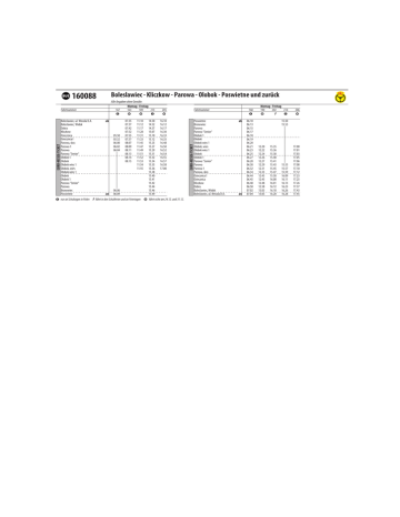 v 160088 Boleslawiec - Kliczkow - Parowa - Olobok - Poswietne und zurück Alle Angaben ohne Gewähr. Boleslawiec, ul. Wesola D.A. Boleslawiec, Widok Dobra Kliczkow Osiecznica Osiecznica l Parowa, skrz. Parowa 1 Parowa Parowa "Senior" Olobok 1 Olobok Olobok wies 1 Olobok, wies Olobok wies 1 Olobok Olobok 1 Parowa "Senior" Parowa Bronowiec Poswietne 167 Montag - Freitag 163 213 189 205 S W W S W 07.35 07.37 07.42 07.52 07.55 07.57 08.07 08.09 08.11 08.13 08.14 08.15 11.10 11.12 11.17 11.28 11.31 11.33 11.45 11.47 11.49 11.51 11.52 11.53 11.54 11.55 14.50 14.52 14.57 15.07 15.10 15.12 15.25 15.27 15.29 15.31 15.32 15.34 15.35 15.36 15.38 15.40 15.41 15.42 15.44 15.46 15.49 16.10 16.12 16.17 16.30 16.33 16.35 16.48 16.50 16.52 16.54 16.55 16.57 16.58 17.00 ab 05.50 05.52 06.00 06.02 06.04 an 06.06 06.09 S nur an Schultagen in Polen F fährt in den Schulferien und an Feiertagen W fährt nicht am 24.12. und 31.12. Fahrtnummer EURO-NEISSE-TICKET EURO-NEISSE-TICKET Fahrtnummer Poswietne Bronowiec Parowa Parowa "Senior" Olobok 1 Olobok Olobok wies 1 Olobok, wies Olobok wies 1 Olobok Olobok 1 Parowa "Senior" Parowa Parowa 1 Parowa, skrz. Osiecznica l Osiecznica Kliczkow Dobra Boleslawiec, Widok Boleslawiec, ul. Wesola D.A. ab an 168 Montag - Freitag 190 214 202 S W 06.10 06.13 06.15 06.17 06.18 06.19 06.20 06.21 06.23 06.25 06.27 06.28 06.30 06.32 06.34 06.44 06.45 06.48 06.58 07.02 07.04 F S 206 W 15.50 15.53 12.20 12.22 12.24 12.26 12.27 12.29 12.31 12.33 12.43 12.45 12.48 12.58 13.03 13.05 15.35 15.36 15.38 15.40 15.41 15.43 15.45 15.47 15.58 16.00 16.01 16.12 16.18 16.20 15.55 15.57 15.59 16.09 16.11 16.13 16.23 16.26 16.28 17.00 17.01 17.03 17.05 17.06 17.08 17.10 17.12 17.23 17.25 17.26 17.37 17.43 17.45