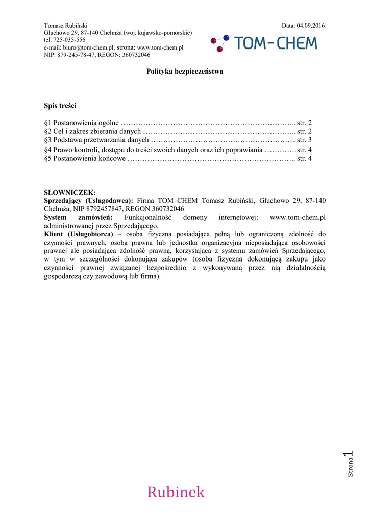 Tomasz Rubiński Głuchowo 29, 87-140 Chełmża (woj. kujawsko-pomorskie) tel. 725-035-556 e-mail: [email protected], strona: www.tom-chem.pl NIP: 879-245-78-47, REGON: 360732046 Data: 04.09.2016 Polityka bezpieczeństwa Spis treści §1 Postanowienia ogólne …………………………………………………………….. str. 2 §2 Cel i zakres zbierania danych …………………………………………………….. str. 2 §3 Podstawa przetwarzania danych ………………………………………………….. str. 3 §4 Prawo kontroli, dostępu do treści swoich danych oraz ich poprawiania …………. str. 4 §5 Postanowienia końcowe ………………………………………………………….. str. 4 Strona 1 SŁOWNICZEK: Sprzedający (Usługodawca): Firma TOM–CHEM Tomasz Rubiński, Głuchowo 29, 87-140 Chełmża, NIP 8792457847, REGON 360732046 System zamówień: Funkcjonalność domeny internetowej: www.tom-chem.pl administrowanej przez Sprzedającego. Klient (Usługobiorca) – osoba fizyczna posiadająca pełną lub ograniczoną zdolność do czynności prawnych, osoba prawna lub jednostka organizacyjna nieposiadająca osobowości prawnej ale posiadająca zdolność prawną, korzystająca z systemu zamówień Sprzedającego, w tym w szczególności dokonująca zakupów (osoba fizyczna dokonującą zakupu jako czynności prawnej związanej bezpośrednio z wykonywaną przez nią działalnością gospodarczą czy zawodową lub firma). Rubinek Tomasz Rubiński Głuchowo 29, 87-140 Chełmża (woj. kujawsko-pomorskie) tel. 725-035-556 e-mail: [email protected], strona: www.tom-chem.pl NIP: 879-245-78-47, REGON: 360732046 Data: 04.09.2016 Rubinek Strona §2 Cel i zakres zbierania danych 1. Celem zbierania danych osobowych przez Administratora jest: 1.1.1. nawiązanie, ukształtowanie treści, zmiana, wykonanie lub rozwiązanie stosunku umownego między Sprzedawcą (Usługodawcą) i Klientem (Usługobiorcą) polegającego na wykonywaniu zamówień dokonywanych poprzez System zamówień Sprzedawcy w przypadku bezpośredniego zakupu produktów. 1.2. udokumentowanie stosunków umownych, o których mowa w pkt. 1.1. w celach dowodowych przez okres przedawnienia roszczeń z nimi związanych. 1.3. marketing bezpośredni własnych produktów Administratora. 2. W przypadku Klientów, którzy korzystają z płatności elektronicznych Administrator przekazuje zebrane dane osobowe Klientów jedynie agentowi rozliczeniowemu wybranemu przez Klienta i to jedynie w takim zakresie jaki niezbędny jest do dokonania przez Klienta płatności za ich pośrednictwem. Agentem rozliczeniowym dostępnym w Systemie zamówień są: 2.1. Przelewy24 - spółka Dialcom24 Sp. z o.o. z siedzibą w Poznaniu (adres siedziby: ul. Kanclerska 15; 60-327 Poznań) wpisana do Rejestru Przedsiębiorców Krajowego Rejestru Sądowego pod numerem 0000306513, akta rejestrowe przechowywane przez Sąd Rejonowy Poznań – VIII Wydz. Gospodarczy Krajowego Rejestru Sądowego, kapitał zakładowy w wysokości 1.697.000 zł w całości opłaconym, NIP: 781-173-38-52. 2.2. Paypal.pl – spółka PayPal (Europe) S.à r.l. & Cie, S.C.A., 5. kondygnacja 22–24 Boulevard Royal, L-2449, Luxembourg. 2.3. Dotpay S.A., z siedzibą w Krakowie, 30-552 Kraków, przy ulicy Wielickiej 72, zarejestrowana przez Sąd Rejonowy Kraków-Śródmieście w Krakowie, Wydział XI Gospodarczy Krajowego Rejestru Sądowego pod numerem 0000296790, posiadająca numer NIP 634-26-61-860, NIP EU PL6342661860, numer REGON 240770255 oraz kapitał zakładowy w wysokości 4.000.000,00 PLN, opłacony w całości gotówką. 3. W przypadku Klientów, którzy korzystają z usług dostawy Produktu do Klienta Administrator przekazuje zebrane dane osobowe Klientów w zakresie niezbędnym dla dokonania dostawy wybranemu przewoźnikowi: 2 §1 Postanowienia ogólne 1. Administratorem danych osobowych zbieranych za pośrednictwem Systemu zamówień jest firma TOM-CHEM Tomasz Rubiński, NIP 8792457847, REGON 360732046, adres korespondencyjny: Głuchowo 29, 87-140 Chełmża zwana dalej „Administratorem” i będąca Sprzedawcą w Systemie zamówień. 2. Dane osobowe Klienta są przetwarzane zgodnie z ustawą o ochronie danych osobowych z dnia 29 sierpnia 1997 r. (Dz.U. Nr 133, poz. 883 ze zm.) oraz ustawą o świadczeniu usług drogą elektroniczną z dnia 18 lipca 2002 r. (Dz.U. Nr 144, poz. 1204 ze zm.). 3. Administrator dokłada szczególnej staranności w celu ochrony interesów osób, których dane dotyczą, a w szczególności zapewnia, że zbierane przez niego dane są przetwarzane zgodnie z prawem; zbierane dla oznaczonych, zgodnych z prawem celów i niepoddawane dalszemu przetwarzaniu niezgodnemu z tymi celami; merytorycznie poprawne i adekwatne w stosunku do celów, w jakich są przetwarzane oraz przechowywane w postaci umożliwiającej identyfikację osób, których dotyczą, nie dłużej niż jest to niezbędne do osiągnięcia celu przetwarzania. Tomasz Rubiński Głuchowo 29, 87-140 Chełmża (woj. kujawsko-pomorskie) tel. 725-035-556 e-mail: [email protected], strona: www.tom-chem.pl NIP: 879-245-78-47, REGON: 360732046 Data: 04.09.2016 3.1. DHL Express (Poland) Sp. z o.o. z siedzibą w Warszawie, wpisana do rejestru przedsiębiorców Krajowego Rejestru Sądowego prowadzonego przez Sąd Rejonowy dla m.st. Warszawy XIII Wydział Gospodarczy Krajowego Rejestru Sądowego pod numerem KRS nr 47237, kapitał zakładowy 21.892.500 PLN, NIP 527-00-22-391. 4. Administrator przetwarza następujące dane osobowe: 4.1. Klientów dokonujących bezpośredniego zakupu: imię i nazwisko; adres poczty elektronicznej; numer telefonu kontaktowego; adres (ulica, numer domu, numer lokalu, kod pocztowy, miejscowość, kraj). 4.2. W wypadku Klientów reprezentujących podmiot gospodarczy Administrator przetwarza dodatkowo nazwę firmy oraz numer identyfikacji podatkowej (NIP). 5. Podanie danych osobowych, o których mowa w §4, pkt. 4 jest niezbędne do świadc