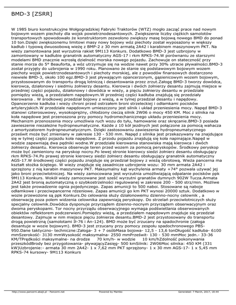 BMD-3 [ZSRR] W 1985 biuro konstrukcyjne Wołgogradzkiej Fabryki Traktorów (WTZ) mogło zacząć prace nad nowym bojowym wozem piechoty dla wojsk powietrznodesantowych. Zwiększenie liczby ciężkich samolotów transportowych spowodowało że konstruktorom zezwolono zwiększy masę bojową nowego BMD do ponad 10 ton.Dzięki zwiększonemu limitowi masy nowy bojowy wóz piechoty został wyposażony w większy kadłub i typową dwuosobową wieżę z BMP-2 z 30 mm armatą 2A42 i karabinem maszynowym PKT. Na wieży zamontowana jest wyrzutnia rakiet 9M113 Konkurs. Dodatkowo BMD-3 jest uzbrojony w zamontowany w kadłubie granatnik automatyczny AGS-17 i rkm RPKS-74.W porównaniu ze starszymi modelami BMD znacznie wzrosłą dzielność morska nowego pojazdu. Zachowuje on stateczność przy stanie morza do 5° Beauforta, a wóz utrzymuje się na wodzie nawet przy 30% utracie pływalności.BMD-3 został przyjęty do uzbrojenia w 1990 roku. Planowano że stanie się podstawowym bojowym wozem piechoty wojsk powietrznodesantowych i piechoty morskiej, ale z powodów finansowych dostarczono niewiele BMD-3, około 100 egz.BMD-3 jest pływającym opancerzonym, gąsienicowym wozem bojowym, przystosowanym do transportu drogą lotniczą i desantowania przez zrzut.Załogę BMD-3 tworzy dowódca, kierowca, działonowy i siedmiu żołnierzy desantu. Kierowca i dwóch żołnierzy desantu zajmują miejsce w przedniej części pojazdu, działonowy i dowódca w wieży, a pięciu żołnierzy desantu w przedziale pomiędzy wieżą, a przedziałem napędowym.W przedniej części kadłuba znajdują się przedziały kierowania . W środkowej przedział bojowy z wieżą, a w tylnej przedział desantu i napędowy. Opancerzenie kadłuba i wieży chroni przed ostrzałem broni strzeleckiej i odłamkami pocisków artyleryjskich.W przedziale napędowym umieszczony jest silnik i układ przeniesienia mocy. Napęd BMD-3 stanowi czterosuwowy, wysokoprężny, chłodzony cieczą silnik 2W06 o mocy 450 KM. Moc z silnika na koła napędowe jest przenoszona przy pomocy hydromechanicznego układu przeniesienia mocy. Mechanizm przenoszenia mocy umożliwia ruch wozu do tyłu, hamowanie oraz skręcanie.BMD-3 posiada zawieszenie niezależne hydropneumatyczne. Każde z 10 kół jezdnych jest połączone za pomocą wahacza z amortyzatorem hydropneumatycznym. Dzięki zastosowaniu zawieszenia hydropneumatycznego prześwit może być zmieniany w zakresie 130 - 530 mm. Napęd z silnika jest przekazywany na znajdujące się w tylnej części pojazdu koła napędowe. Z przodu pojazdu znajdują się koła napinające.Napęd w wodzie zapewniają dwa pędniki wodne.W przedziale kierowania stanowiska mają kierowca i dwóch żołnierzy desantu. Kierowca obserwuje teren przed wozem za pomocą peryskopów. Środkowy peryskop może być zamieniony na peryskop nocny.Po lewej stronie kierowcy siedzi żołnierz desantu obsługujący rkm RPKS-74.Po prawej stronie kierowcy siedzi żołnierz desantu obsługujący granatnik automatyczny AGS-17.W środkowej części pojazdu znajduje się przedział bojowy z wieżą obrotową. Wieża pancerna ma kształt stożka ściętego. W wieży znajduje się zasadnicze uzbrojenie wozu: 30 mm armata 2A42 i sprzężony z nią karabin maszynowy PKT. Maksymalny kąt wychylenia armaty +74° pozwala używać jej jako broni przeciwlotniczej. Na wieży zamocowana jest wyrzutnia umożliwiającą odpalanie pocisków ppk 9M113 Konkurs. Wokół wieży zamocowane jest sześć wyrzutni granatów dymnych 902W Tucza.Armata 2A42 jest bronią automatyczną o szybkostrzelności regulowanej w zakresie 200 - 500 strz/min. Możliwe jest także prowadzenie ognia pojedynczego. Zapas amunicji to 500 naboi. Stosowane są naboje odłamkowe i przeciwpancerne rdzeniowe. Zapas amunicji go km PKT wynosi 20000 sztuk. Dodatkowo w wozie przewożone są ppk Konkurs.Do celowania służy działonowemu dzienno-nocny celownik , a obserwację poza polem widzenia celownika zapewniają peryskopy. Do strzelań przeciwlotniczych służy specjalny celownik.Dowódca dysponuje przyrządem dzienno-nocnym przyrządem obserwacyjnym oraz dwoma peryskopami. Tor nocny przyrządu obserwacyjnego wymaga podświetlania obserwowanych obiektów reflektorem podczerwieni.Pomiędzy wieżą, a przedziałem napędowym znajduje się przedział desantowy. Zajmuje w nim miejsce pięciu żołnierze desantu.BMD-2 jest przystosowany do transportu drogą powietrzną (samolotami Ił-76 i An-124). BMD może być zrzucany na spadochronie (załoga desantuje w wozie bojowym). BMD-3 jest zrzucany przy pomocy zespołu spadochronowego PBS950.Dane taktyczno- techniczne:Załoga- 3 + 7 osóbMasa bojowa- 12,5 - 13,6 tonDługość kadłuba- 6100 mmSzerokość- 3130 mmWysokość maksymalna- 2550 mmPrześwit- 130 - 530 mmMoc jedn.- 33-36 KM/TPrędkości maksymalne- na drodze 70 km/h- w wodzie 10 km/hZdolność pokonywania przeszkódBrody bez przygotowania- pływającyZasięg- 500 kmSilnik: 2W06Moc silnika: 450 KM (331 kW)Uzbrojenie:- armata 30 mm 2A42- 1 x 7,62 mm PKT sprzężony- 1 x 30 mm AGS-17- 1 x 5,45 mm RPKS-74 kursowy- 9M113 Konkurs http://www.pancerni.abajt.pl - Pancerni.net Powered by Mambo Generated: 7 March, 2017, 18:44