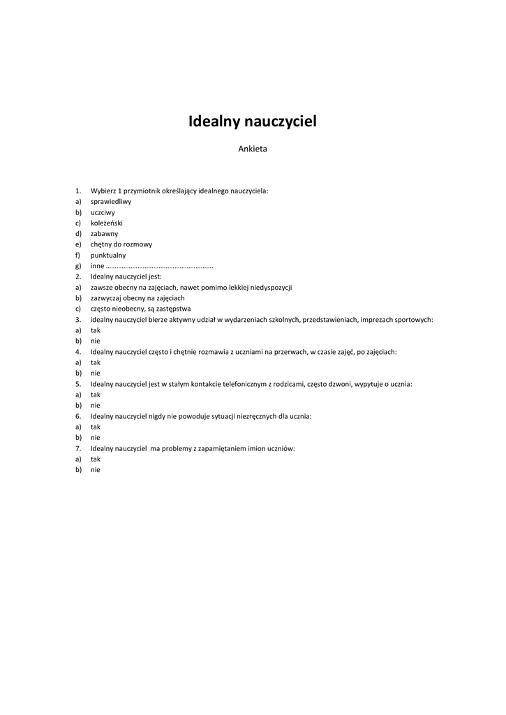 Idealny nauczyciel Ankieta 1. a) b) c) d) e) f) g) 2. a) b) c) 3. a) b) 4. a) b) 5. a) b) 6. a) b) 7. a) b) Wybierz 1 przymiotnik określający idealnego nauczyciela: sprawiedliwy uczciwy koleżeński zabawny chętny do rozmowy punktualny inne ……………………………………………………. Idealny nauczyciel jest: zawsze obecny na zajęciach, nawet pomimo lekkiej niedyspozycji zazwyczaj obecny na zajęciach często nieobecny, są zastępstwa idealny nauczyciel bierze aktywny udział w wydarzeniach szkolnych, przedstawieniach, imprezach sportowych: tak nie Idealny nauczyciel często i chętnie rozmawia z uczniami na przerwach, w czasie zajęć, po zajęciach: tak nie Idealny nauczyciel jest w stałym kontakcie telefonicznym z rodzicami, często dzwoni, wypytuje o ucznia: tak nie Idealny nauczyciel nigdy nie powoduje sytuacji niezręcznych dla ucznia: tak nie Idealny nauczyciel ma problemy z zapamiętaniem imion uczniów: tak nie WYNIKI ANKIETY DLA UCZNIÓW PUBLICZNEGO GIMNAZJUM W PAJĘCZNIE definiującej idealnego nauczyciela I. Ankietę przeprowadzono w Publicznym Gimnazjum w Pajęcznie 08.10.2012r. i 10.10.2012r. II. Ankietę wypełniło 28 uczniów Publicznego Gimnazjum w Pajęcznie, z klas 2a, 3a i 3b. III. Ankieta zawierała 7 pytań, wszystkie pytania miały charakter zamknięty. IV. Wyniki dotyczące poszczególnych pytań: Pytanie 1: „Wybierz 1 przymiotnik określający idealnego nauczyciela”: h) i) j) k) l) m) sprawiedliwy uczciwy koleżeński zabawny chętny do rozmowy punktualny n) inne ……………………………………………………. Odpowiedź: a – 21 /75% b – 2 /7% c – 1 /3,6% d – 3 /10,7% e – 1 /3,6% a b c d e 75% uczniów uważa, że spośród wszystkich cech charakteryzujących nauczyciela najbardziej cenną jest sprawiedliwość. Pytanie 2: „Idealny nauczyciel jest”: d) zawsze obecny na zajęciach, nawet pomimo lekkiej niedyspozycji e) zazwyczaj obecny na zajęciach f) często nieobecny, są zastępstwa Odpowiedź: a – 17 / 60,71% b – 11 /39, 29% a b 60,71% uczniów jest zdania, że idealny nauczyciel jest zawsze obecny na zajęciach, nawet pomimo lekkiej niedyspozycji. Pytanie 3 „idealny nauczyciel bierze aktywny udział w wydarzeniach szkolnych, przedstawieniach, imprezach sportowych”: c) tak d) nie Odpowiedź: a – 25 /96,15% b – 1 / 3,85% a b 96,15% sądzi, że idealny nauczyciel powinien brać aktywny udział w wydarzeniach szkolnych, przedstawieniach, imprezach sportowych. Pytanie 4 „Idealny nauczyciel często i chętnie rozmawia z uczniami na przerwach, w czasie zajęć, po zajęciach”: c) tak d) nie Odpowiedź: a – 26 / 96,3% b – 1 /3,7% a b 96,3% uczniów uważa, idealny nauczyciel często i chętnie rozmawia z uczniami na przerwach, w czasie zajęć, po zajęciach. Pytanie 5” Idealny nauczyciel jest w stałym kontakcie telefonicznym z rodzicami, często dzwoni, wypytuje o ucznia”: c) tak d) nie Odpowiedź: a – 20 / 71,43% b – 8 / 28,57% a b 71,43% uczniów jest zdania, że idealny nauczyciel powinien być w stałym kontakcie telefonicznym z rodzicami, często dzwoniąc i wypytując o ucznia. Pytanie 6 „Idealny nauczyciel nigdy nie powoduje sytuacji niezręcznych dla ucznia”: c) tak d) nie Odpowiedź: a – 26 /92,86% b – 2 /7,14% a b 92,86% uczniów jest zdania, iż idealny nauczyciel nigdy nie powoduje sytuacji niezręcznych dla ucznia. Pytanie 7: „Idealny nauczyciel ma problemy z zapamiętaniem imion uczniów”: c) tak d) nie Odpowiedź: a–0 b – 28 / 100% b Wszyscy uczniowie twierdzą jednomyślnie, że idealny nauczyciel szybko zapamiętuje imiona uczniów. WNIOSKI Idealny nauczyciel : 1. jest sprawiedliwy, 2. jest zawsze obecny na zajęciach, nawet pomimo lekkiej niedyspozycji, 3. bierze aktywny udział w wydarzeniach szkolnych, przedstawieniach, imprezach sportowych, 4. często i chętnie rozmawia z uczniami na przerwach, w czasie zajęć, po zajęciach, 5. jest w stałym kontakcie telefonicznym z rodzicami, często dzwoni, wypytuje o ucznia, 6. nigdy nie powoduje sytuacji niezręcznych dla ucznia, 7. szybko zapamiętuje imiona uczniów.