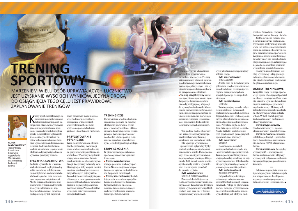 D O D AT E K T R E N E R A TRENING SPORTOWY MARZENIEM WIELU OSÓB UPRAWIAJĄCYCH ŁUCZNICTWO JEST UZYSKANIE WYSOKICH WYNIKÓW. JEDYNĄ DROGĄ DO OSIĄGNIĘCIA TEGO CELU JEST PRAWIDŁOWE ZAPLANOWANIE TRENIGÓW K ROBERT MARCINKIEWICZ Trener I klasy łucznictwa. Kierownik wyszkolenia WarszawskoMazowieckiej Federacji Sportu 14 GRUDZIEŃ 2011 ażdy sport charakteryzuje się pewnymi uwarunkowaniami determinującymi sposób treningu oraz okres, w którym wymagana jest najwyższa forma sportowa. Łucznictwo jest dyscypliną sportu o charakterze wytrzymałościowo-siłowym. Struktura ruchów wykonywanych przez łucznika wymaga jednak doskonalenia techniki. Podczas strzelania zawodnik nieustannie współpracuje z łukiem, odpoczywając od niego wyłącznie pomiędzy seriami. SPECYFIKA ŁUCZNICTWA Badania wykazały, że w warunkach stresowych najlepiej radzą sobie zawodnicy z dobrym czuciem mięśniowo-ruchowym (dokładnością ruchu oraz minimalnym napięciem mięśniowym). Aby to osiągnąć konieczne jest stosowanie ćwiczeń wytrzymałościowych z elementami siły. Poprawa tej ostatniej powinna następować przy jak najmniej- szym przyroście masy mięśniowej. Nadmiar pracy siłowej, szczególnie w ćwiczeniach wszechstronnych, ujemnie wpływa na poziom techniki, gibkości i koordynacji ruchowej. PRZYGOTOWANIE PSYCHICZNE Wraz z akcentowaniem elementów bezpośredniej rywalizacji coraz większy nacisk kładzie się na przygotowanie psychiczne zawodników. W obecnym systemie rozgrywania zawodów łuczniczych zmienia się charakter rywalizacji. Zaczynamy od rundy kwalifikacyjnej, a żeby wygrać turniej musimy przebrnąć przez szereg indywidualnych pojedynków. Powoduje to wzrost napięcia psychicznego w miarę pokonywania poszczególnych etapów zawodów. Zmienia się więc stopień intensywności pracy. Podczas finałów występuje najwyższy poziom emocji startowych. TRENING DZIŚ Coraz większa wiedza o ludzkim organizmie pozwala na bardziej efektywnie planowanie treningów w danej dyscyplinie. Składa się na to kontrola procesu treningowego, żywienie sportowców i co bardzo istotne postęp związany ze sprzętem specjalistycznym, jego dostępnością i obsługą. ETAPY SZKOLENIA W pierwszym etapie szkolenia sportowego możemy wyróżnić trzy etapy: Trening wszechstronny rozwija potencjał ruchowy sportowca. Nie ma on jednak bezpośredniego wpływu na kształtowanie dyspozycji łuczniczych. Trening ukierunkowany kształtuje przede wszystkim specjalistyczne predyspozycje łucznicze. Wykorzystuje się tu celowo dobrane ćwiczenia rozwijające cechy przygotowania sprawnościowego. Dobór ćwiczeń WWW.POLSKIELUCZNICTWO.PL i charakterystyka ich realizacji uwzględnia odwzorowanie warunków startowych. Trening ukierunkowany stanowi ogniwo między treningiem wszechstronnym, a specjalistycznym i nie wywieraja bezpośredniego wpływu na przygotowanie startowe. Trening specjalistyczny kształtuje specyficzne sprawności i predyspozycje łucznicze, zgodnie z zasadą postępującej adaptacji do wymogów startowych. Mieszczą się tu ćwiczenia startowe, specjalne ćwiczenia sprawności z odwzorowaniem ruchu startowego, specjalne ćwiczenia wspomagające, nauczanie i doskonalenie techniki w różnych warunkach. *** Ten podział będzie obowiązywał każdego rozpoczynającego usystematyzowany trening sportowca bez względu na wiek. Dla lepszego wyobrażenia i uproszczenia optymalny byłby podział posługując się etapami nauczania w szkole. Pamiętać należy, że nie da się przejść do następnego etapu pomijając któryś z nich. Jeśli nawet tak się stanie, szybko wyjdą braki w wyszkoleniu i trzeba będzie powrócić do punktu wyjścia. Cykl wszechstronny SZKOŁA PODSTAWOWA Zawodnik kształtuje cechy tj.siłę, szybkość, koordynację, wytrzymałość. Ten element treningu będzie występował we wszystkich cyklach jako baza np. w formie rozgrzewki czy w grach zespoło- wych jako trening uzupełniający kolejne etapy. Cykl ukierunkowany GIMNAZJUM Jest to czas na świadome przygotowanie z wykorzystaniem różnorodnych form treningu i przyrządów zaadaptowanych do specjalistycznego treningu technicznego. Cykl specjalistyczny LICEUM Trening mający na celu nabycie umiejętności związanych z udziałem w zawodach odpowiadających kategorii wiekowej, a co za tym idzie dystansu i opanowaniem odpowiednio skutecznego łuku. Przekłada się to na twardość łuku i prawidłową technikę. Nauka taktyki i kształtowanie cech psychicznych pomagających opanować stres startowy. Cykl wyczynowy STUDIA Doskonalenie nabytych umiejętności technicznych, siły i wytrzymałości specjalistycznej. Trening cech psychicznych ułatwiających walkę sportową na najwyższym poziomie. Udoskonalanie sprzętu pozwalające osiągać jak najwyższe wyniki spotowe. Cykl profesjonalizacji ZAWODOWSTWO Indywidualizacja treningu związanego z dopasowaniem szczegółów technicznych i organizacyjnych. Polega na planowaniu startów z długim wyprzedzeniem np. cykl olimpijski, gdzie końcowym efektem jest zdobycie mist- rzostwa. Pośrednimi etapami będą mistrzostwa Europy i świata. Jest to pewnego rodzaju sito z coraz mniejszymi oczkami, zatrzymujące osoby mniej utalentowane lub poświęcające zbyt mało czasu na osiąganie kolejnych etapów zaawansowania sportowego. Większość zawodników trenując dowolny sport nie przechodzi do etapu wyczynowego, zatrzymując się często na wysokim poziomie wyszkolenia specjalistycznego. Osobnym zagadnieniem jest etap wyczynowy i etap profesjonalizacji, gdzie mamy doczynienia z indywidualnym podejściem do planowania treningu. OKRESY TRENINGOWE Wszystkie etapy treningu sportowego będzie obowiązywał podział na okresy treningowe. Czas trwania okresów wynika z kalendarza imprez, wskazującego terminy uzyskania formy. Możemy rok kalendarzowy podzielić na starty na otwartym powietrzu i starty w hali. W tych dwóch przypadkach wyróżniamy następujące okresy i podokresy: Okr