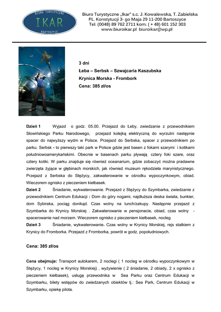 3 dni Łeba – Serbsk – Szwajcaria Kaszubska Krynica Morska - Frombork Cena: 385 zł/os Dzień 1 Wyjazd o godz. 05.00. Przejazd do Łeby, zwiedzanie z przewodnikiem Słowińskiego Parku Narodowego, przejazd kolejką elektryczną do wyrzutni następnie spacer do najwyższy wydm w Polsce. Przejazd do Serbska, spacer z przewodnikiem po parku. Serbsk - to pierwszy taki park w Polsce gdzie jest basen z fokami szarymi i kotikami południowoamerykańskimi. Obecnie w basenach parku pływają cztery foki szare, oraz cztery kotiki. W parku znajduje się również oceanarium, gdzie zobaczyć można pradawne zwierzęta żyjące w głębinach morskich, jak również muzeum rękodzieła marynistycznego. Przejazd z Serbska do Stężycy, zakwaterowanie w ośrodku wypoczynkowym, obiad. Wieczorem ognisko z pieczeniem kiełbasek. Dzień 2 Śniadanie, wykwaterowanie. Przejazd z Stężycy do Szymbarka, zwiedzanie z przewodnikiem Centrum Edukacji : Dom do góry nogami, najdłuższa deska świata, bunkier, dom Sybiraka, pociąg donikąd. Czas wolny na lunch/zakupy. Następnie przejazd z Szymbarka do Krynicy Morskiej . Zakwaterowanie w pensjonacie, obiad, czas wolny - spacerowanie nad morzem. Wieczorem ognisko z pieczeniem kiełbasek, nocleg Dzień 3 Śniadanie, wykwaterowanie. Czas wolny w Krynicy Morskiej, rejs statkiem z Krynicy do Fromborka. Przejazd z Fromborka, powrót w godz. popołudniowych. Cena: 385 zł/os Cena obejmuje: Transport autokarem, 2 noclegi ( 1 nocleg w ośrodku wypoczynkowym w Stężycy, 1 nocleg w Krynicy Morskiej) , wyżywienie ( 2 śniadanie, 2 obiady, 2 x ognisko z pieczeniem kiełbasek), usługę przewodnika w Sea Parku oraz Centrum Edukacji w Szymbarku, bilety wstępów do zwiedzanych obiektów tj.: Sea Park, Centrum Edukacji w Szymbarku, opiekę pilota.