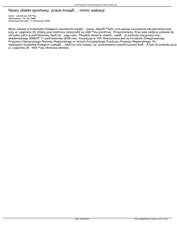 Portal Kolegium Nauczycielskiego w Bielsku-Bia�ej Nowy obiekt sportowy: prace trwajÄ… mimo wakacji Autor: JarosÅ‚aw ZiÄ™ba Wednesday, 19 July 2006 Zmieniony Monday, 11 December 2006 Mimo wakacji w budynkach Kolegium nieustannie trwajÄ… prace. NajwiÄ™kszy ruch panuje na budowie sali gimnastycznej przy ul. Legionów 25. Efekty prac można zobaczyć na zdjÄ™ciu poniżej. Przypominamy, że sala oddana zostanie do użytku już w październiku bieżącego roku. Oficjalne otwarcie obiektu nastÄ…pi podczas inauguracji roku akademickiego 2006/07 11 października 2006 roku. Inwestycja w 75% finansowana jest ze Å›rodków Zintegrowanego Programu Operacyjnego Rozwoju Regionalnego w ramach Europejskiego Funduszu Rozwoju Regionalnego. Po wakacjach studentów Kolegium czekajÄ… także inne zmiany, np. przeniesienie wypożyczalni książek do budynku przy ul. Legionów 25. WiÄ™cej informacji wkrótce. _PDF_POWERED _PDF_GENERATED 7 March, 2017, 17:44