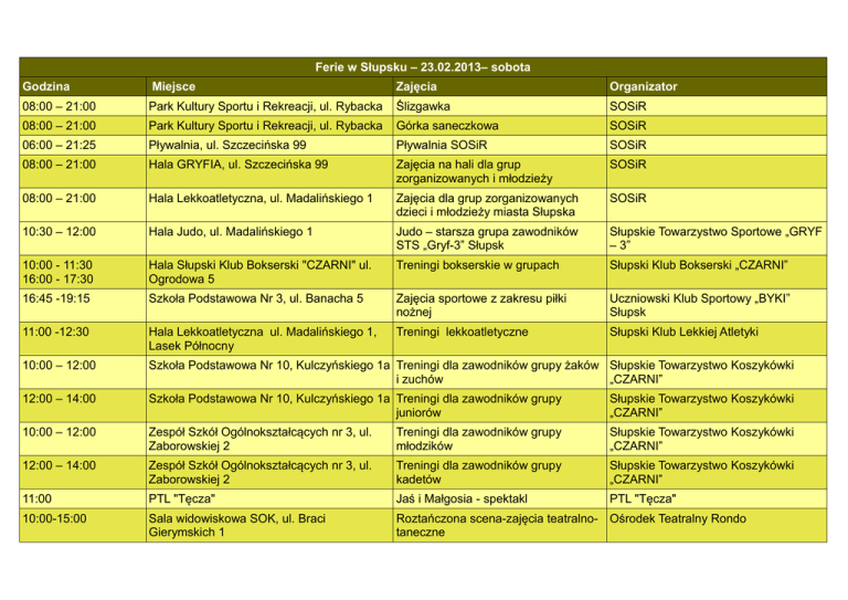 Ferie w Słupsku – 23.02.2013– sobota Godzina Miejsce Zajęcia