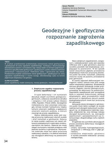 Zenon Pilecki Akademia Górniczo-Hutnicza Instytut Gospodarki Surowcami Mineralnymi i Energią PAN, Kraków Edward Popiołek Akademia Górniczo-Hutnicza, Kraków Geodezyjne i geofizyczne rozpoznanie zagrożenia zapadliskowego TREŚĆ: W artykule przedstawiono problematykę zastosowania metod geofizycznych i geodezyjnych do oceny zagrożenia zapadliskowego, wynikającą z dotychczasowego doświadczenia autorów w prowadzeniu tego rodzaju badań na terenach pogórniczych. Omówiono specyfikę badań geofizycznych i geodezyjnych z punktu widzenia możliwości pomiarowych i interpretacyjnych. Podkreślono zalety i ograniczenia obu metod. Przedstawiono przykład zastosowania metod geofizycznych i geodezyjnych do oceny zagrożenia zapadliskowego w rejonie starego, zlikwidowanego szybu na terenie pogórniczym eksploatacji rud galmanu. SŁOWA KLUCZOWE: proces zapadliskowy, model numeryczny, metody geodezyjne, metody geofizyczne 1.Empiryczne aspekty rozpoznania procesu zapadliskowego O typie deformacji i ich wymiarach decyduje zespół czynników geologicznogórniczych, zwłaszcza zawodnienie ośrodka i związany z nim proces sufozji (Goszcz 1996, Popiołek i Pilecki 2005). Szczególnie niebezpieczny stan powstaje wówczas, gdy istnieje kontakt hydrauliczny między luźnymi utworami nadkładu a spękanymi utworami skalnymi podłoża, w którym rozwinął się proces zapadliskowy. Wpływ oddziaływania wody jest częstą przyczyną reaktywacji starych pustek i stref rozluźnień w górotworze. Dotyczy to także pustek częściowo lub nawet całkowicie podsadzonych materiałem drobnoziarnistym lub ilastym. Materiał ten może ulegać wymywaniu wskutek przepływu wód poprzez szczeliny w górotworze. Wymywanie materiału może być także przyczyną reaktywacji uskoków, a w efekcie tworzenia się nieciągłych deformacji na powierzchni terenu. 34 Nieco odrębnym zagadnieniem, związanym z oddziaływaniem wody jest zjawisko infiltracji wód w głąb górotworu poprzez szczeliny powstałe nad eksploatacją i propagujące ku powierzchni. W ten sposób nawet stosunkowo głęboko prowadzona eksploatacja może być przyczyną powstania pustki lub strefy rozluźnień, położonej znacznie wyżej od poziomu prowadzenia prac górniczych. W ocenie zagrożeń deformacjami nieciągłymi należy zawsze brać pod uwagę wpływ eksploatacji głębokiej. Eksploatacja narusza górotwór powodując trwałe przerwania ciągłości warstw geologicznych, prowadząc do deformacji na powierzchni. Zagrożenie zapadliskowe jest szczególnie duże w rejonach historycznej, płytkiej eksploatacji, gdyż prowadzenie robót górniczych w sąsiedztwie starych pustek poeksploatacyjnych może być przyczyną ich aktywacji. Aktywacja starej istniejącej w górotworze pustki może także wystąpić na skutek nadmiernych obciążeń statycznych wynikających np. ze składowania materiału nasypów, składowisk itp. oraz różnego rodzaju obciążeń dynamicznych, np. wstrząsów sejsmicznych i parasejsmicznych czy intensywnego i długotrwałego ruchu ciężkich pojazdów. W ogólności do czynników aktywujących proces powstania deformacji nieciągłych należy zaliczyć: −zmiany warunków hydrogeologicznych, związanych z infiltracją wód w głąb górotworu, −osłabienie właściwości górotworu w wyniku procesów wietrzenia i procesu reologicznego, Bezpieczeństwo Pracy i Ochrona Środowiska w Górnictwie nr 6(190)/2010 −utrata podporności obudowy starych, płytko występujących wyrobisk, −zniszczenie zabezpieczeń i obudowy starych szybów i szybików, −rozwój pustek w wyniku przemieszczenia materiału zasypowego w niewłaściwie zlikwidowanych szybach i szybikach, −dynamiczne obciążanie górotworu drganiami komunikacyjnymi, wstrząsami górniczymi itp., −nadmierne obciążenia statyczne terenu. W Polsce, problemy z występowaniem deformacji nieciągłych na powierzchni terenów pogórniczych związane są z płytką eksploatacją węgla kamiennego, rud metali, surowców skalnych oraz złóż soli dokonanej w minionych dziesięcioleciach, a nawet kilkuwiecznej przeszłości. Zagrożenie deformacjami nieciągłymi powoduje, że tereny pogórnicze mają ograniczone możliwości zabudowy. Jednocześnie ciągły rozwój budownictwa wymusza szukanie rozwiązań w kierunku uzdatniania terenów pogórniczych. Wymaga to zastosowania efektywnych metod oceny, m.in. zagrożenia deformacjami nieciągłymi, w sposób szybki i ekonomiczny. 2.Komplementarność geodezyjnego i geofizycznego rozpoznania zagrożenia zapadliskowego Specyfika badań geofizycznych i geodezyjnych, z punktu widzenia możliwości pomiarowych i interpretacyjnych, wymaga odpowiednio wyraźnych zmian właściwości fizycznych ośrodka. Zmiany te powinny być większe od błędów i niepewności pomiaru przeprowadzonego w konkretnych warunkach. W przypadku metod geofizycznych obiektem rozpoznania są pustki i strefy rozluźnień związane z procesem zapadliskowym (rys. 2.1). Granica obszaru spękanego na ogół nie jest jednoznacznie wyznaczalna, gdyż ma charakter przejściowy związany ze zmianą intensywności spękań. Ma to również wpływ na obraz geofizyczny tej strefy. Spękania wokół pustki powodują na ogół obniżenie gęstości objętościowej ośrodka, spadek prędkości fal sejsmicznych czy zmianę stałej dielektrycznej, dając anomalny efekt w polu geofizycznym. Nie ulega jednak wątpliwości, że dla rzetelnego i bardziej wiarygodnego rozpoznania zagrożenia deformacjami nieciągłymi należy stosować różne metody geofizyczne. W zależności o rodzaju zadania badawczego metody geofizyczne dają rezultaty, których nie można osiągnąć innymi metodami. Metody geodezyjne stosowane do rozpoznania zagrożenia deformacjami nieciągłymi mają na celu pomiar przemieszczeń poziomych (metody sytuacyjne) i pionowych (metody wysokościowe) w wyznaczonych punktach na powierzchni terenu. Dokładność tych pomiarów, w zależności od wa