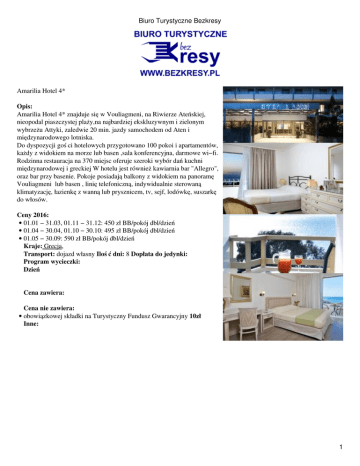 Biuro Turystyczne Bezkresy Amarilia Hotel 4* Opis: Amarilia Hotel 4* znajduje się w Vouliagmeni, na Riwierze Ateńskiej, nieopodal piaszczystej plaży,na najbardziej ekskluzywnym i zielonym wybrzeżu Attyki, zaledwie 20 min. jazdy samochodem od Aten i międzynarodowego lotniska. Do dyspozycji gości hotelowych przygotowano 100 pokoi i apartamentów, każdy z widokiem na morze lub basen ,sala konferencyjna, darmowe wi−fi. Rodzinna restauracja na 370 miejsc oferuje szeroki wybór dań kuchni międzynarodowej i greckiej W hotelu jest również kawiarnia bar "Allegro", oraz bar przy basenie. Pokoje posiadają balkony z widokiem na panoramę Vouliagmeni lub basen , linię telefoniczną, indywidualnie sterowaną klimatyzację, łazienkę z wanną lub prysznicem, tv, sejf, lodówkę, suszarkę do włosów. Ceny 2016: • 01.01 − 31.03, 01.11 − 31.12: 450 zł BB/pokój dbl/dzień • 01.04 − 30.04, 01.10 − 30.10: 495 zł BB/pokój dbl/dzień • 01.05 − 30.09: 590 zł BB/pokój dbl/dzień Kraje: Grecja, Transport: dojazd własny Ilość dni: 8 Dopłata do jedynki: Program wycieczki: Dzień Cena zawiera: Cena nie zawiera: • obowiązkowej składki na Turystyczny Fundusz Gwarancyjny 10zł Inne: 1