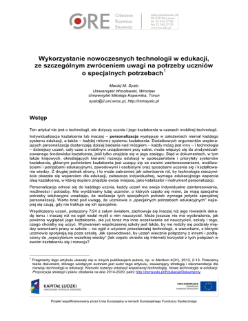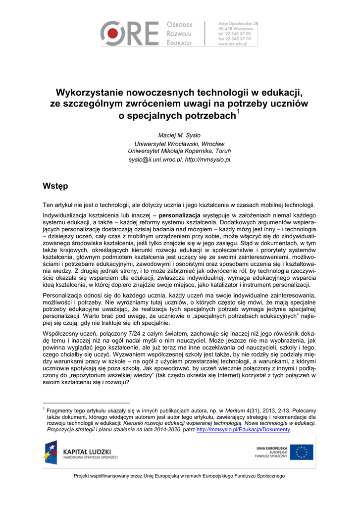 Wykorzystanie nowoczesnych technologii w edukacji, ze szczególnym zwróceniem uwagi na potrzeby uczniów 1 o specjalnych potrzebach Maciej M. Sysło Uniwersytet Wrocławski, Wrocław Uniwersytet Mikołaja Kopernika, Toruń [email protected], http://mmsyslo.pl Wstęp Ten artykuł nie jest o technologii, ale dotyczy ucznia i jego kształcenia w czasach mobilnej technologii. Indywidualizacja kształcenia lub inaczej – personalizacja występuje w założeniach niemal każdego systemu edukacji, a także – każdej reformy systemu kształcenia. Dodatkowych argumentów wspierających personalizację dostarczają dzisiaj badania nad mózgiem – każdy mózg jest inny – i technologia – dzisiejszy uczeń, cały czas z mobilnym urządzeniem przy sobie, może włączyć się do zindywidualizowanego środowiska kształcenia, jeśli tylko znajdzie się w jego zasięgu. Stąd w dokumentach, w tym także krajowych, określających kierunki rozwoju edukacji w społeczeństwie i priorytety systemów kształcenia, głównym podmiotem kształcenia jest uczący się ze swoimi zainteresowaniami, możliwościami i potrzebami edukacyjnymi, zawodowymi i osobistymi oraz sposobami uczenia się i kształtowania wiedzy. Z drugiej jednak strony, i to może zabrzmieć jak odwrócenie ról, by technologia rzeczywiście okazała się wsparciem dla edukacji, zwłaszcza indywidualnej, wymaga edukacyjnego wsparcia ideą kształcenia, w której dopiero znajdzie swoje miejsce, jako katalizator i instrument personalizacji. Personalizacja odnosi się do każdego ucznia, każdy uczeń ma swoje indywidualne zainteresowania, możliwości i potrzeby. Nie wyróżniamy tutaj uczniów, o których często się mówi, że mają specjalne potrzeby edukacyjne uważając, że realizacja tych specjalnych potrzeb wymaga jedynie specjalnej personalizacji. Warto brać pod uwagę, że uczniowie o „specjalnych potrzebach edukacyjnych” najlepiej się czują, gdy nie traktuje się ich specjalnie. Współczesny uczeń, połączony 7/24 z całym światem, zachowuje się inaczej niż jego rówieśnik dekadę temu i inaczej niż na ogół nadal myśli o nim nauczyciel. Może jeszcze nie ma wyobrażenia, jak powinna wyglądać jego kształcenie, ale już teraz ma inne oczekiwania od nauczycieli, szkoły i tego, czego chciałby się uczyć. Wyzwaniem współczesnej szkoły jest także, by nie rodziły się podziały między warunkami pracy w szkole – na ogół z użyciem przestarzałej technologii, a warunkami, z którymi uczniowie spotykają się poza szkołą. Jak spowodować, by uczeń wiecznie połączony z innymi i podłączony do „repozytorium wszelkiej wiedzy” (tak często określa się Internet) korzystał z tych połączeń w swoim kształceniu się i rozwoju? 1 Fragmenty tego artykułu ukazały się w innych publikacjach autora, np. w Meritum 4(31), 2013, 2-13. Polecamy także dokument, którego wiodącym autorem jest autor tego artykułu, zawierający strategię i rekomendacje dla rozwoju technologii w edukacji: Kierunki rozwoju edukacji wspieranej technologią. Nowe technologie w edukacji. Propozycja strategii i planu działania na lata 2014-2020, patrz http://mmsyslo.pl/Edukacja/Dokumenty. Projekt współfinansowany przez Unię Europejską w ramach Europejskiego Funduszu Społecznego 2 Globalność technologii i powodowanych przez nią zmian powoduje, że szkoła i systemy edukacji straciły „granice”, jakimi do niedawna były: „mury” szkoły, dokumenty (podstawy programowe i programy nauczania) i standardy edukacyjne, ramy formalnych i nieformalnych form kształcenia. Pozostawiamy jednak w spokoju szkoły jako budynki i instytucje. Proponowane tutaj mobilne kształcenie może przebiegać niemal w każdym miejscu, również w dzisiejszych klasach w obrębie istniejących szkół. Oczekujemy jedynie, by miejsce uczniów w tych starych murach szkół uwzględniało ich indywidualne predyspozycje i oczekiwania oraz sposoby kształcenia się. Technologia mobilna i mobilne kształcenie W połowie lat 80. XX wieku pojawił się IBM PC – komputer osobisty, ale w szkołach, nawet w krajach zamożnych, liczba uczniów przypadających na jeden komputer stacjonarny dość wolno zmierza do 1. Szybki rozwój technologii w tym wieku spowodował wzrost nasycenia komputerami i urządzeniami elektronicznymi, które zaczęły przejmować funkcje komputerów. Wiele tych urządzeń pozostaje w rękach uczniów przez 24/7 i z tymi urządzeniami przychodzą oni do szkoły. Aby jednak te mobilne urządzenia mogły stanowić pomoc dydaktyczną powinny być częścią rozwiązania, które określamy mianem edukacyjnej technologii mobilnej, lub krócej technologii mobilnej, która posłuży do realizacji kształcenia mobilnego (lub inaczej, kształcenia odmiejscowionego), czyli takiego, które może przebiegać w dowolnym czasie (anytime) i w dowolnym miejscu (anywhere), w którym uczniowie i nauczyciele chcieliby kontynuować kształcenie, może to być miejsce w szkole, rodzinny dom, lub inne miejsca. Dodatkowo będziemy wymagać, by kształcenie z indywidualnymi urządzeniami przenośnymi umożliwiało personalizację. Urządzenia mobilne to jednak tylko część edukacyjnej technologii mobilnej, na którą składają się cztery elementy: 1. urządzenia mobilne (przenośne) o funkcji komputera z bezprzewodowym dostępem do Internetu; urządzenia takie umożliwiają korzystanie z Internetu, jeśli tylko w ich zasięgu jest dostęp; 2. bezprzewodowy dostęp do Internetu – w wielu miejscach w szkole, jak również w domach uczniów, dostęp do Internetu może być również przewodowy; 3. wirtualne środowisko kształcenia – to najważniejszy element technologii mobilnej – służy do organizacji procesu kształcenia i przechowywania indywidualnych zasobów uczniów i nauczycieli i jest dostępne w każdej chwili z dowolnego miejsca, w którym jest dostęp do Internetu; szczególnym przypadkiem takiego środowiska jest platforma e