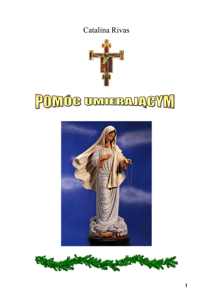 Catalina Rivas 1 ŚWIADECTWO CATALINY RIVAS - OPIS ŚMIERCI JEJ MAMY Oto co widziała Catalina Rivas: spprraaw maam myy””.. „s waa ddoottyycczzyy cchhw wiillii śśm miieerrccii jjeejj ddrrooggiieejj zziieem msskkiieejj m Dziesięć dni po śmierci mojej mamy, kiedy kończyłam poranną modlitwę, Jezus poprosił mnie, abym pozostała jeszcze kilka minut w pokoju. Nagle, jak w filmie, przed moimi oczami przesunęły się sceny, które się wówczas wydarzyły. OSTATNIA DROGA Mama leżała w swoim łóżku. Właśnie z bratem położyliśmy ją na prawym boku. Kiedy wycierałam krew, która leciała jej z nosa, skierowała wzrok ponad moją głowę, w kierunku okna. Chwyciła mocno moją rękę i powiedziała: Chcę, abyś została ze mną. - Boisz się, mamo? - zapytałam ją zaniepokojona. - Nie, nie boję się, ale chcę, abyś została ze mną. W tym momencie zobaczyłam ludzi, którzy stanęli za nami, po prawej stronie chorej. Rozpoznałam św. Józefa, św. Antoniego Padewskiego, św. Różę z Limy, św. Dominika Guzma i św. Sylwestra. Obok nich stał przystojny młodzieniec „Leopold" - Anioł Stróż mamy. Modlił się na klęczkach i jednocześnie czule głaskał chorą po głowie. Modlili się także inni zebrani: mężczyźni i kobiety, młodzi i starzy, około 40 osób. Jeden z młodych mężczyzn, ubrany w białą albę, trzymał w rękach małą, złotą czaszę i czynił coś na kształt kadzenia - wkładał ręce w misę i wydobyty w ten sposób dym kierował ku górze. Tym gestem sprawiał wrażenie, że przeszkadza złym duchom zbliżyć się do umierającej. Młody mężczyzna poruszał ustami, jakby odmawiał jakąś modlitwę. Potem przełożył naczynie do drugiej ręki i ponownie wykonał gest przypominający kadzenie. Chodził dookoła wszystkich osób zgromadzonych wokół łóżka. Byłam zaskoczona tak dużą liczbą zebranych. Jezus zwrócił się do mnie i wyjaśnił mi: To są jej święci patronowie oraz dusze, którym pomogła osiągnąć zbawienie poprzez swoje modlitwy i cierpienia. Przybyli teraz towarzyszyć jej w ostatniej drodze, choć nawet ich nie znała. Kiedy położyliśmy mamę na drugim boku, by ją przebrać, powiedziała: Już czas, abym z nimi poszła i spojrzała przez moje ramię. Zaśpiewaliśmy psalm, a ona powtarzała za nami. Z jej oczu można było wyczytać zdumienie, tak jakby kontemplowała coś, czego nie sposób wyrazić słowami. Poprosiła, abyśmy włączyli światło. Zrobiliśmy tak, choć wiedzieliśmy, że jej spojrzenie wykracza już poza ziemskie granice. Ścisnęła mocno moją dłoń i powiedziała: Święty Boże, teraz!... Święty Boże... teraz! Pomyślałam, że chce mnie w ten sposób zachęcić do powtarzania krótkiej modlitwy: „Święty Boże, Święty Mocny, Święty a Nieśmiertelny, zmiłuj się nad nami i nad całym światem”! Wypowiedziała kilkakrotnie słowa tej modlitwy, a po chwili rzekła naglącym głosem: Muszę już iść... Zaczęła poruszać nogami, tak jakby gdzieś szła i na koniec zawołała: Nie zatrzymujcie mnie! Po czym jeszcze raz powtórzyła Święty Boże, Święty Mocny.... zmiłuj się nade mną i nad całym światem. Wspólnie z wszystkimi bliskimi, którzy zebrali się w ostatniej godzinie wokół mamy, odmawialiśmy 2 koronkę do Bożego Miłosierdzia. W tym czasie konająca zanosiła własne modlitwy, z naciskiem powtarzając: Ojcze, mojego ducha! Teraz! ... Teraz! ... Zaczęliśmy więc mówić: „Ojcze, w Twoje ręce powierzam mojego ducha”, wierząc, iż to właśnie zdanie mama chciała powiedzieć. Powtórzyła nasze słowa, dając do zrozumienia, że dobrze odczytaliśmy jej intencje. Zobaczyłam, że za nami, po lewej stronie chorej, zjawiła się inna grupa osób. Wśród nich rozpoznałam mojego ojca, jedną z babć, ciocię, która mieszkała z nami. Przybyli też inni ludzie, ale ich twarzy nie widziałam wyraźnie. Byłam oszołomiona tym, co zobaczyłam, ale jednocześnie starałam się skupić na mamie. Nagle światło padło przed nią i zobaczyłam chór Aniołów, którzy śpiewając, schodzili z wysokości niebieskich. Ustawili się w dwóch rzędach, a kiedy zbliżyli się do nas, rozdzielili się, tworząc krąg wokół zebranych. Była to bardzo uroczysta chwila. W tym momencie mama powiedziała, jakby zwracając się do osób, które przybyły towarzyszyć jej w ostatniej drodze: Poczekajcie, muszę najpierw zobaczyć Matkę Bożą! Mój brat powiedział: Mamo, Jezus jest tutaj. Czeka już na ciebie... Powiedział tak, ponieważ wcześniej mama wspomniała, że widzi Jezusa. Odpowiedziała: Muszę jeszcze zobaczyć Maryję. Wiele razy słyszała bowiem, że Maryja przychodzi po dusze tych, którzy w godzinie śmierci odmawiają różaniec. Podaliśmy mamie obrazek Matki Bożej Wspomożenia Wiernych, myśląc, że o to właśnie prosiła. Nagle powiedziała: Widzę Ją tam; jest tam... uciekajmy się do Mamity (Mamusi)! Musimy prosić Ją o przebaczenie... Czułe objęcie Matki Bożej W tym momencie zobaczyłam Matkę Bożą schodzącą z niebios. Unosząc się nad ziemią, stanęła na wysokości stóp umierającej. Zobaczyłam, jak Maryja wyciąga swoje ręce w kierunku chorej. Mama także wyciągnęła swoje tak, jakby chciała otrzymać coś lub dotknąć czegoś. Matka Boża podała jej rękę. Wówczas mama straciła świadomość, a po chwili oddała ostatnie tchnienie. Kiedy jeszcze głowa zmarłej opierała się na moich rękach, pomyślałam, że całe widzenie zaraz zniknie. Byłam jednak świadkiem, jak nagle dusza mamy oddziela się od ciała i unosi nad ziemią. Następnie zbliżyła się do Matki Bożej, która wręczyła jej białą suknię, dopasowując rozmiar do koszuli nocnej, którą mama miała na sobie. Zobaczyłam natychmiast mamę ubraną w tę sukienkę. Twarz Maryi wyrażała wielka łagodność. Uśmiechnęła się i objęła mamę. Ta także 3 uściskała Matkę Bożą i oparła swą głowę na Jej ramieniu. Na 