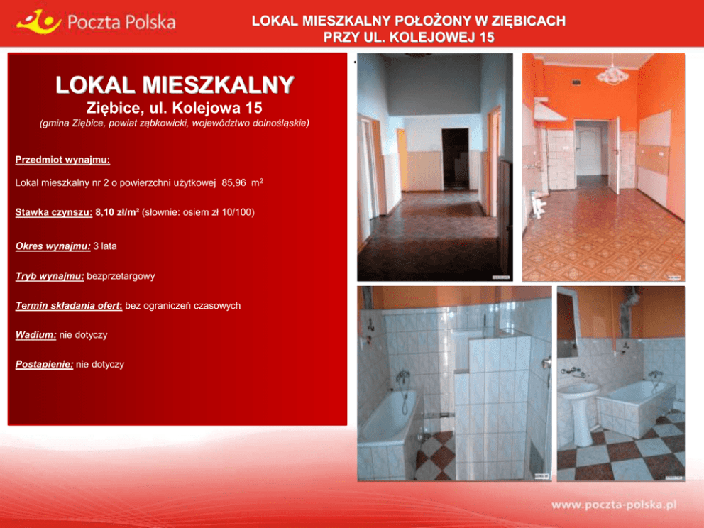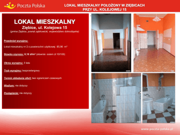 LOKAL MIESZKALNY POŁOŻONY W ZIĘBICACH PRZY UL. KOLEJOWEJ 15 - LOKAL MIESZKALNY Ziębice, ul. Kolejowa 15 (gmina Ziębice, powiat ząbkowicki, województwo dolnośląskie) Przedmiot wynajmu: Lokal mieszkalny nr 2 o powierzchni użytkowej 85,96 m2 Stawka czynszu: 8,10 zł/m² (słownie: osiem zł 10/100) Okres wynajmu: 3 lata Tryb wynajmu: bezprzetargowy Termin składania ofert: bez ograniczeń czasowych Wadium: nie dotyczy Postąpienie: nie dotyczy • Zdjęcie przedmiotu wynajmu Kliknij i zlokalizuj na mapie Opis przedmiotu wynajmu: Lokal mieszkalny usytuowany jest na I piętrze budynku stanowiącego własność Poczty Polskiej S.A. Składa się z przedpokoju, kuchni, łazienki z wc i 3-ch pokoi. Lokal wyposażony jest w instalacje: elektryczną, wodno kanalizacyjną, gazową, domofonową i centralnego ogrzewania - wspólna kotłownia zlokalizowana w piwnicy. Niezależnie od czynszu Najemca będzie ponosił opłaty za wodę, nieczystości płynne, gospodarowanie odpadami komunalnymi oraz centralnego ogrzewania. Opis nieruchomości: Miejscowość Ziębice Ulica, nr budynku Kolejowa 15 Powierzchnia budynku, w którym zlokalizowany jest przedmiot wynajmu 906,00 m² Nr działki ewidencyjnej, obręb 755 0001, ZACHÓD Księga wieczysta, Sąd Rejonowy, Nr Wydziału SW1Z / 00049111 / 7 Stan prawny gruntu Własność Skarbu Państwa w użytkowaniu wieczystym Poczty Polskiej S.A. Lokalizacja i dostępność komunikacyjna: Nieruchomość położona jest w Ziębicach przy ul. Kolejowej 15, obręb 0001 Zachód. Miasto położone w województwie dolnośląskim w powiecie ząbkowickim, siedziba gminy miejsko - wiejskiej na stokach Góry Piaskowej na południowo - wschodnich granicach historycznego centrum Ziębic. To urocze miasteczko z burzliwą, prawie 800-letnią historią, której świadectwem są cenne zabytki architektury. • Mapa sytuacyjna miejscowości Opis nieruchomości: Nieruchomość ewidencyjnie oznaczona nr 755 o powierzchni 906,00 m² obręb nr 0001 Zachód, dla której Sąd Rejonowy V Wydział Ksiąg Wieczystych w Ząbkowicach Śl. prowadzi księgę wieczystą o nr SW1Z/00049111/7. Przedmiotowa nieruchomość gruntowa jest własnością Skarbu Państwa w użytkowaniu wieczystym Poczty Polskiej S.A. • Zdjęcia budynków • Zdjęcia nieruchomości OBWIESZCZENIE O NAJMIE LOKALU MIESZKALNEGO Wynajmujący: Poczta Polska S.A. z siedzibą w Warszawie, 00-940 Warszawa, ul. Rodziny Hiszpańskich 8. Prowadzący postępowanie: Poczta Polska S.A., Pion Infrastruktury Obszar Operacyjny ds. Nieruchomości we Wrocławiu, ul. Awicenny 21, 50 -900 Wrocław. Miejsce składania ofert: Poczta Polska S.A., Pion Infrastruktury Obszar Operacyjny ds. Nieruchomości we Wrocławiu, ul. Awicenny 21, 50 -900 Wrocław –pokój Nr 102. Okres trwania umowy - 3 lata. Przedmiot najmu: Lokal mieszkalny Nr 2 usytuowany na I piętrze budynku Poczty Polskiej S.A w miejscowości Ziębice przy ul. Kolejowej 15, powierzchni użytkowej 85,96 m². Składający się z przedpokoju, kuchni, łazienki z wc i 3 pokoi. Wyposażony jest w instalację wodno - kanalizacyjną, elektryczną, domofonową, gazową i centralnego ogrzewania. Wywoławcza stawka czynszu – 8,10 zł/m² (słownie: osiem zł 10/00 za 1 metr kwadratowy powierzchni mieszkalnej netto miesięcznie) Stawka czynszu nie obejmuje opłat eksploatacyjnych za energię elektryczna, centralne ogrzewanie, gazu, zużycia wody, odprowadzenia ścieków oraz wywóz nieczystości stałych Wadium: nie dotyczy. Termin składania ofert: bez ograniczeń czasowych. Warunkiem przystąpienia do konkursu ofert: - złożenie pisemnej oferty zawierającej dane Oferenta oraz proponowaną stawkę czynszu za najem 1 m2 powierzchni lokalu mieszkalnego. Oferty należy składać w zamkniętych kopertach w siedzibie prowadzącego przetarg (pokój 102) z dopiskiem: „Oferta na najem lokalu mieszkalnego Nr 2 w Ziębicach, ul. Kolejowa 15”, - złożenie przez Oferenta oświadczenia o zapoznaniu się z treścią obwieszczenia o wynajmie lokalu mieszkalnego, ze stanem technicznym lokalu przeznaczonego do wynajmu, a także z treścią projektu umowy najmu oraz przyjęciu ich bez zastrzeżeń. Do oświadczenia należy dołączyć kserokopię dowodu osobistego, - w przypadku złożenia oferty przez jednego z małżonków, konieczne jest przedłożenie pisemnego wyrażenia zgody współmałżonka na złożenie oferty z zamiarem najmu lokalu mieszkalnego będącego przedmiotem ogłoszenia, ze środków pochodzących z majątku wspólnego, - w przypadku osób prawnych i jednostek organizacyjnych nieposiadających osobowości prawnej, osoba reprezentująca biorąca udział w przetargu zobowiązana jest do okazania dowodu osobistego oraz odpowiednich jednostek w postępowaniu przetargowym. Okres wiązania oferty wynosi 60 dni od dnia złożenia oferty . Szczegółowych informacji w sprawie najmu (udostępnianie projektu umowy najmu) udziela w dni powszednie w godz. 8.00-14.00 – Krzysztof Karolczyk, tel. 74 842 58 86; ze wskazaną osobą można uzgodnić również termin oglądu lokalu mieszkalnego. POCZTA POLSKA S.A. ZASTRZEGA SOBIE PRAWO UNIEWAŻNIENIA PRZETARGU W KAŻDYM CZASIE BEZ PODANIA PRZYCZYN I PONOSZENIA SKUTKÓW PRAWNYCH I FINANSOWYCH Z TEGO TYTUŁU. Formularz złożenia oferty Dotyczy wynajmu części nieruchomości: Lokal mieszkalny o powierzchni użytkowej 59,36 m2 usytuowany na dwóch poziomach w budynku PP SA w miejscowości Ziębice przy ulicy Kolejowej 15. Czas trwania umowy najmu – 3 lata Proponowana stawka czynszu: ………………… zł/m² Dane Oferenta: Imię i nazwisko/Firma: …………………………………………………………………………………………………………………………………….…… Adres zamieszkania/Adres Firmy: …………………………………………………………………………………………………………………………… …………………………………………………………