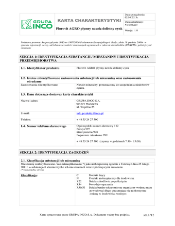 Data sporządzenia: 02.04.2013r. KARTA CHARAKTERYSTYKI Florovit AGRO płynny nawóz dolistny cynk Data aktualizacji: Nie dotyczy Wersja: 1.0 Podstawa prawna: Rozporządzenie (WE) nr 1907/2006 Parlamentu Europejskiego i Rady z dnia 18 grudnia 2006r w sprawie rejestracji, oceny, udzielania zezwoleń i stosowanych ograniczeń w zakresie chemikaliów (REACH) z późniejszymi zmianami SEKCJA 1: IDENTYFIKACJA SUBSTANCJI / MIESZANINY I IDENTYFIKACJA PRZEDSIĘBIORSTWA 1.1. Identyfikator produktu Florovit AGRO płynny nawóz dolistny cynk 1.2. Istotne zidentyfikowane zastosowania substancji lub mieszaniny oraz zastosowania odradzane Zastosowania zidentyfikowane: Nawóz mineralny, przeznaczony do uzupełniania niedoborów cynku. 1.3. Dane dotyczące dostawcy karty charakterystyki Nazwa i adres: GRUPA INCO S.A. 00-519 Warszawa ul. Wspólna 25 E-mail: [email protected] Telefon: + 48 55 24 27 500 1.4. Numer telefonu alarmowego Ogólnopolski numer alarmowy 112 Policja 997 Straż pożarna 998 Pogotowie ratunkowe 999 + 48 55 24 27 500 (czynny w godzinach 7.30 - 15.00) SEKCJA 2: IDENTYFIKACJA ZAGROŻEŃ 2.1. Klasyfikacja substancji lub mieszaniny Mieszaninę zaklasyfikowano / nie zaklasyfikowano(*) jako niebezpieczną zgodnie z Ustawą z dnia 25 lutego 2011r. o substancjach chemicznych i ich mieszaninach wraz z późniejszymi zmianami. (*) niepotrzebne skreślić Klasyfikacja: C N R22 R34 R50/53 Produkt żrący Produkt niebezpieczny dla środowiska Działa szkodliwie po połknięciu Powoduje oparzenia Działa bardzo toksycznie na organizmy wodne; może powodować długo utrzymujące się niekorzystne zmiany w środowisku wodnym Karta opracowana przez GRUPA INCO S.A. Dokument ważny bez podpisu. str.1/12 Data sporządzenia: 02.04.2013r. KARTA CHARAKTERYSTYKI Florovit AGRO płynny nawóz dolistny cynk 2.2. Elementy oznakowania Data aktualizacji: Nie dotyczy Wersja: 1.0 Piktogramy określające rodzaj zagrożenia: Produkt żrący Produkt niebezpieczny dla środowiska Zwrot(y) R: R22 Działa szkodliwie po połknięciu R34 Powoduje oparzenia R50/53 Działa bardzo toksycznie na organizmy wodne; może powodować długo utrzymujące się niekorzystne zmiany w środowisku wodnym Zwrot(y) S: S1/2 Przechowywać pod zamknięciem i chronić przed dziećmi S26 Zanieczyszczone oczy przemyć natychmiast dużą ilością wody i zasięgnąć porady lekarza S36/37/39 Nosić odpowiednią odzież ochronną, odpowiednie rękawice ochronne i okulary lub ochronę twarzy S45 W przypadku awarii lub jeżeli źle się poczujesz, niezwłocznie zasięgnij porady lekarza – jeżeli to możliwe, pokaż etykietę S62 W razie połknięcia nie wywoływać wymiotów: niezwłocznie zasięgnąć porady lekarza i pokazać opakowanie lub etykietę 2.3. Inne zagrożenia Nie są znane Karta opracowana przez GRUPA INCO S.A. Dokument ważny bez podpisu. str.2/12 Data sporządzenia: 02.04.2013r. KARTA CHARAKTERYSTYKI Florovit AGRO płynny nawóz dolistny cynk Data aktualizacji: Nie dotyczy Wersja: 1.0 SEKCJA 3: SKŁAD / INFORMACJA O SKŁADNIKACH 3.1. Substancje Nie ma zastosowania, produkt jest mieszaniną 3.2. Mieszaniny Nazwa substancji / numer indeksowy Chlorek cynku/ 030-003-00-2 Nr WE CAS Stężenie rejestracji Brak, 231- 7646< 50% substancja 592-0 85-7 odzyskana w UE, zwolniona na mocy Art. 2 ust. 7 lit. d) Rozporządz enia REACH Ograniczenia i zezwolenia dotyczące Nie dotyczy substancji: Klasyfikacja Klasyfikacja Dyr.67/548/EWG Rozp.1272/2008 C R34 Acute Tox. 4 H302 R22 Skin Corr. 1B H314 N R50/53 Aquatic Acute 1 H400 Aquatic Chronic 1 H410 STOT SE 3a H335 SEKCJA 4: ŚRODKI PIERWSZEJ POMOCY 4.1. Opis środków pierwszej pomocy Wdychanie: Usunąć poszkodowanego z miejsca narażenia. Zapewnić dostęp do świeżego powietrza. W przypadku problemów z oddychaniem wezwać pomoc medyczną. Kontakt ze skórą: Zdjąć skażone ubranie. Oczyścić mechanicznie skażoną skórę, przemyć dużą ilością wody z mydłem, a następnie spłukać wodą. Nie używać żadnych rozpuszczalników. W przypadku wystąpienia podrażnień lub takich objawów jak zawroty głowy lub omdlenia niezwłocznie skontaktować się z lekarzem. Kontakt z oczami: Natychmiast płukać duża ilością wody przez co najmniej 15 minut, przy szeroko rozwartych powiekach. Usunąć szkła kontaktowe. Unikać silnego strumienia wody ze względu na ryzyko mechanicznego uszkodzenia rogówki. Zwrócić się o pomoc medyczną. Spożycie: Niezwłocznie zasięgnąć porady lekarza. Nie wywoływać wymiotów. Płukanie ust i podanie wody możliwe jedynie w przypadku jeżeli poszkodowany jest przytomny. Jeżeli poszkodowany jest nieprzytomny, upewnić się czy drogi oddechowe są drożne i ułożyć go w pozycji bocznej ustalonej. Informacje dla lekarza: Przedstawić lekarzowi Kartę Charakterystyki wyrobu. Karta opracowana przez GRUPA INCO S.A. Dokument ważny bez podpisu. str.3/12 Data sporządzenia: 02.04.2013r. KARTA CHARAKTERYSTYKI Florovit AGRO płynny nawóz dolistny cynk Konieczna jest natychmiastowa pomoc lekarska: w przypadku spożycia i kontaktu z oczami Istnieje możliwość wystąpienia opóźnionych skutków narażenia: Zalecane jest przeniesienie narażonej osoby z miejsca narażenia na świeże powietrze: Zalecane jest zdjęcie osobie poszkodowanej zanieczyszczonej odzieży i butów: Zalecane indywidualne wyposażenie ochronne dla osób udzielających pierwszej pomocy: 4.2. Najważniejsze ostre i opóźnione objawy oraz skutki narażenia: 4.3. Wskazania dotyczące natychmiastowej pomocy lekarskiej i szczególnego postępowania z poszkodowanym: x tak □ nie □ brak danych x tak □ nie □ brak danych x tak □ nie □ brak danych x tak □ nie □ brak danych Data aktualizacji: Nie dotyczy Wersja: 1.0 W zależności od sposobu narażenia nosić: ubranie ochronne, maski przeciwpyłowe, rękawice ochronne, gogle ochronne. Oczy: Przy wystąpieniu skażenia oczu możliwe wystąpienie podrażnienia lub zapalenie spojówek. Skóra: U osób podatnych na alergię może powod