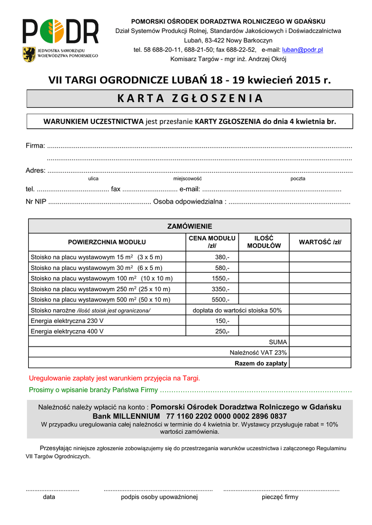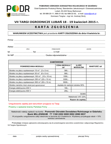POMORSKI OŚRODEK DORADZTWA ROLNICZEGO W GDAŃSKU Dział Systemów Produkcji Rolnej, Standardów Jakościowych i Doświadczalnictwa Lubań, 83-422 Nowy Barkoczyn tel. 58 688-20-11, 688-21-50; fax 688-22-52, e-mail: [email protected] Komisarz Targów - mgr inż. Andrzej Okrój VII TARGI OGRODNICZE LUBAŃ 18 - 19 kwiecień 2015 r. KARTA ZGŁOSZENIA WARUNKIEM UCZESTNICTWA jest przesłanie KARTY ZGŁOSZENIA do dnia 4 kwietnia br. Firma: ................................................................................................................................................................ ................................................................................................................................................................ Adres: ................................................................................................................................................................ miejscowość ulica poczta tel. ...................................... fax ............................. e-mail: ......................................................................... Nr NIP ...................................................... Osoba odpowiedzialna : ................................................................ ZAMÓWIENIE POWIERZCHNIA MODUŁU CENA MODUŁU /zł/ Stoisko na placu wystawowym 15 m 2 (3 x 5 m) Stoisko na placu wystawowym 30 m2 Stoisko na placu wystawowym 100 m2 WARTOŚĆ /zł/ 380,- (6 x 5 m) 580,- (10 x 10 m) 1550,- Stoisko na placu wystawowym 250 m 2 (25 x 10 m) 3350,- Stoisko na placu wystawowym 500 m2 (50 x 10 m) 5500,- Stoisko narożne /ilość stoisk jest ograniczona/ ILOŚĆ MODUŁÓW dopłata do wartości stoiska 50% Energia elektryczna 230 V 150,- Energia elektryczna 400 V 250,SUMA Należność VAT 23% Razem do zapłaty Uregulowanie zapłaty jest warunkiem przyjęcia na Targi. Prosimy o wpisanie branży Państwa Firmy ………………………………………………………………………… Należność należy wpłacić na konto : Pomorski Ośrodek Doradztwa Rolniczego w Gdańsku Bank MILLENNIUM 77 1160 2202 0000 0002 2896 0837 W przypadku uregulowania całej należności w terminie do 4 kwietnia br. Wystawcy przysługuje rabat = 10% wartości zamówienia. Przesyłając niniejsze zgłoszenie zobowiązujemy się do przestrzegania warunków uczestnictwa i załączonego Regulaminu VII Targów Ogrodniczych. ............................... data ............................................................... podpis osoby upoważnionej ................................................................... pieczęć firmy