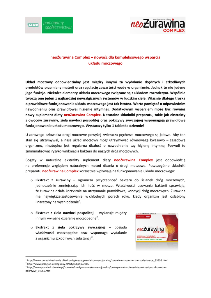 neoŻurawina Complex – nowość dla kompleksowego wsparcia układu moczowego Układ moczowy odpowiedzialny jest między innymi za wydalanie zbędnych i szkodliwych produktów przemiany materii oraz regulację zawartości wody w organizmie. Jednak to nie jedyne jego funkcje. Niektóre elementy układu moczowego związane są z układem rozrodczym. Wspólnie tworzą one jeden z najbardziej newralgicznych systemów w ludzkim ciele. Właśnie dlatego troska o prawidłowe funkcjonowanie układu moczowego jest tak istotna. Warto pamiętać o odpowiednim nawodnieniu oraz prawidłowej higienie intymnej. Dodatkowym wsparciem może być również nowy suplement diety neoŻurawina Complex. Naturalne składniki preparatu, takie jak ekstrakty z owoców żurawiny, ziela nawłoci pospolitej oraz pokrzywy zwyczajnej wspomagają prawidłowe funkcjonowanie układu moczowego. Wystarczy tylko 1 tabletka dziennie! U zdrowego człowieka drogi moczowe powyżej zwieracza pęcherza moczowego są jałowe. Aby ten stan się utrzymywał, a nasz układ moczowy mógł utrzymywać równowagę kwasowo – zasadową organizmu, niezbędna jest regularna dbałość o nawodnienie czy higienę intymną. Pozwoli to zminimalizować ryzyko wniknięcia bakterii do naszych dróg moczowych. Bogaty w naturalne ekstrakty suplement diety neoŻurawina Complex jest odpowiedzią na preferencje względem naturalnych metod dbania o drogi moczowe. Poszczególne składniki preparatu neoŻurawina Complex korzystnie wpływają na funkcjonowanie układu moczowego: o Ekstrakt z żurawiny – ogranicza przyczepność bakterii do ścianek dróg moczowych, jednocześnie zmniejszając ich ilość w moczu. Właściwości usuwania bakterii sprawiają, że żurawina działa korzystnie na utrzymanie prawidłowej kondycji dróg moczowych. Żurawina ma największe zastosowanie w chłodnych porach roku, kiedy organizm jest osłabiony i narażony na wychłodzenie1. o Ekstrakt z ziela nawłoci pospolitej – wykazuje między innymi wyraźne działanie moczopędne2. o Ekstrakt z ziela pokrzywy zwyczajnej – posiada właściwości moczopędne oraz wspomaga wydalanie z organizmu szkodliwych substancji3. 1 http://www.poradnikzdrowie.pl/zdrowie/medycyna-niekonwencjonalna/zurawina-na-pecherz-wrzody-i-serce_33955.html http://www.przeglad-urologiczny.pl/artykul.php?2206 3 http://www.poradnikzdrowie.pl/zdrowie/medycyna-niekonwencjonalna/pokrzywa-wlasciwosci-lecznicze-i-prozdrowotnepokrzywy_34065.html 2 Przestrzeganie takich zasad jak: picie dużej ilości płynów, wypróżnianie pęcherza przed snem oraz prawidłowa higiena intymna pomagają w prawidłowym funkcjonowaniu układu moczowego. W sytuacjach, w których nasz organizm potrzebuje dodatkowego wsparcia, możemy zastosować suplementy diety, takie jak neoŻurawina Complex. Unikalnie dobrane, naturalne składniki preparatu kompleksowo pomogą zadbać o prawidłowe funkcjonowanie układu moczowego. Informacje o produkcie: neoŻurawina Complex to suplement diety przeznaczony dla osób dbających o układ moczowy. Zawiera w jednej tabletce ekstrakt z owoców żurawiny wielkoowocowej, standaryzowany na zawartość 40% proantocyjanidyn (PAC), ekstrakt z ziela nawłoci pospolitej oraz ekstrakt z ziela pokrzywy zwyczajnej. Zalecana do spożycia dzienna porcja: 1 tabletka Sugerowana cena detaliczna dla pacjenta: 30 tabletek: 20,60 zł 60 tabletek: 24,50 zł Składniki Ekstrakt z owoców żurawiny (Vaccinium macrocarpon) standaryzowany na zawartość 40% proantocyjanidyn (PAC) Zawartość w 1 tabletce 90 mg (36 mg PAC) Ekstrakt z ziela nawłoci pospolitej (Solidago virgaurea) 54 mg Ekstrakt z ziela pokrzywy (Utrica dioica) 47 mg Więcej informacji udziela: Katarzyna Pęcherska Kierownik ds. Komunikacji Produktu Teva Pharmaceuticals Polska Sp. z o.o. [email protected]; tel. 695 363 585 www.teva.pl oraz Milena Obrostek Hill+Knowlton Strategies [email protected]; tel. 605 120 539 Teva Pharmaceutical Industries Ltd. (NYSE: TEVA) jest wiodącą globalną firmą farmaceutyczną, której celem jest zwiększanie dostępu do wysokiej jakości opieki medycznej poprzez rozwój, produkcję oraz sprzedaż leków generycznych oferowanych po przystępnych cenach, jak również innowacyjnych i specjalistycznych produktów farmaceutycznych i substancji czynnych leków. Teva z siedzibą w Izraelu oraz z bezpośrednimi przedstawicielstwami w blisko 60 krajach jest największym na świecie producentem leków generycznych z portfelem produktów zawierającym ponad 1 000 cząsteczek. Działalność związana z produkcją leków innowacyjnych koncentruje się na takich obszarach terapeutycznych jak neurologia, onkologia, leczenie bólu, choroby układu oddechowego i zdrowie kobiet, a także biofarmaceutyki. Teva zatrudnia obecnie blisko 46 000 pracowników na całym świecie, a jej wartość przychodów ze sprzedaży netto w 2012 roku wyniosła 20,3 mld USD. PO/NEOZ/15/0012