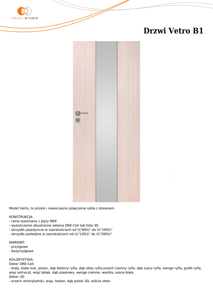 Drzwi Vetro B1 Model Verto, to proste i nowoczesne połączenie szkła z drewnem. KONSTRUKCJA: - rama wykonana z płyty MDF - wykończenie obustronne okleina DRE-Cell lub folia 3D - skrzydło pojedyncze w szerokościach od \\\"60\\\" do \\\"100\\\" - skrzydło podwójne w szerokościach od \\\"120\\\" do \\\"200\\\" WARIANT: - przylgowe - bezprzylgowe KOLORYSTYKA: Dekor DRE-Cell - biały, biała mat, jesion, dąb bielony ryfla, dąb złoty ryfla,orzech ciemny ryfla, dąb szary ryfla, wenge ryfla, grafit ryfla, wiąz antracyt, wiąz tabak, dąb piaskowy, wenge ciemne, wanilia, sosna biała Dekor 3D - orzech amerykański, wiąz, heban, dąb polski 3D, wiśnia złota SZYBY: - wzór i wariant zgodnie z katalogiem
